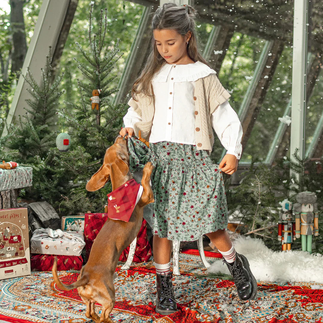Midi skirt in green color with frosted flower print pattern, made of a soft and light viscose, comfortable in every way. A voluminous skirt with ruffle and gathers, your mini will love the fluidity of this garment and can not help but twirl on herself!