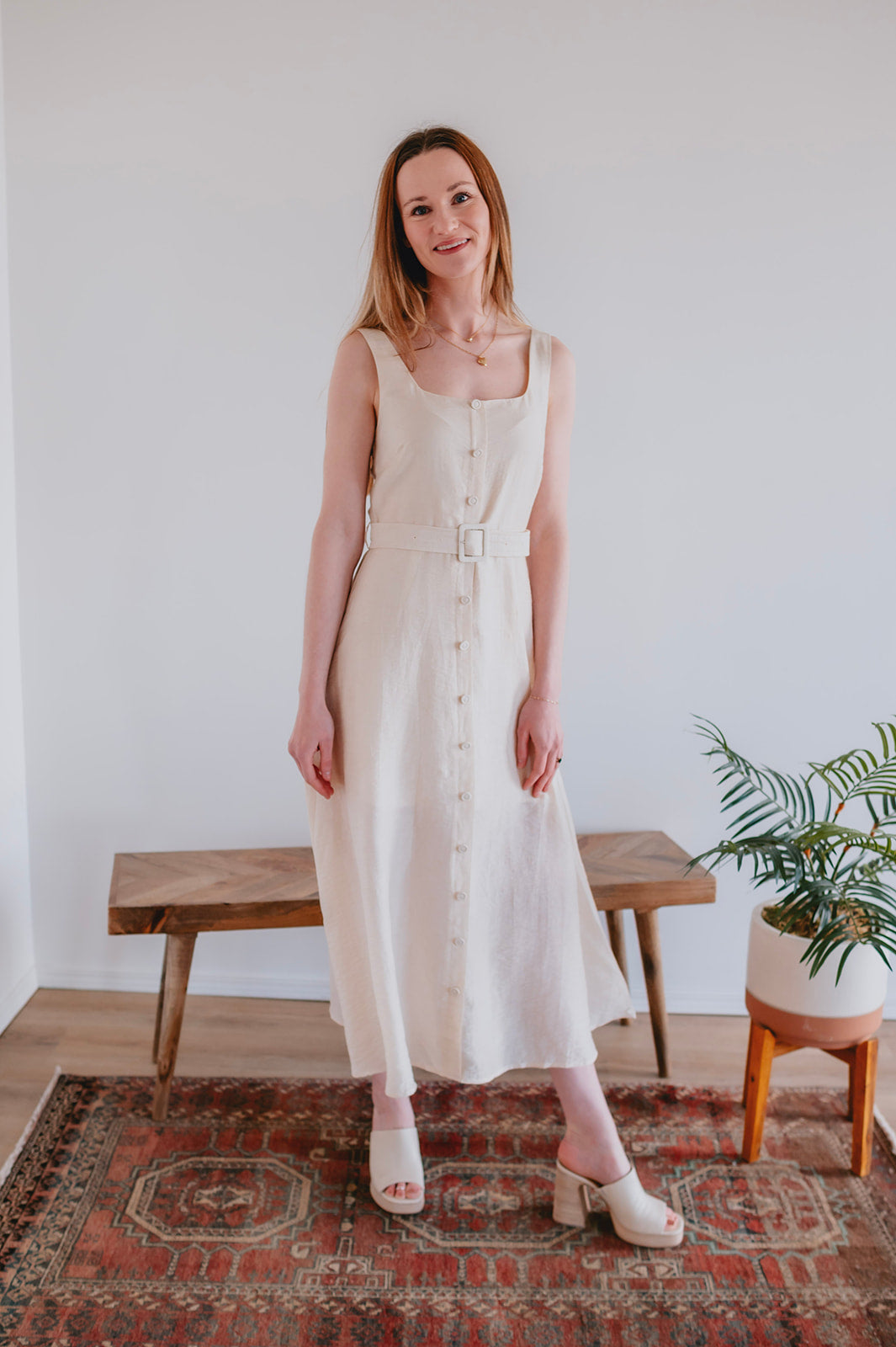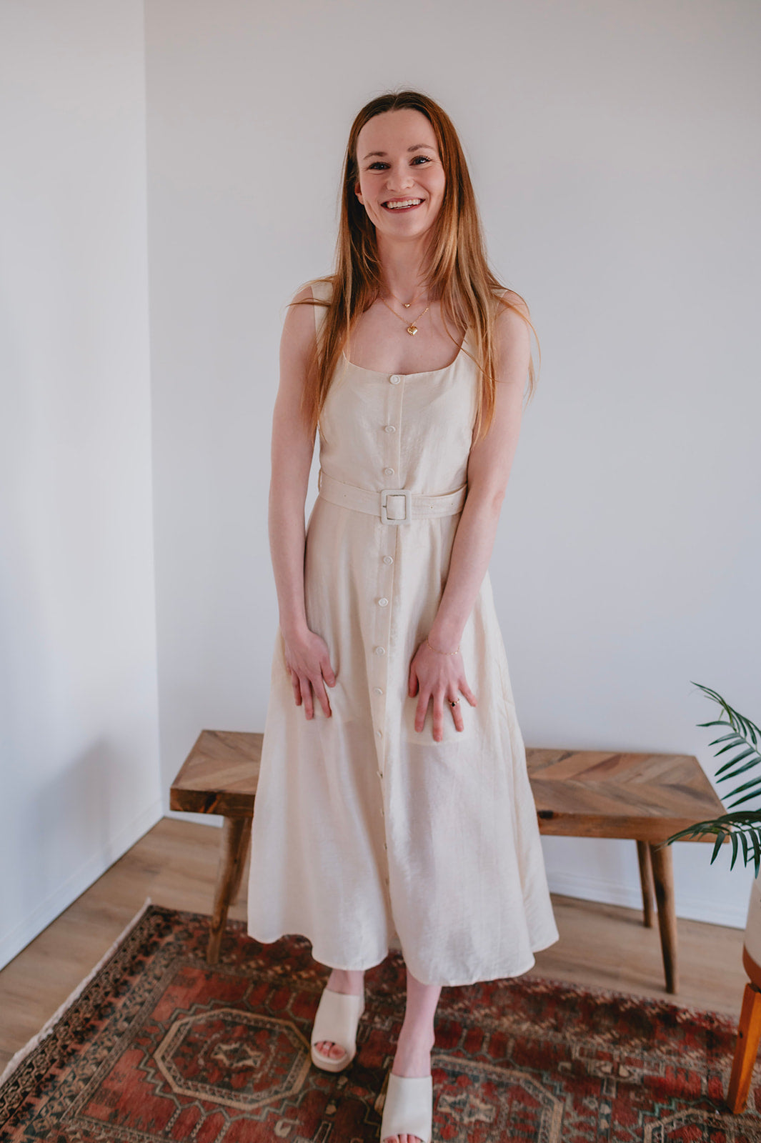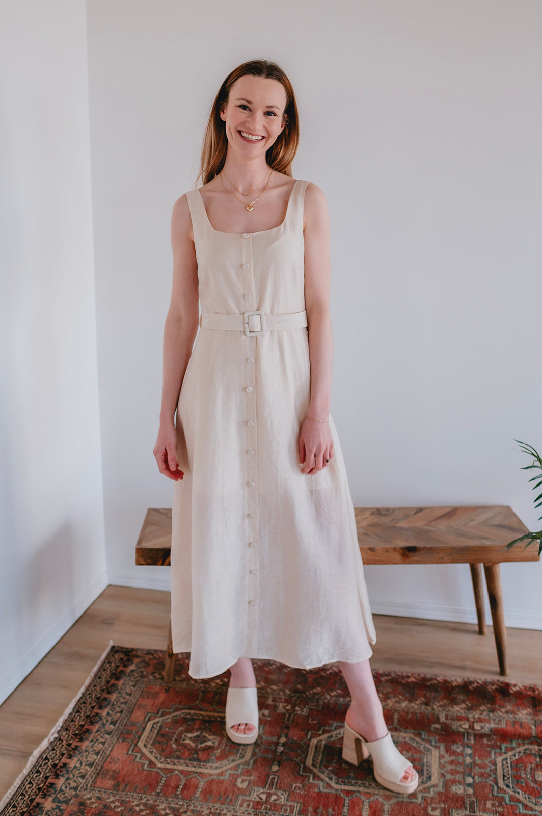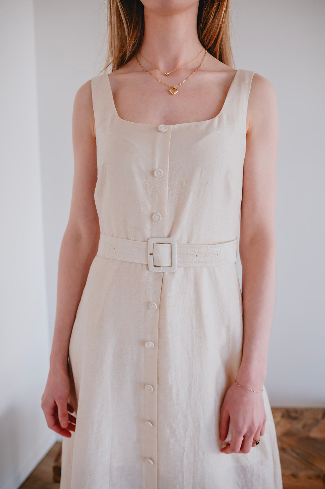 FRNCH took your favourite parts about a classic trench coach and reimagined them into this very classy and feminine dress. Wide shoulder straps, button front, belted waist and aline silhouette come together making the perfect Spring dress.
