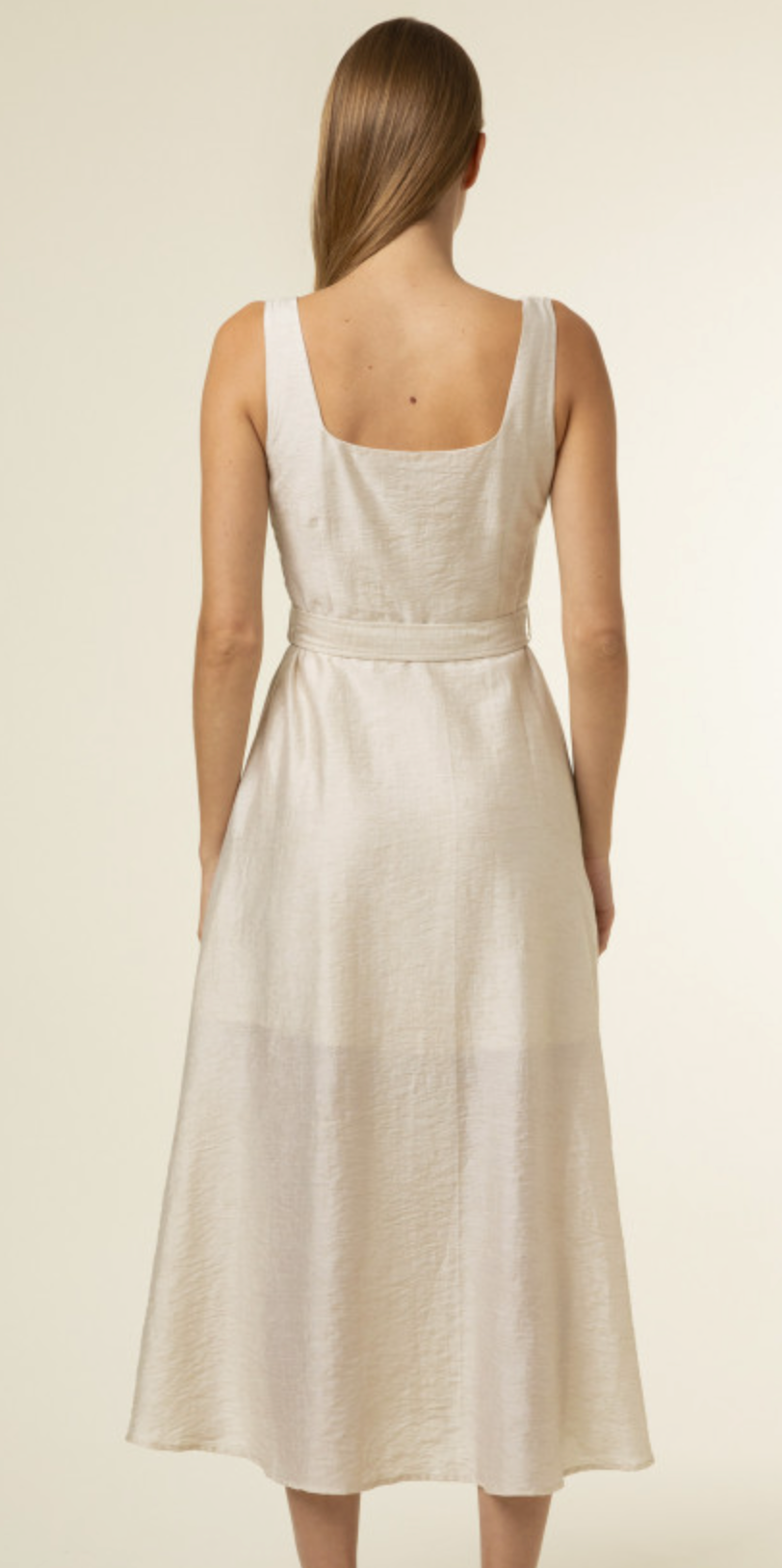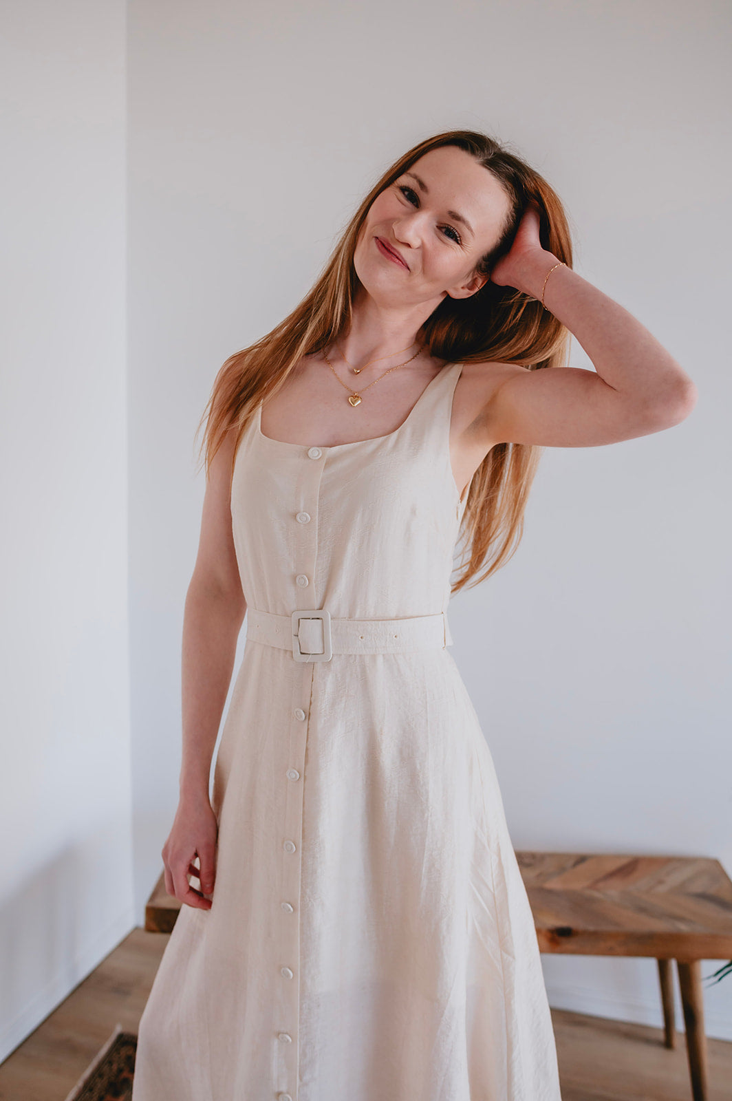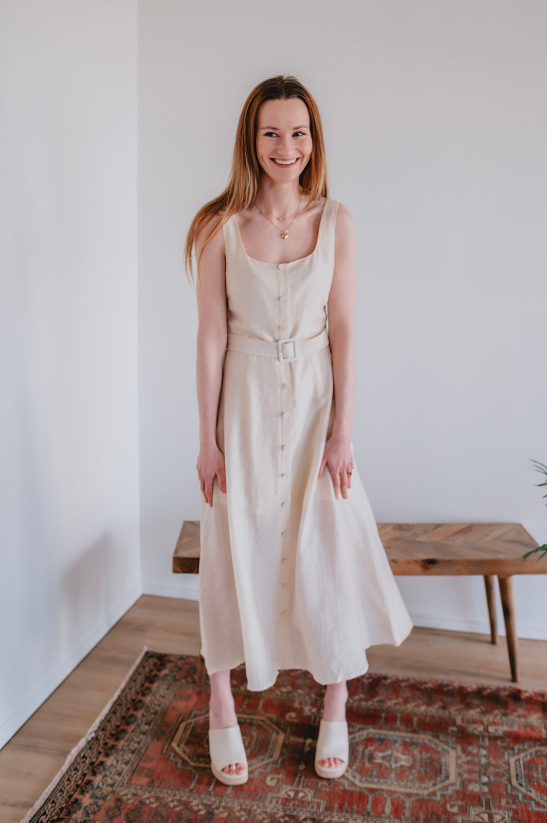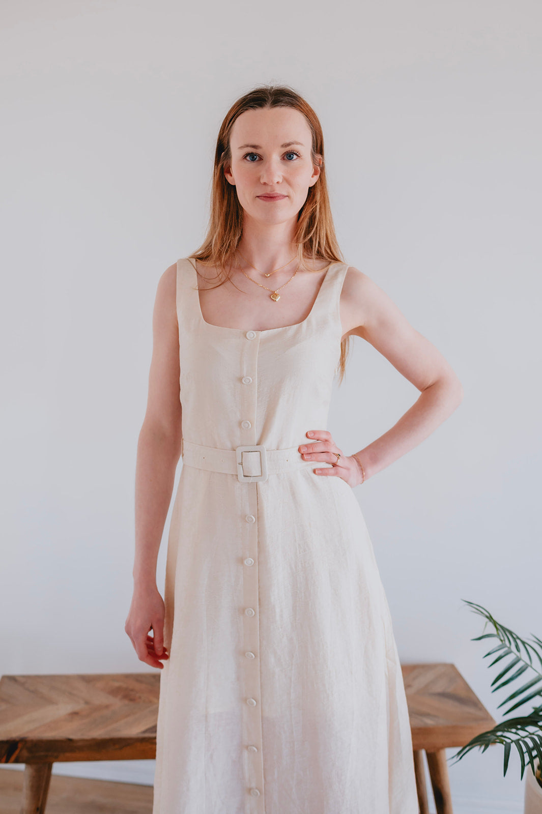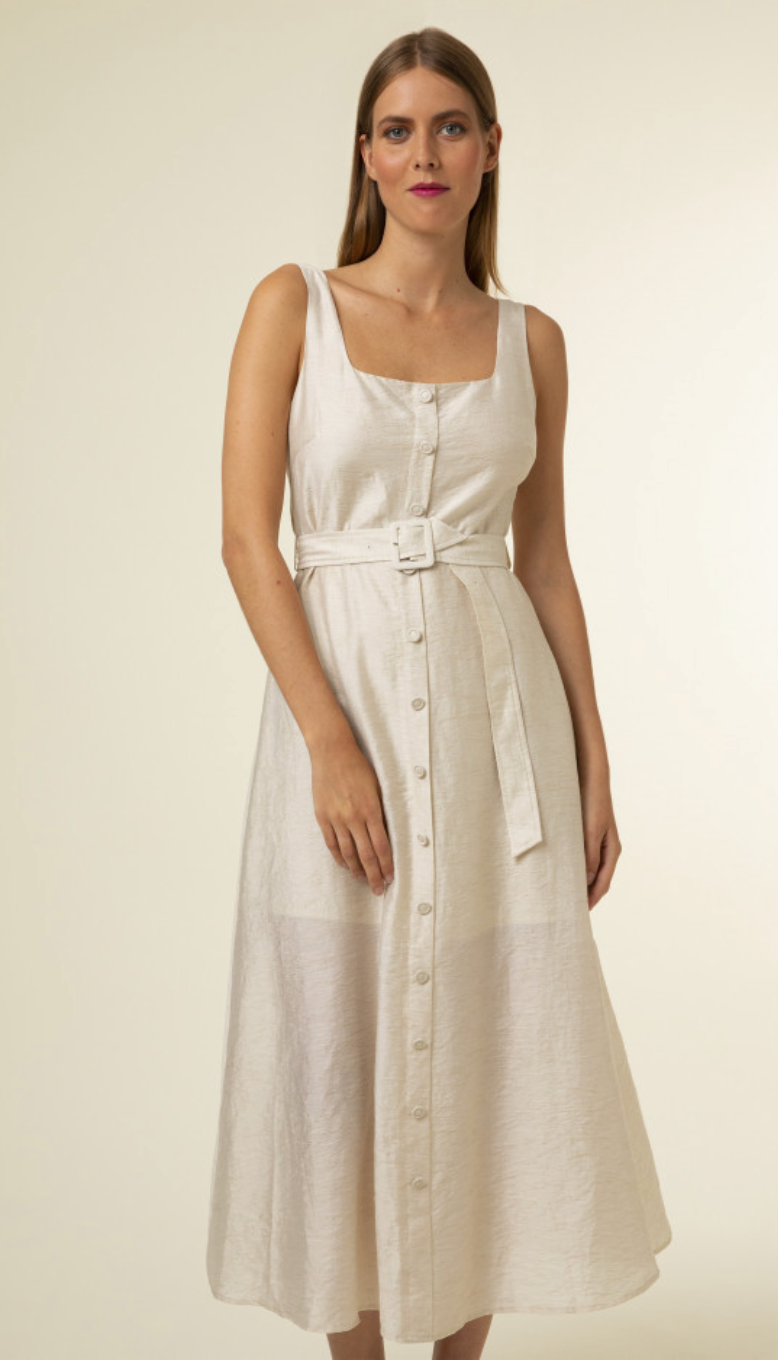 FRNCH took your favourite parts about a classic trench coach and reimagined them into this very classy and feminine dress. Wide shoulder straps, button front, belted waist and aline silhouette come together making the perfect Spring dress.