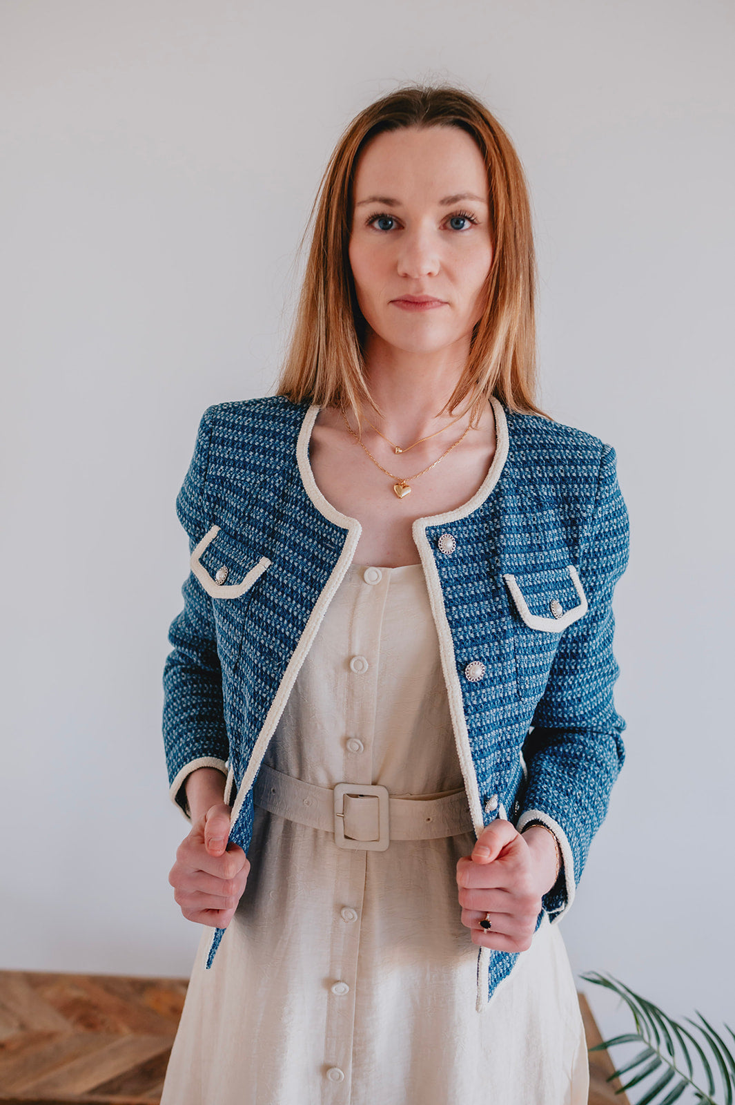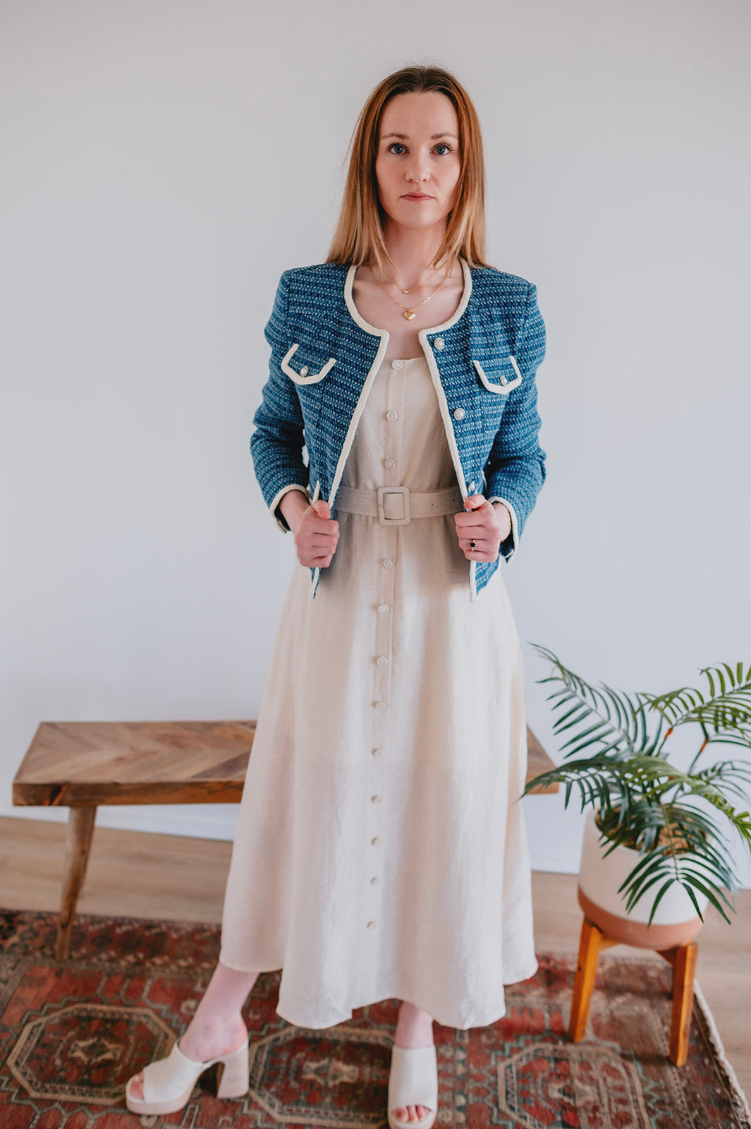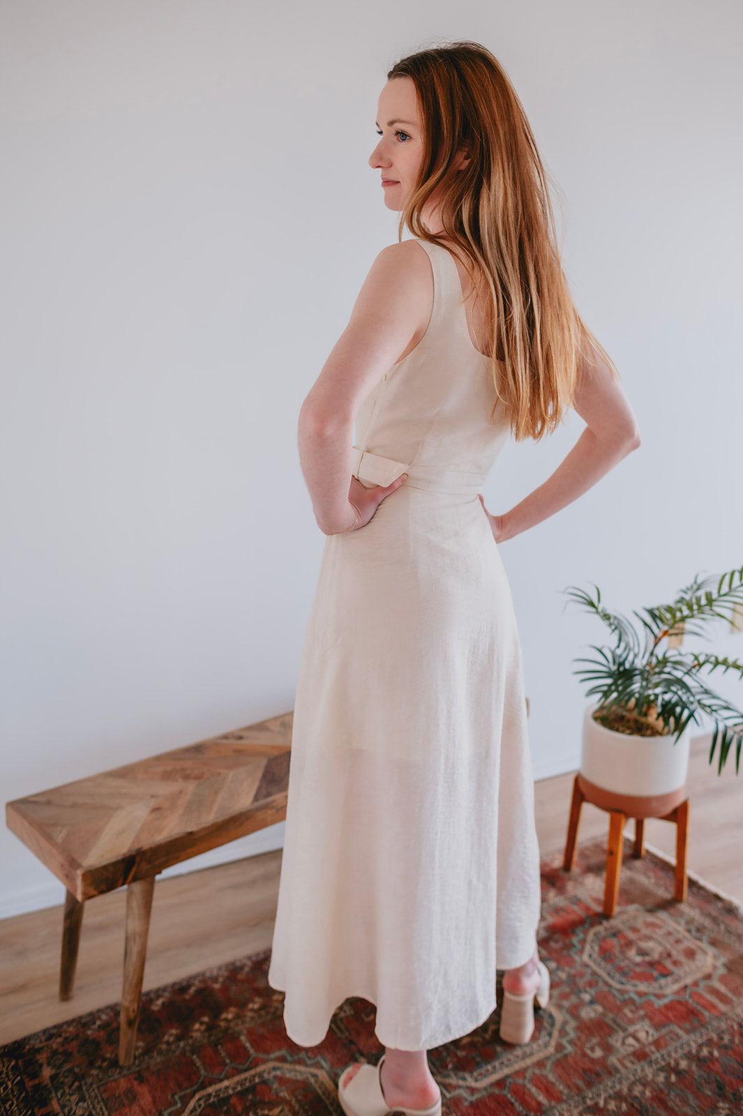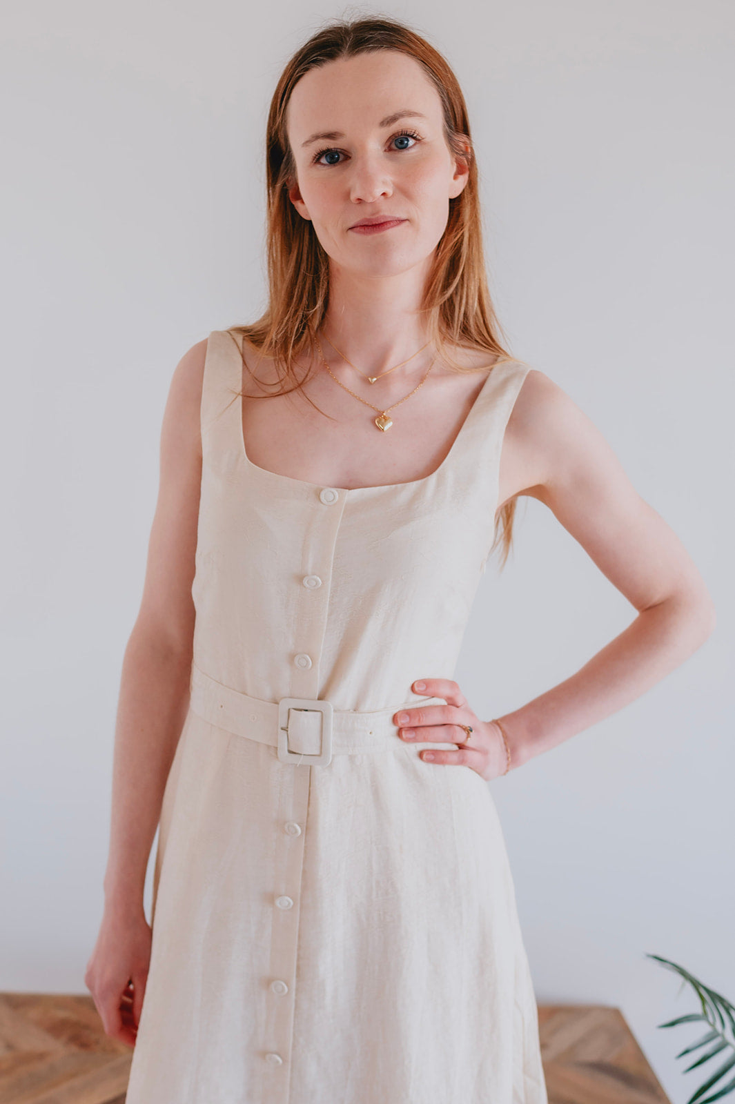 FRNCH took your favourite parts about a classic trench coach and reimagined them into this very classy and feminine dress. Wide shoulder straps, button front, belted waist and aline silhouette come together making the perfect Spring dress.