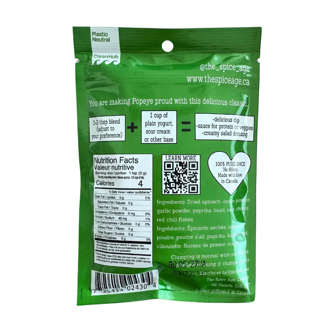 - Ingredients || Dried Spinach, onion powder, garlic powder, paprika, basil, chives, red chili flakes, salt.