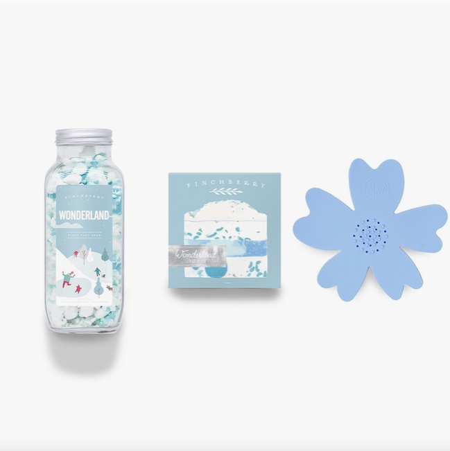 This perfectly giftable 3-piece holiday gift set includes a bar of Wonderland soap, a bottle of Wonderland Fizzy Salt Soak and a lilac blue Silicone Soap Dish.