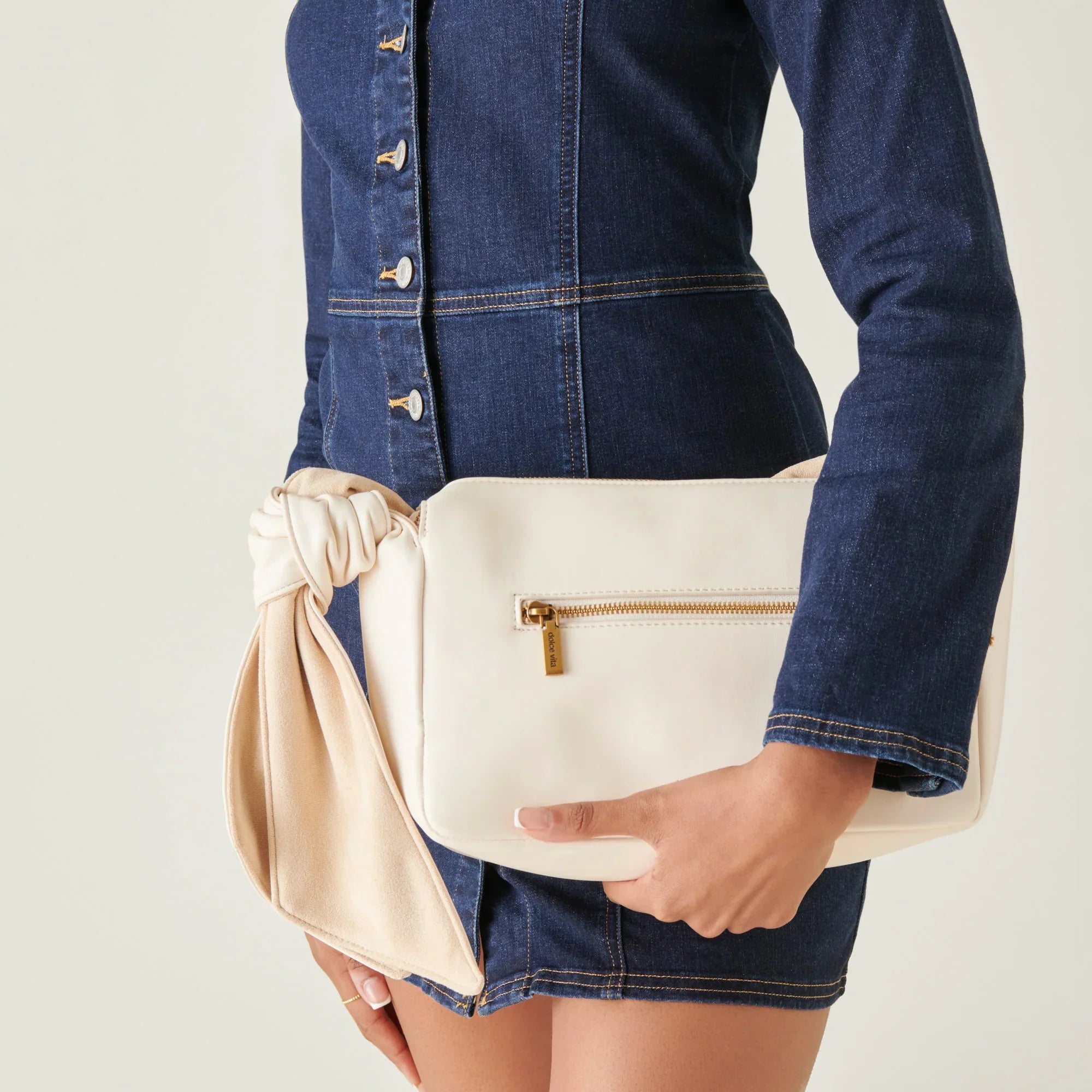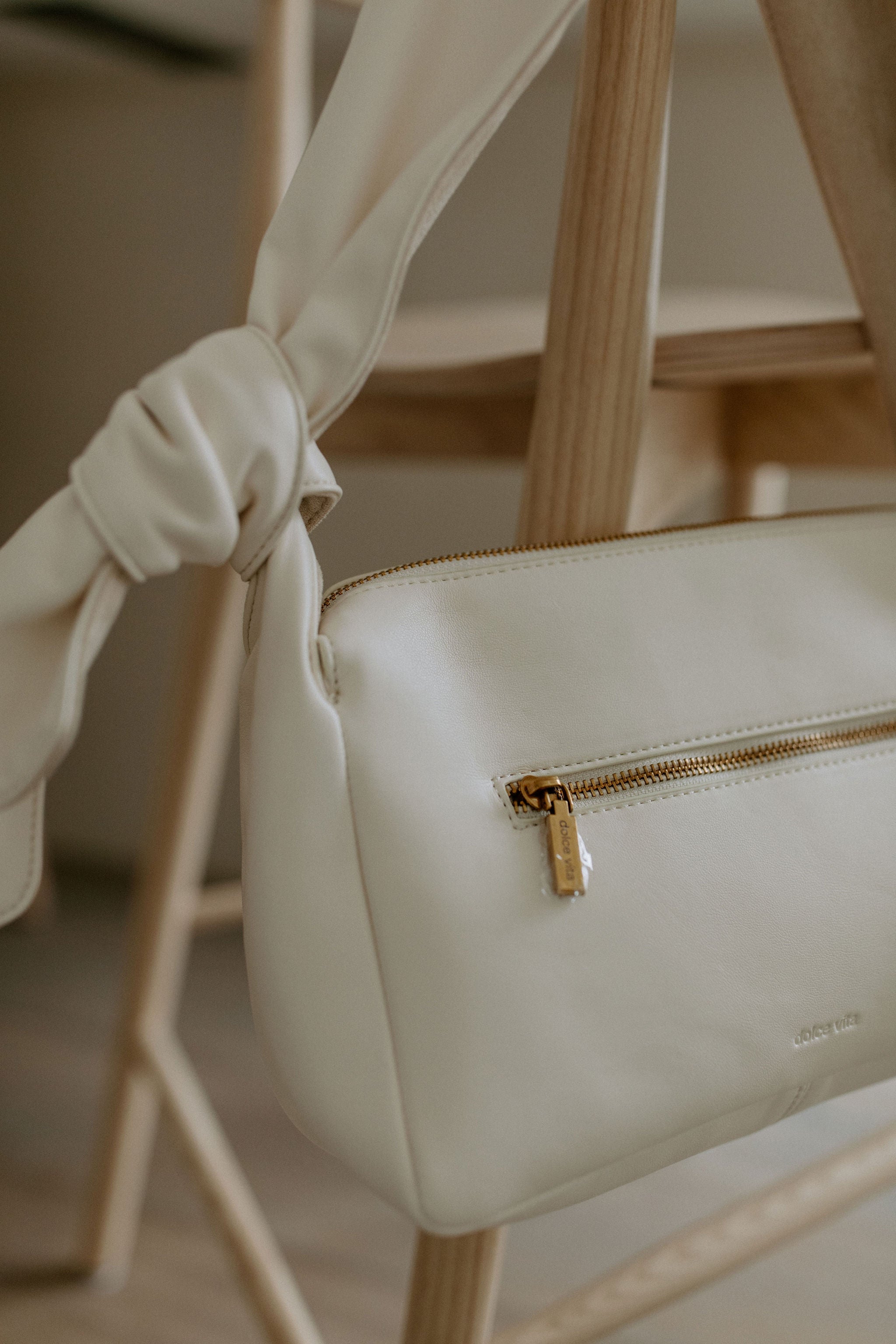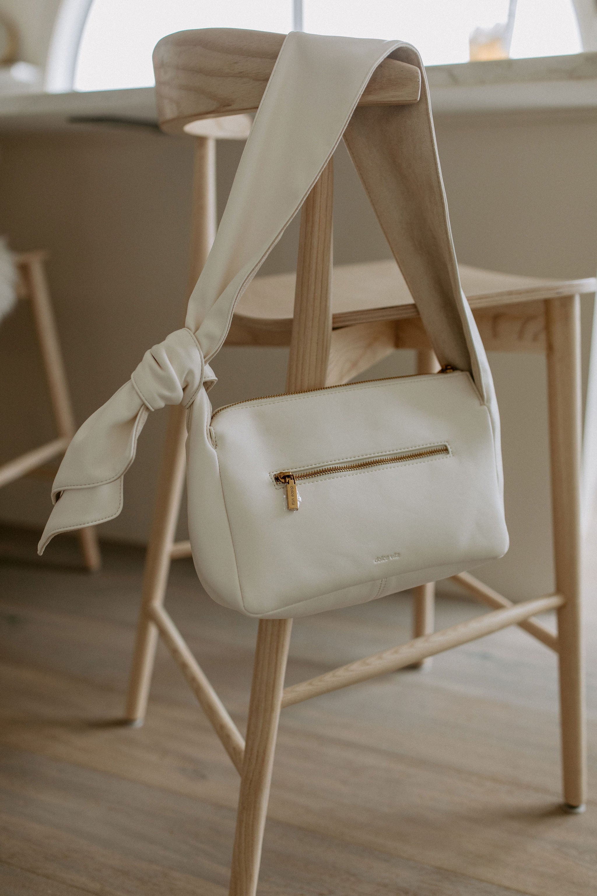 MAUDE has a mod flair about her. Neutral yet statement-making, she’s crafted with all white leather and finished off with a knotted, scarf-like strap.