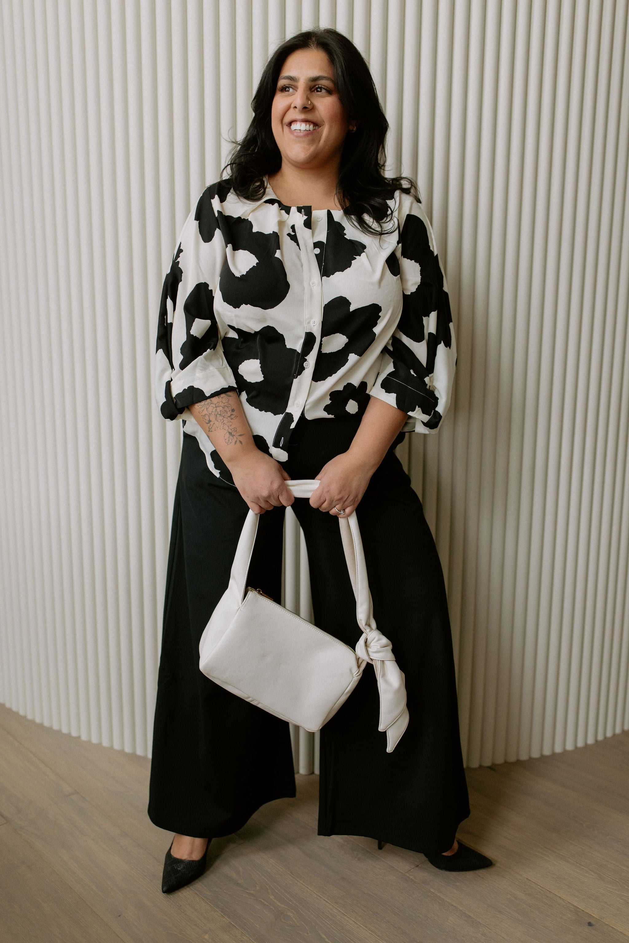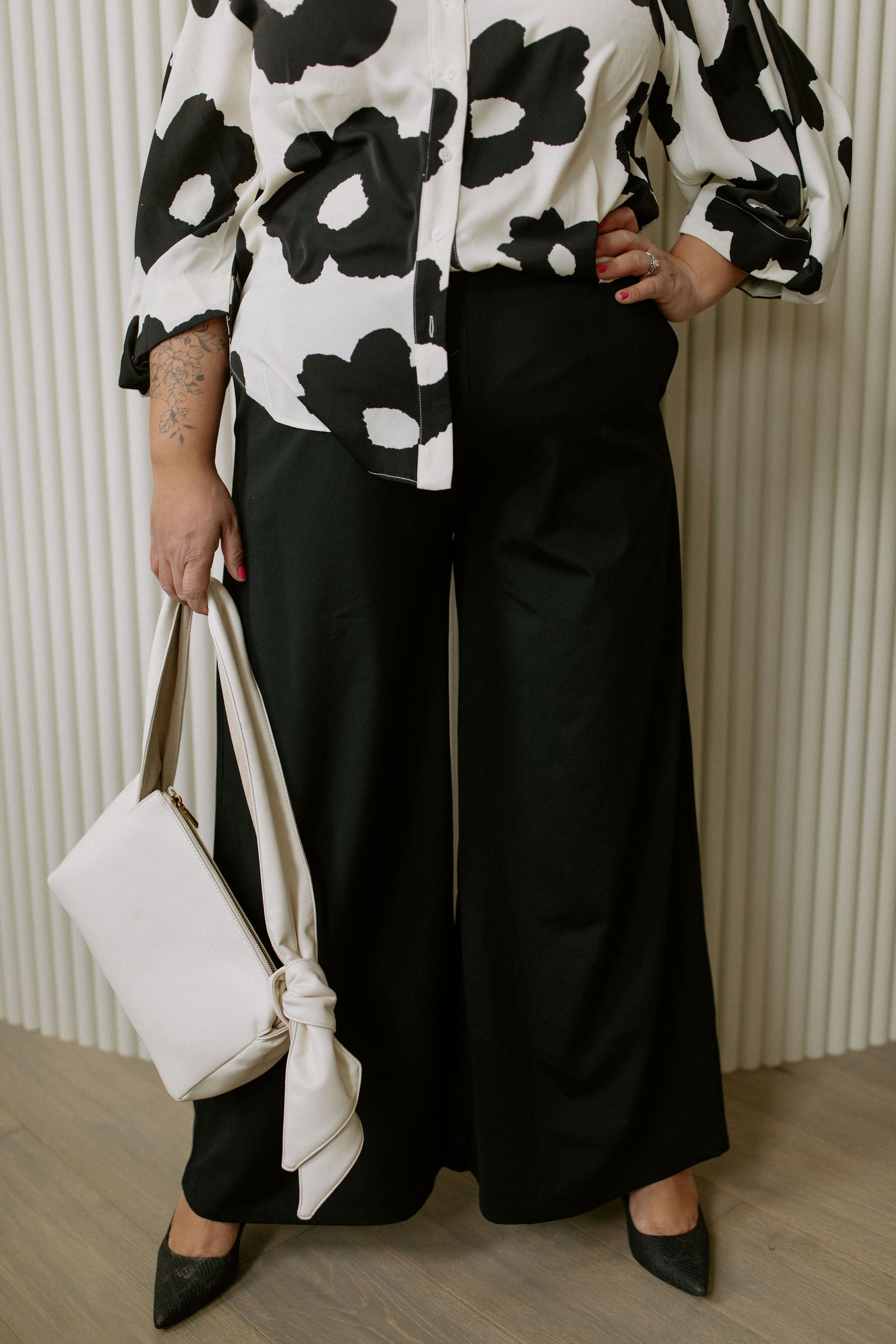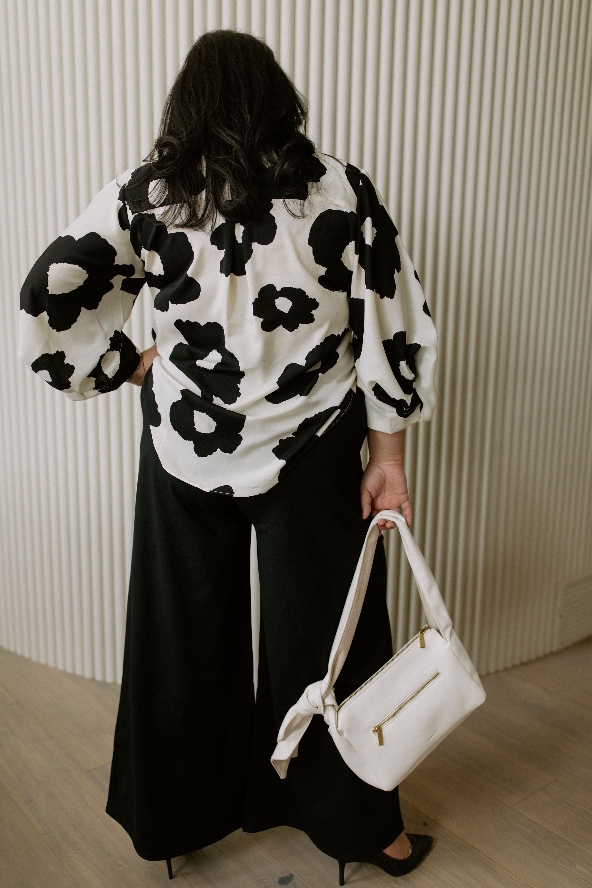 MAUDE has a mod flair about her. Neutral yet statement-making, she’s crafted with all white leather and finished off with a knotted, scarf-like strap.