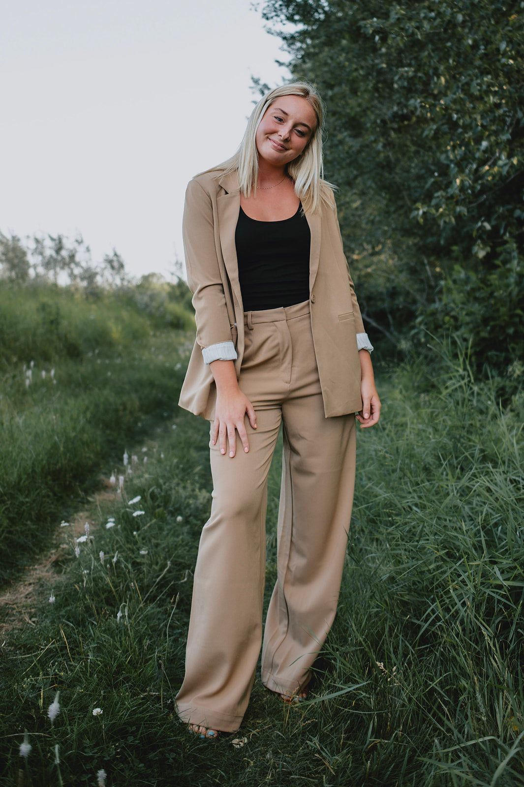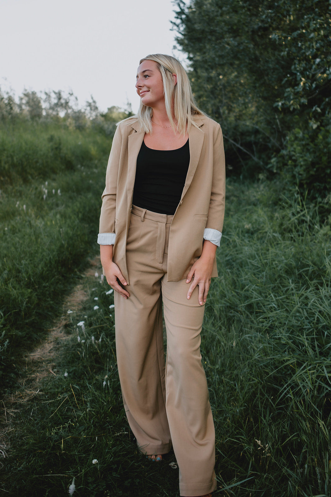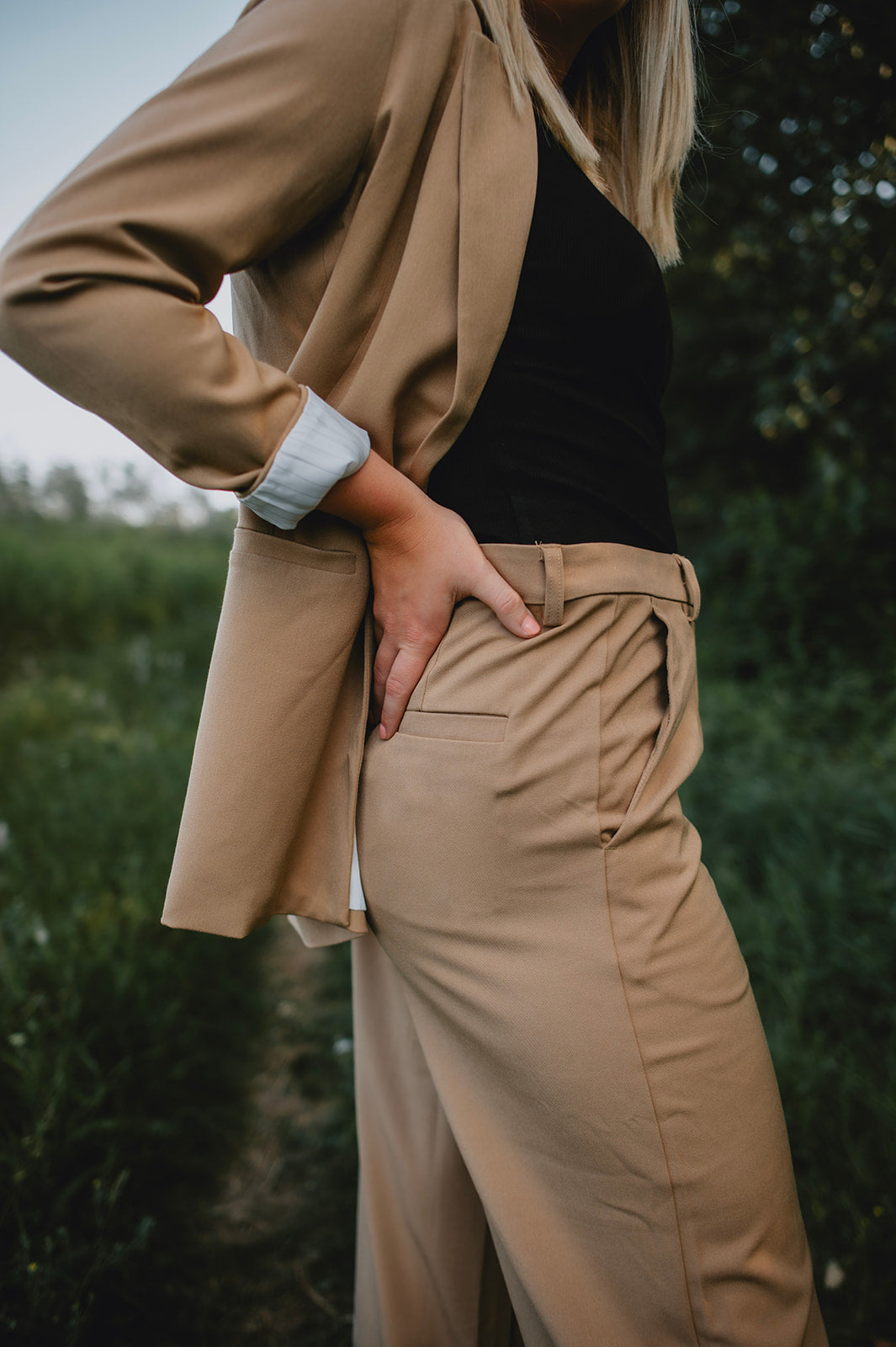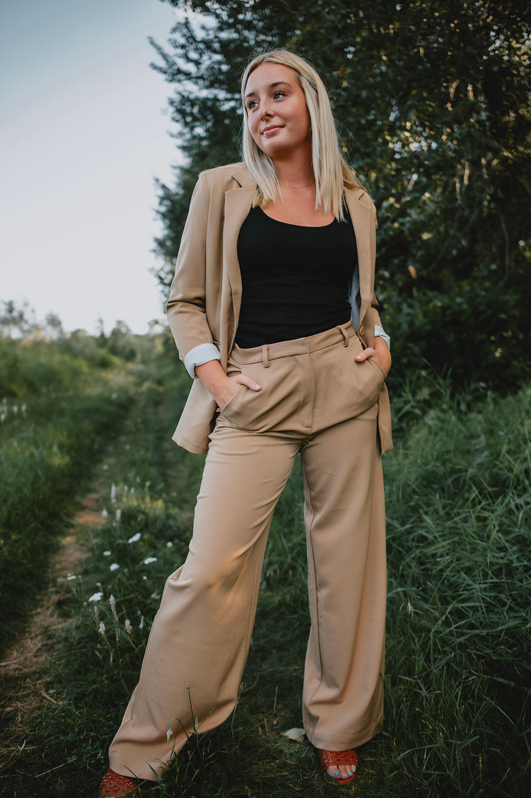 The Lessa pant is a flared pants with front pleats. The pant is delicately weaved, and has a loose silhouette and contains elastane for comfort. It features wide legs, slanted pockets, welt pockets and belt loops. The pant has a hidden zipper and button closure.