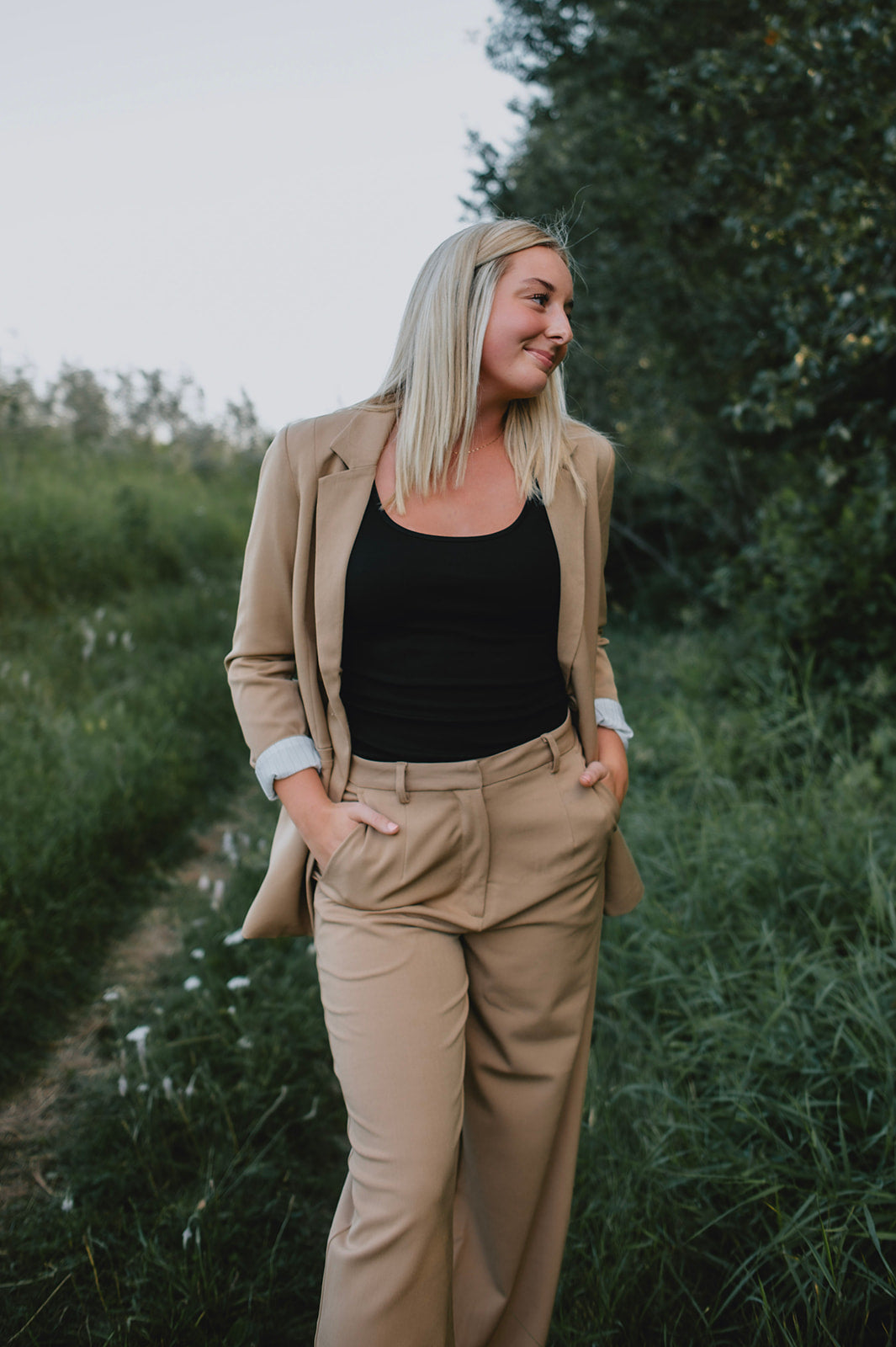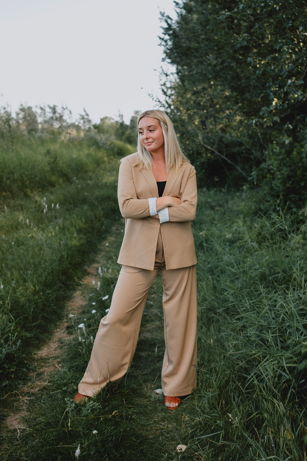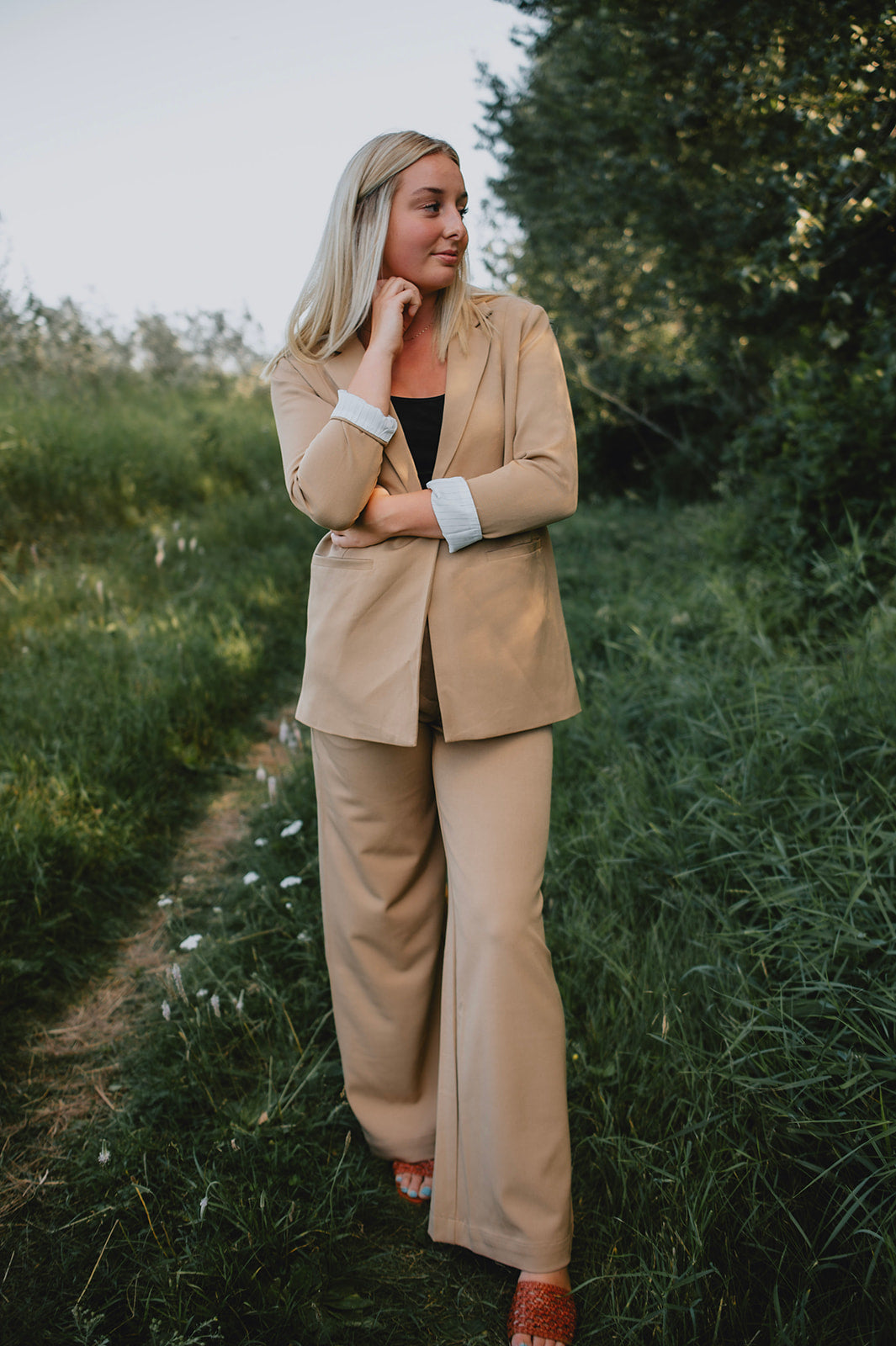 The Lessa pant is a flared pants with front pleats. The pant is delicately weaved, and has a loose silhouette and contains elastane for comfort. It features wide legs, slanted pockets, welt pockets and belt loops. The pant has a hidden zipper and button closure.