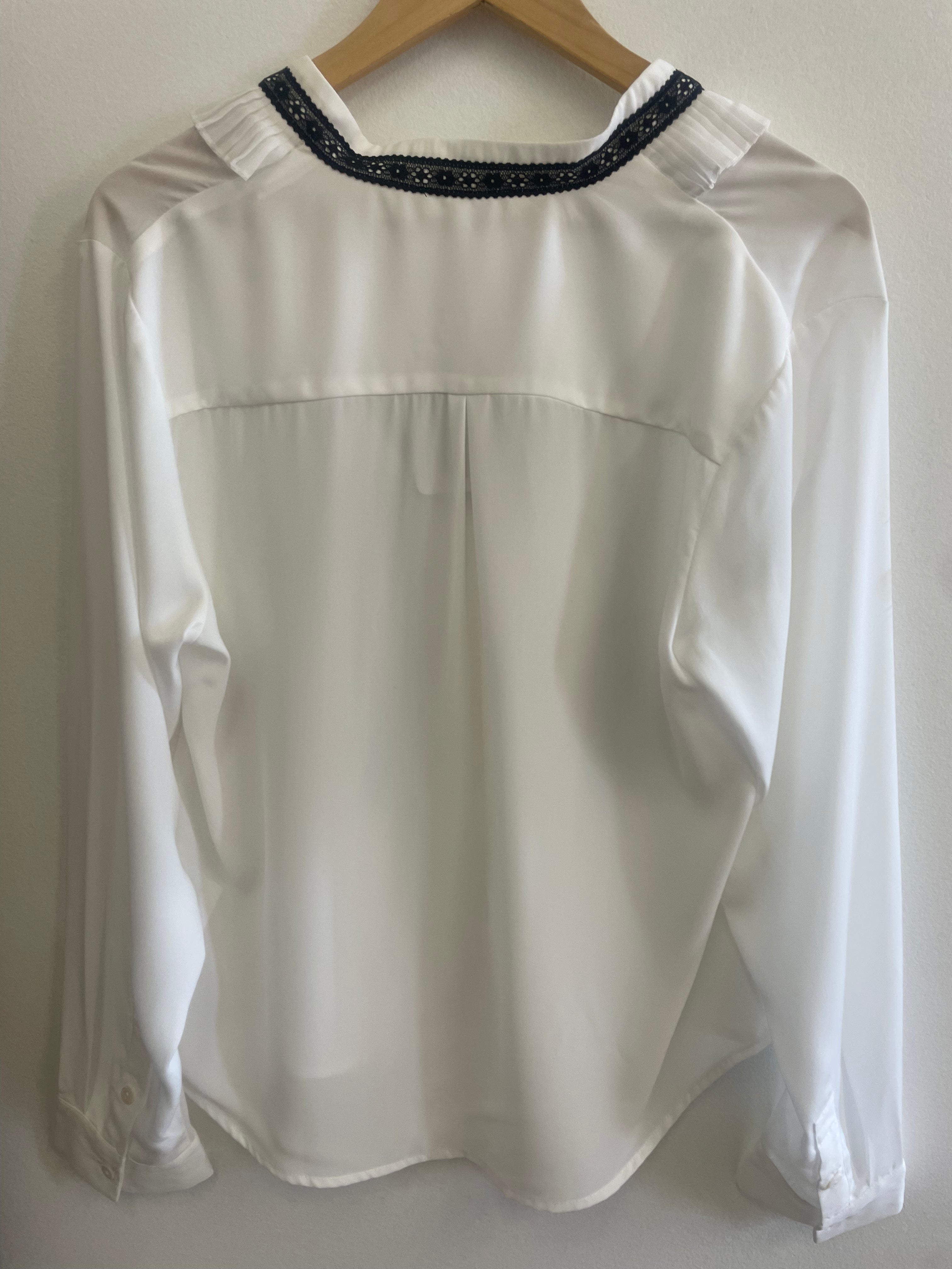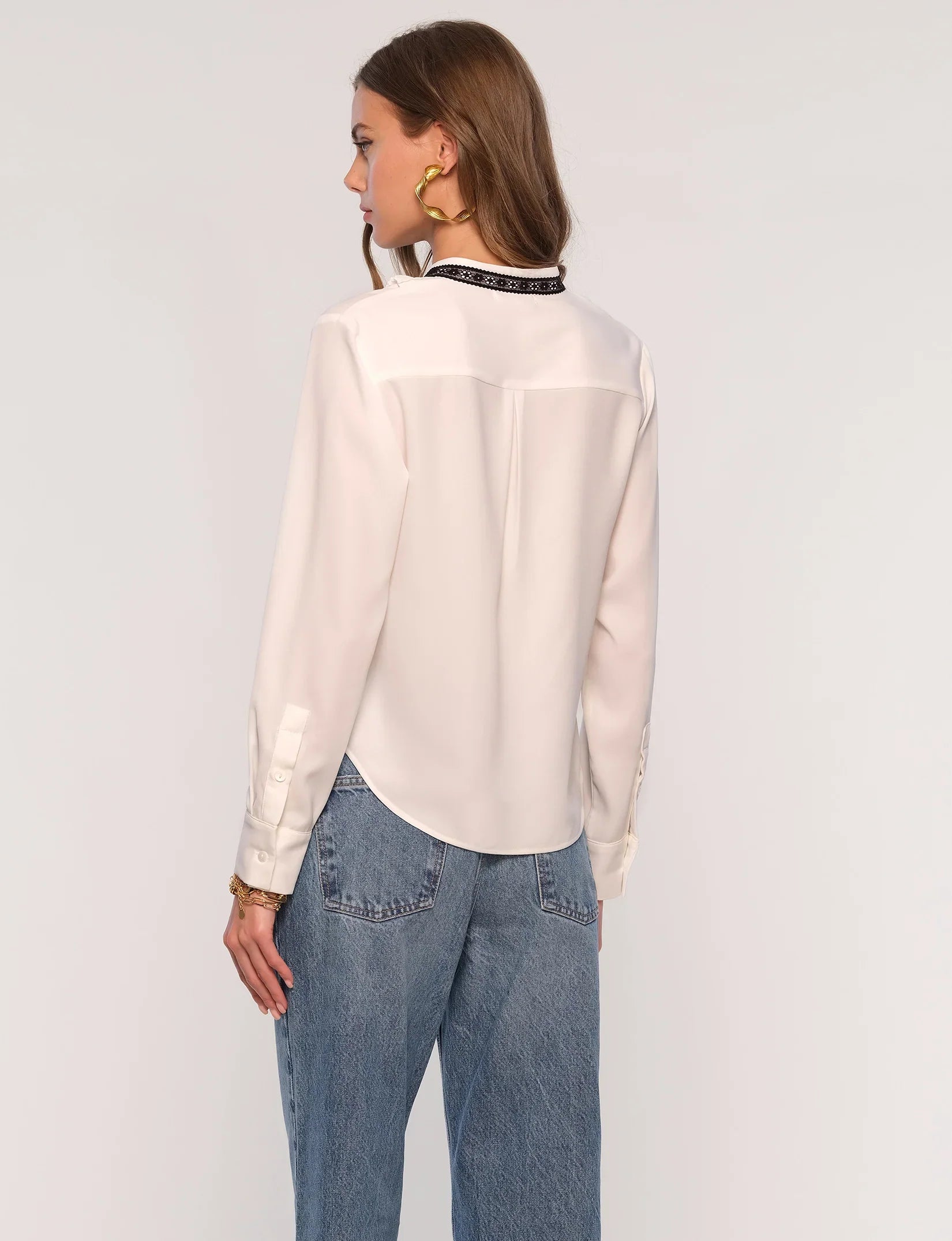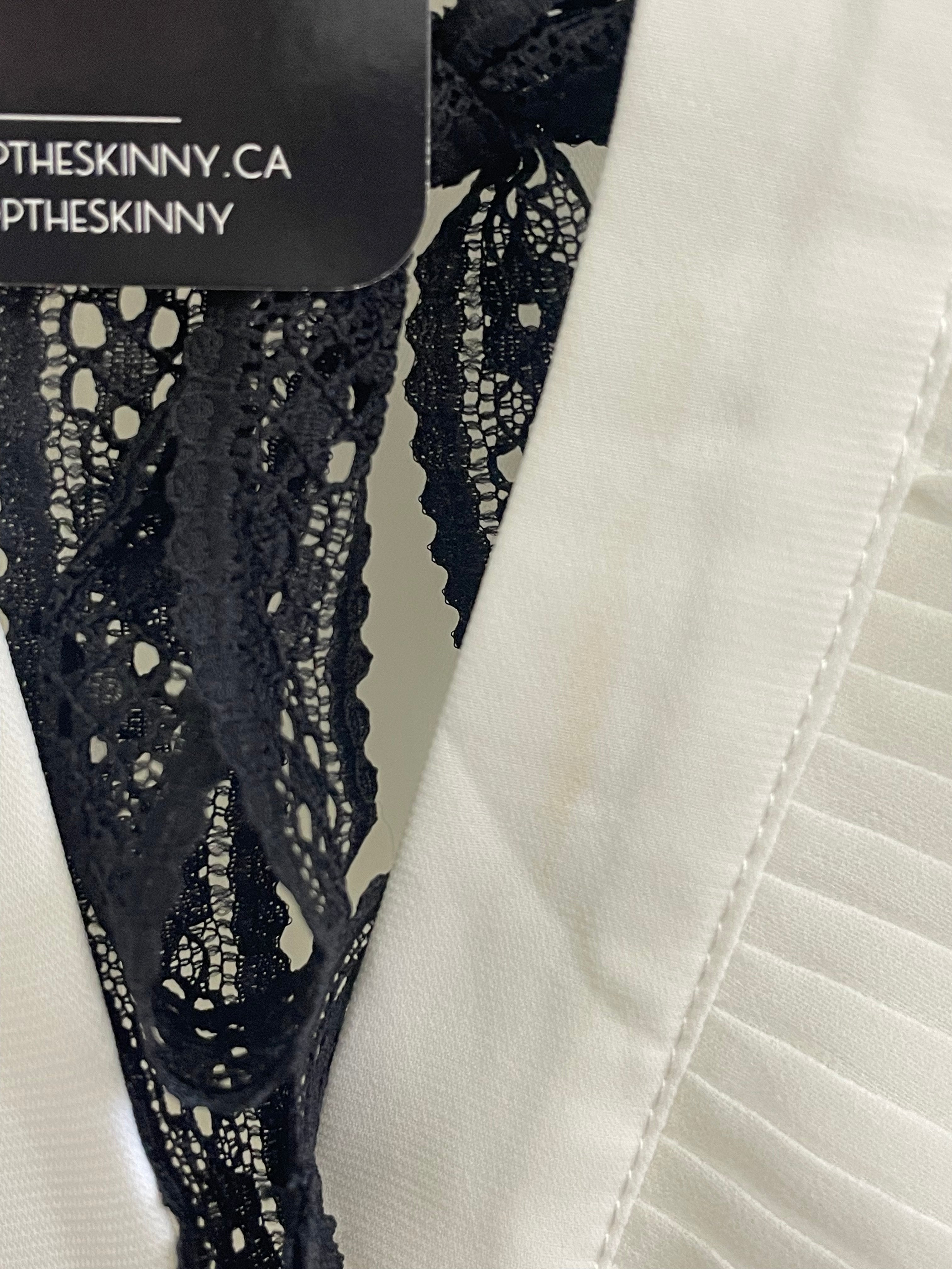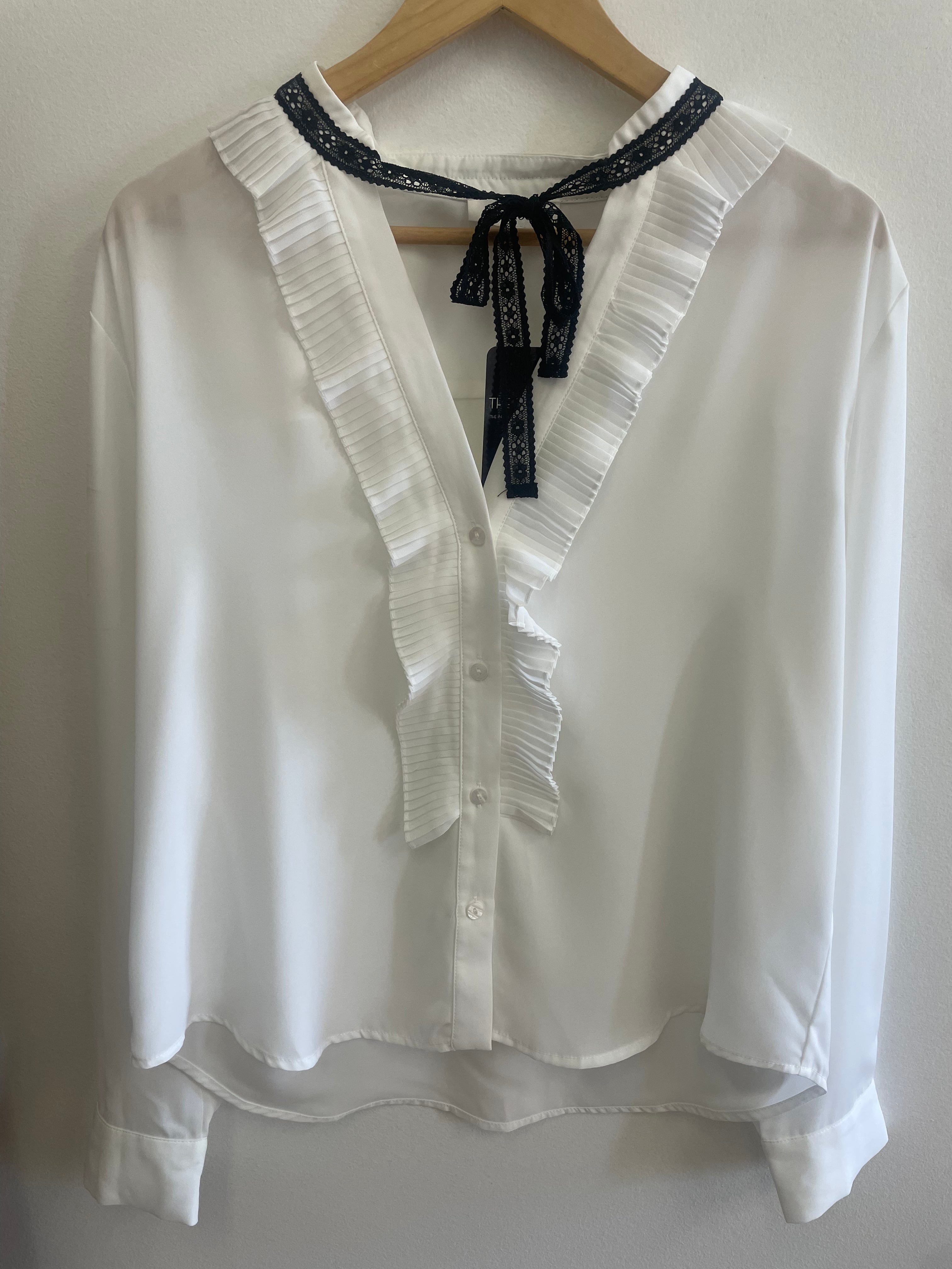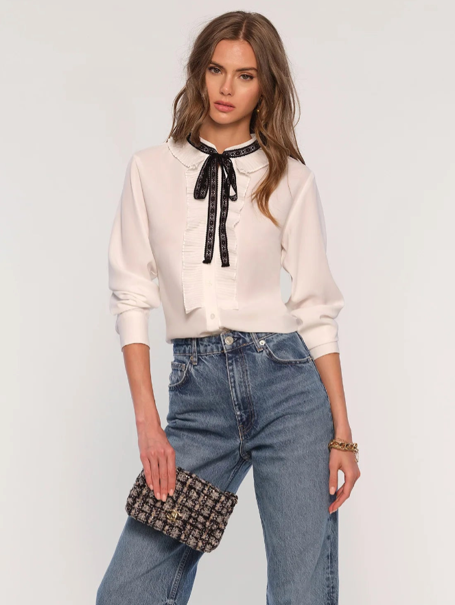Introducing the Blair Top. It features a relaxed fit, a pleated front ruffle, and a contrasting lace neck tie. We love it paired with a pair of vintage denim and a kitten heel.
