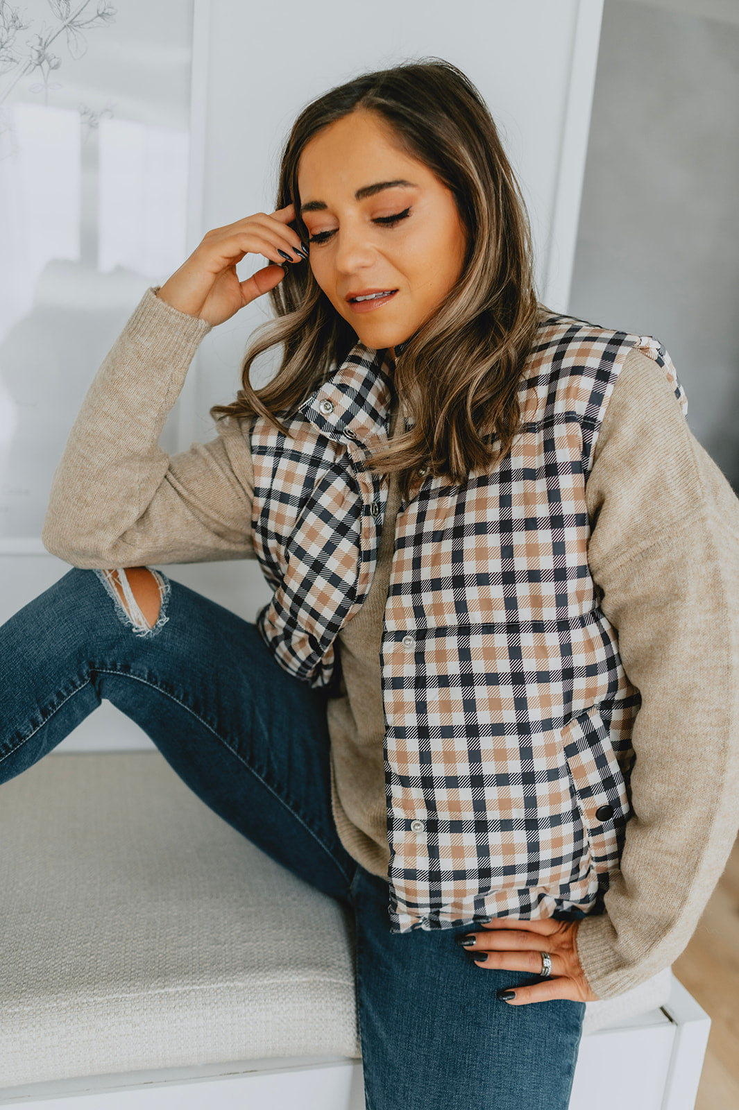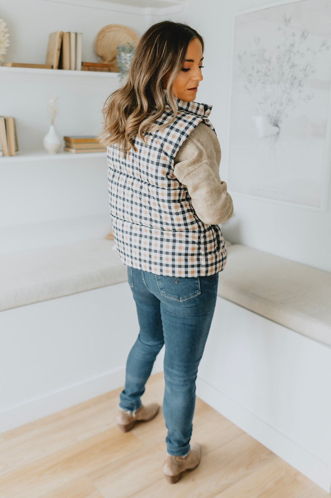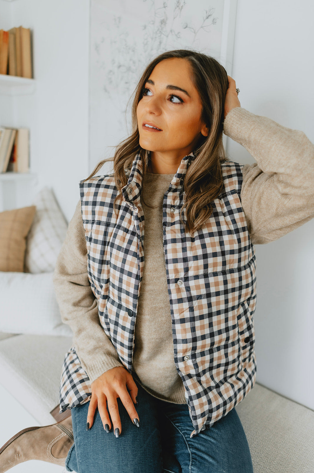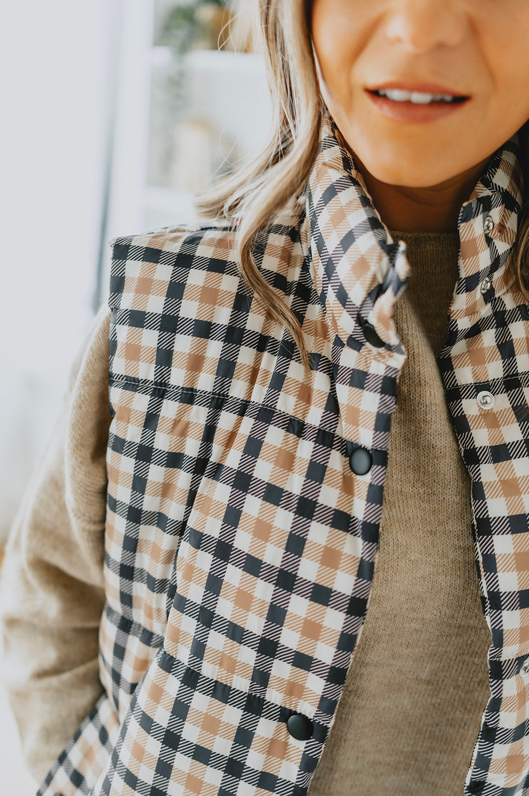 A super light weight puffer vest, such a cool layer in the most on trend pattern.