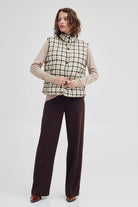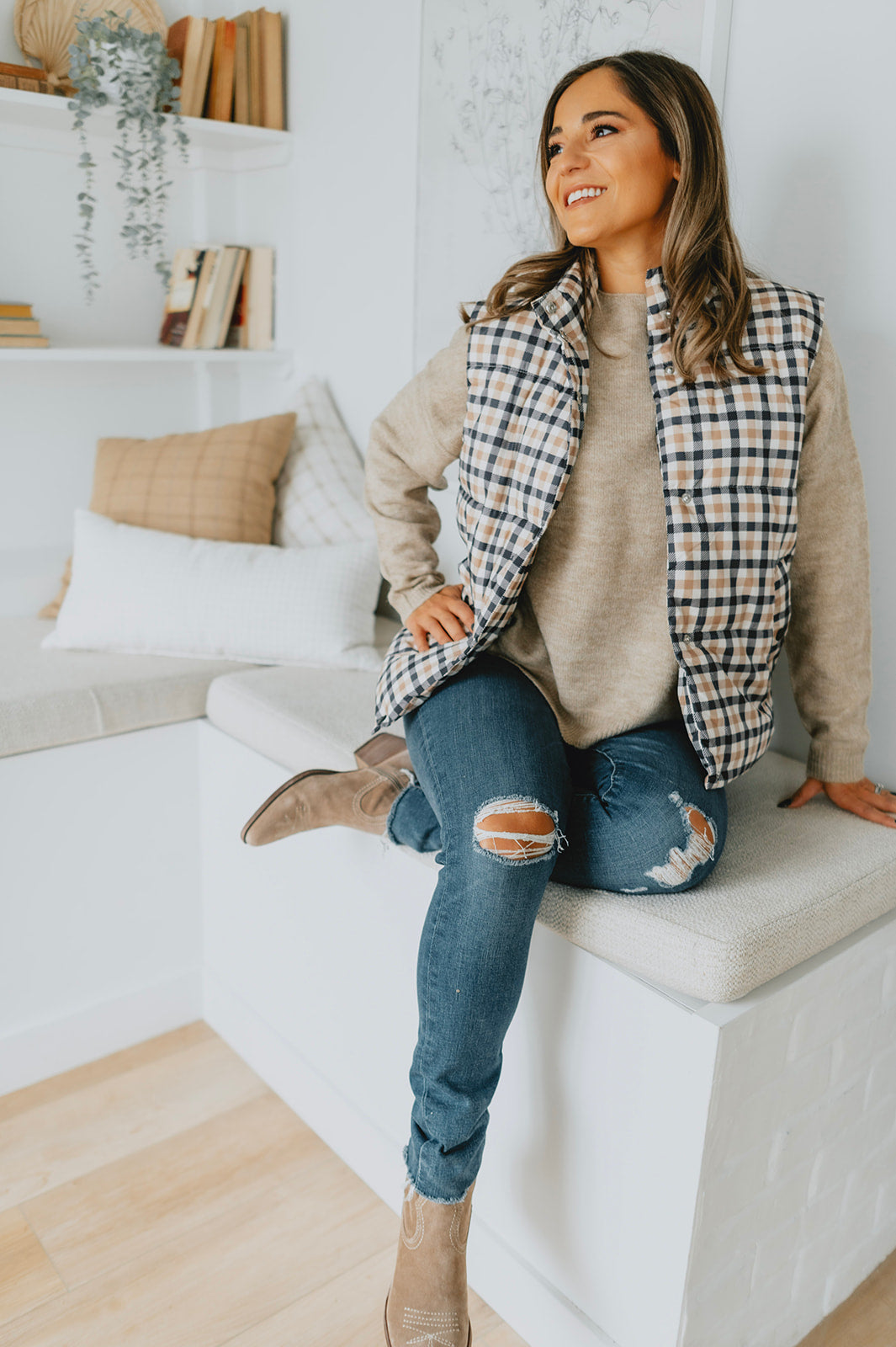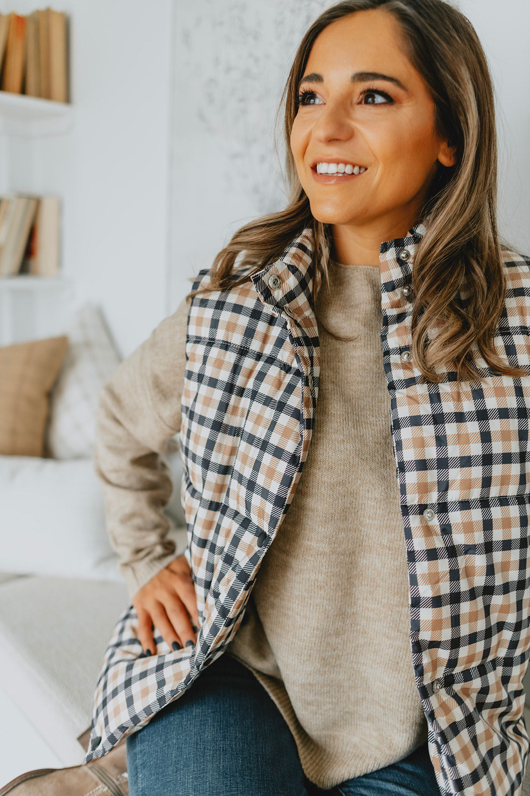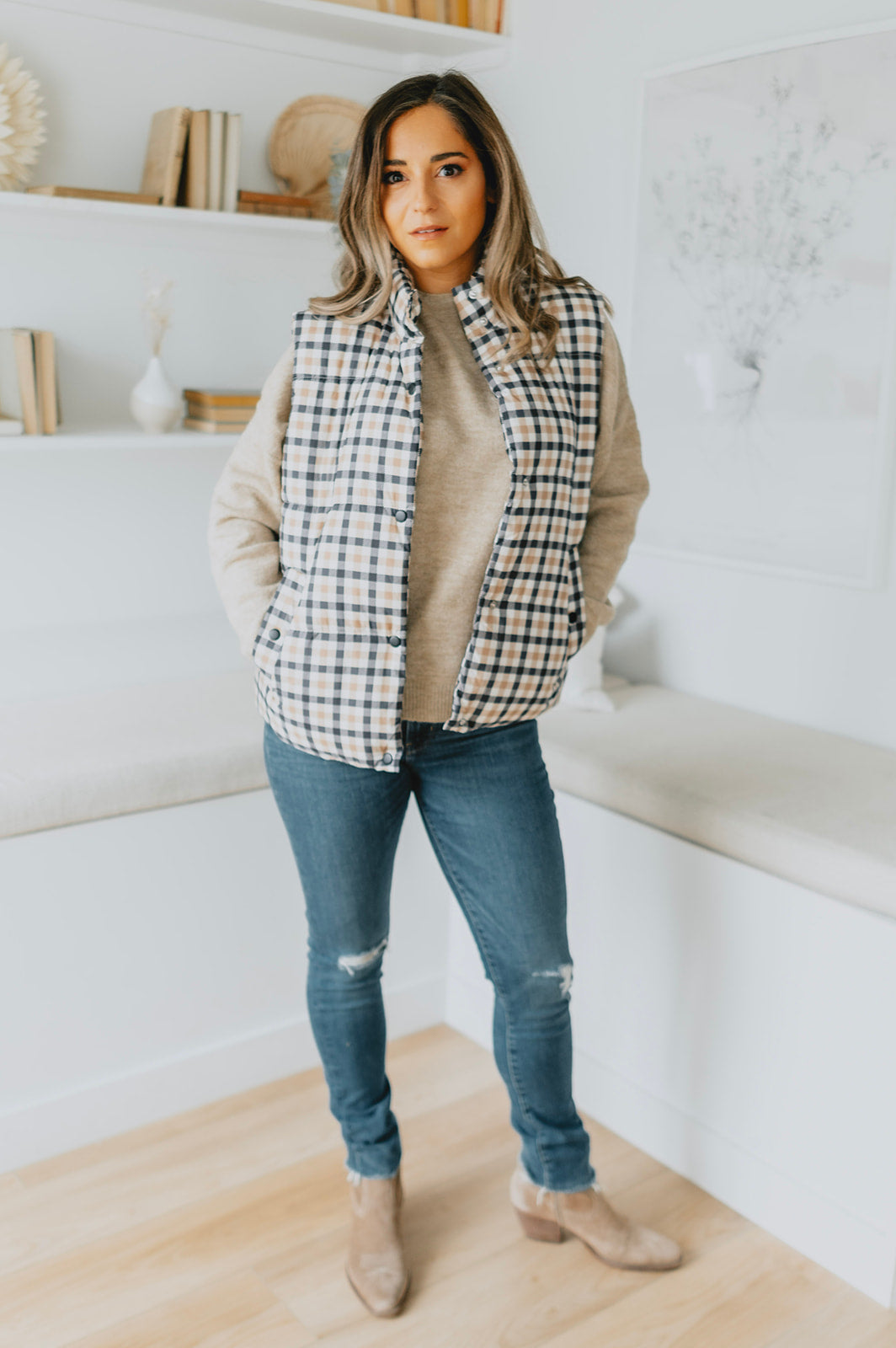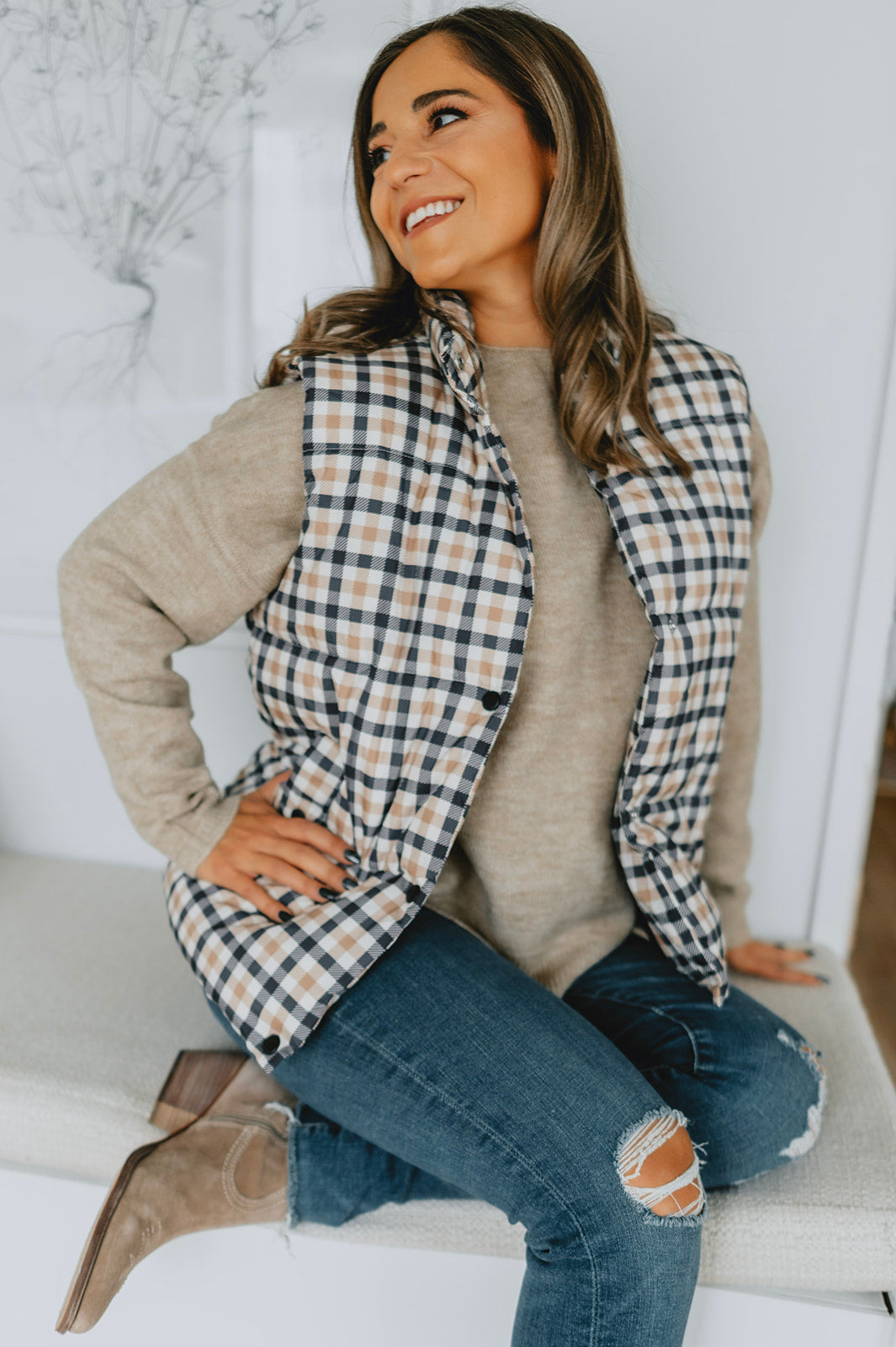 A super light weight puffer vest, such a cool layer in the most on trend pattern.