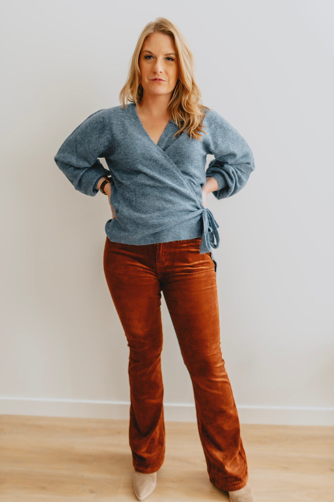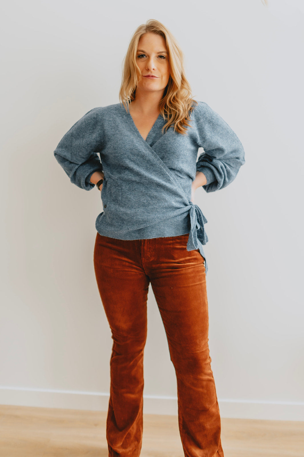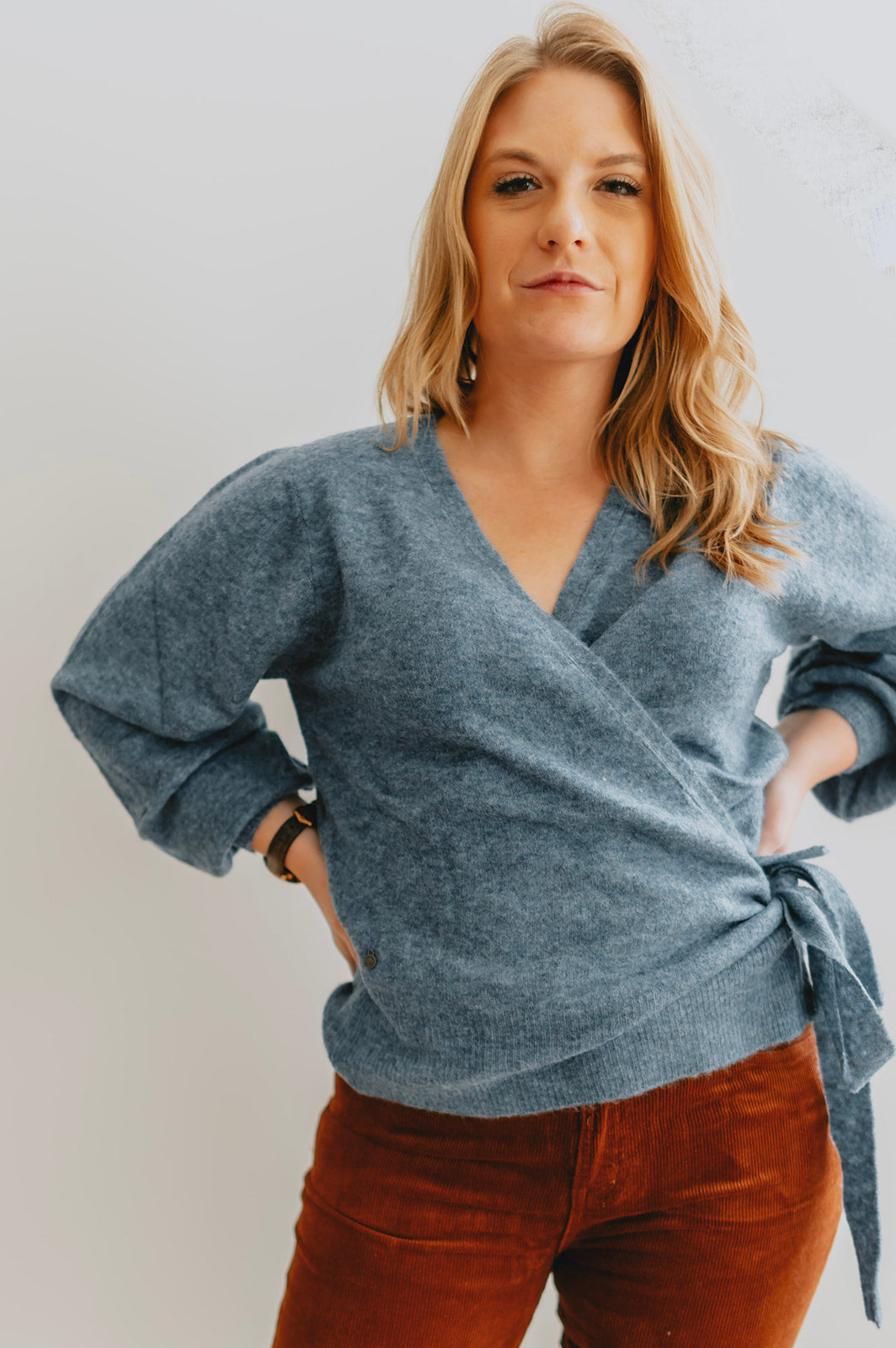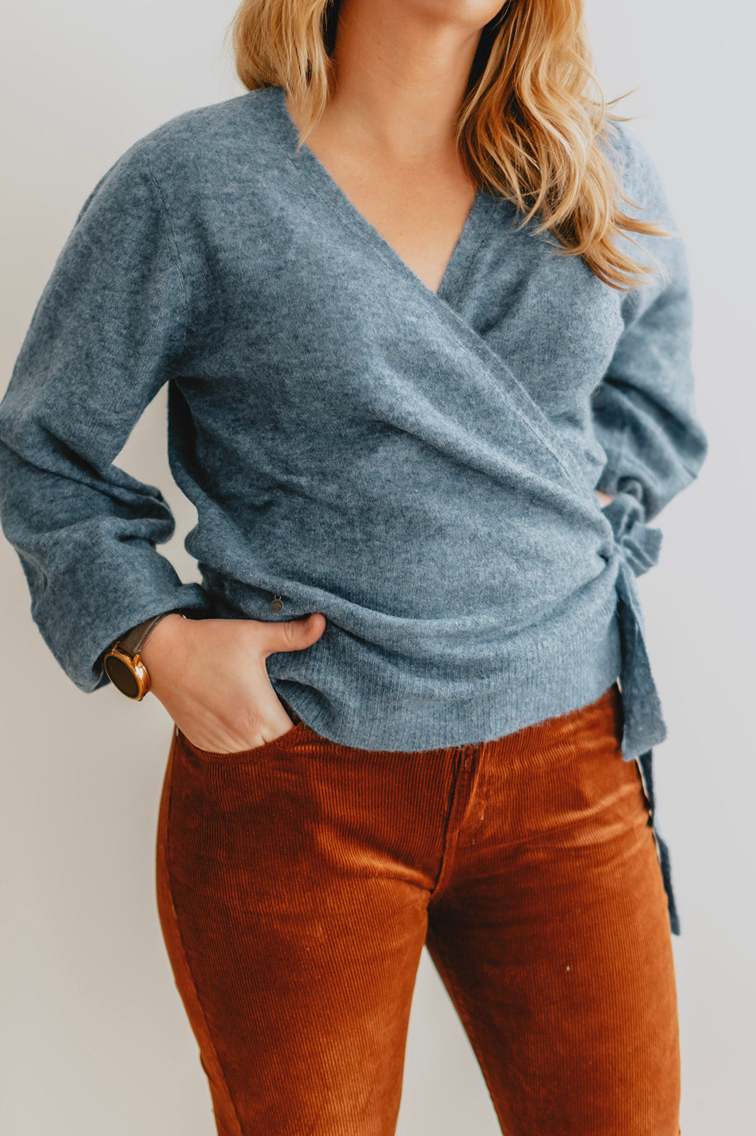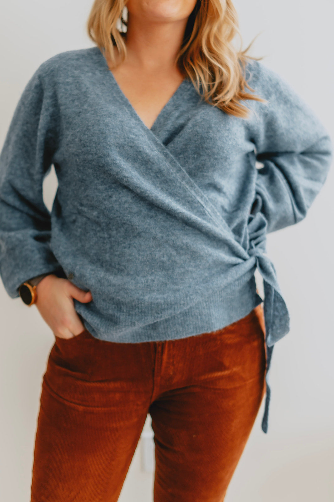 A soft wrap style sweater that is going too quickly become your most worn item.
