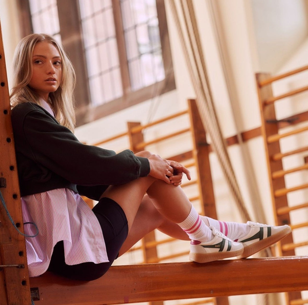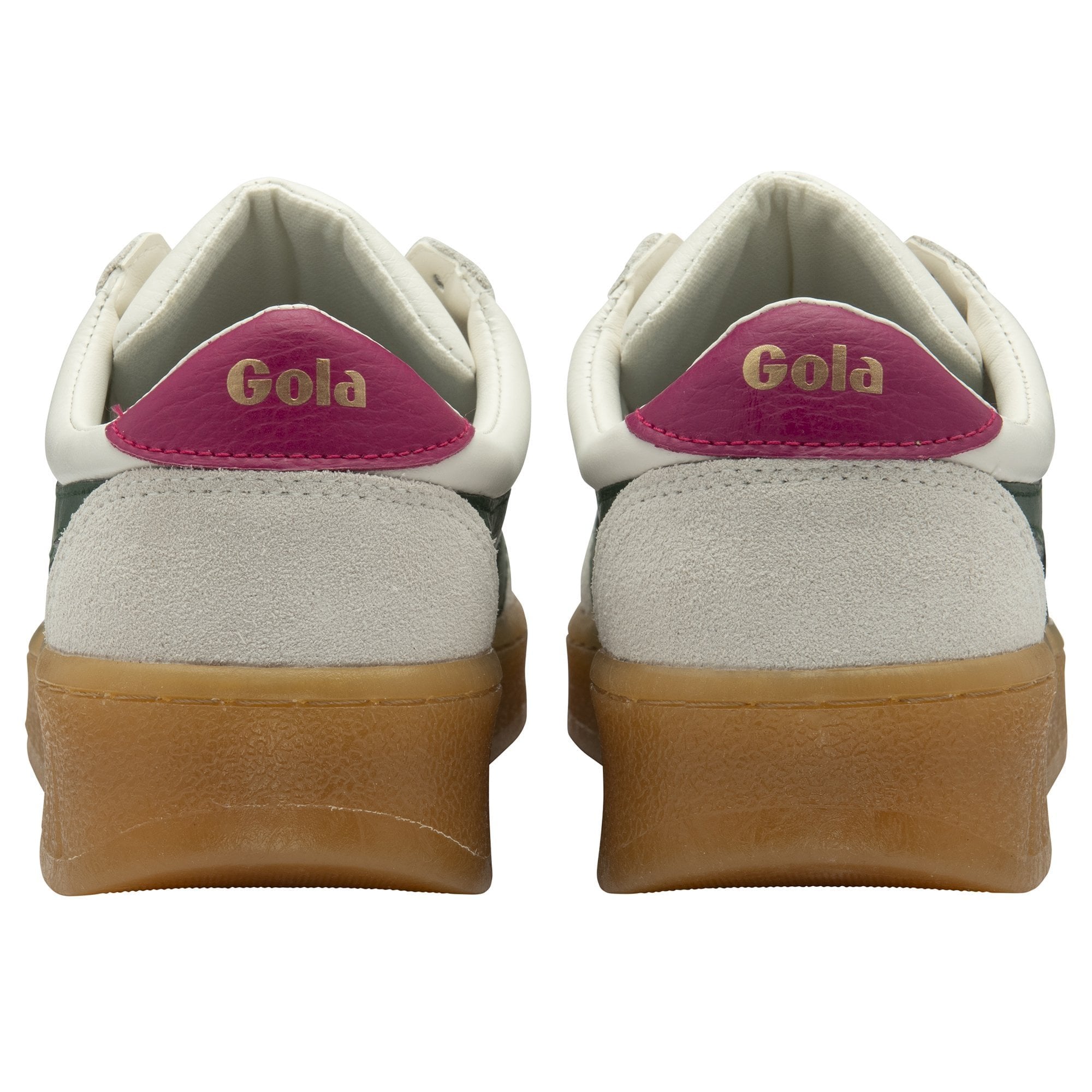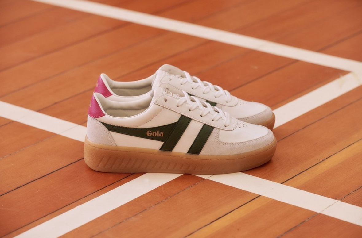 Gum soles are having a moment and Grandslam Elite takes the sneaker trending look up a notch. The much loved Grandslam vintage tennis upper is complemented with the perfect gum tone sole and a classic colour palette of white with evergreen Gola wingflash branding. A fuchsia pink heel pop adds a joyous twist to give a heritage women’s sneaker with a sunny disposition.