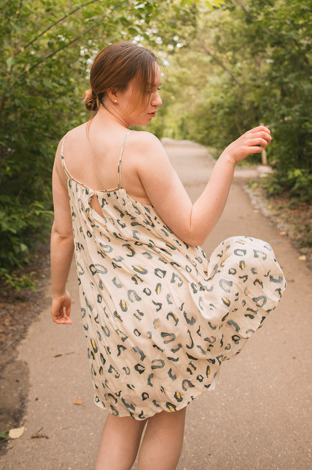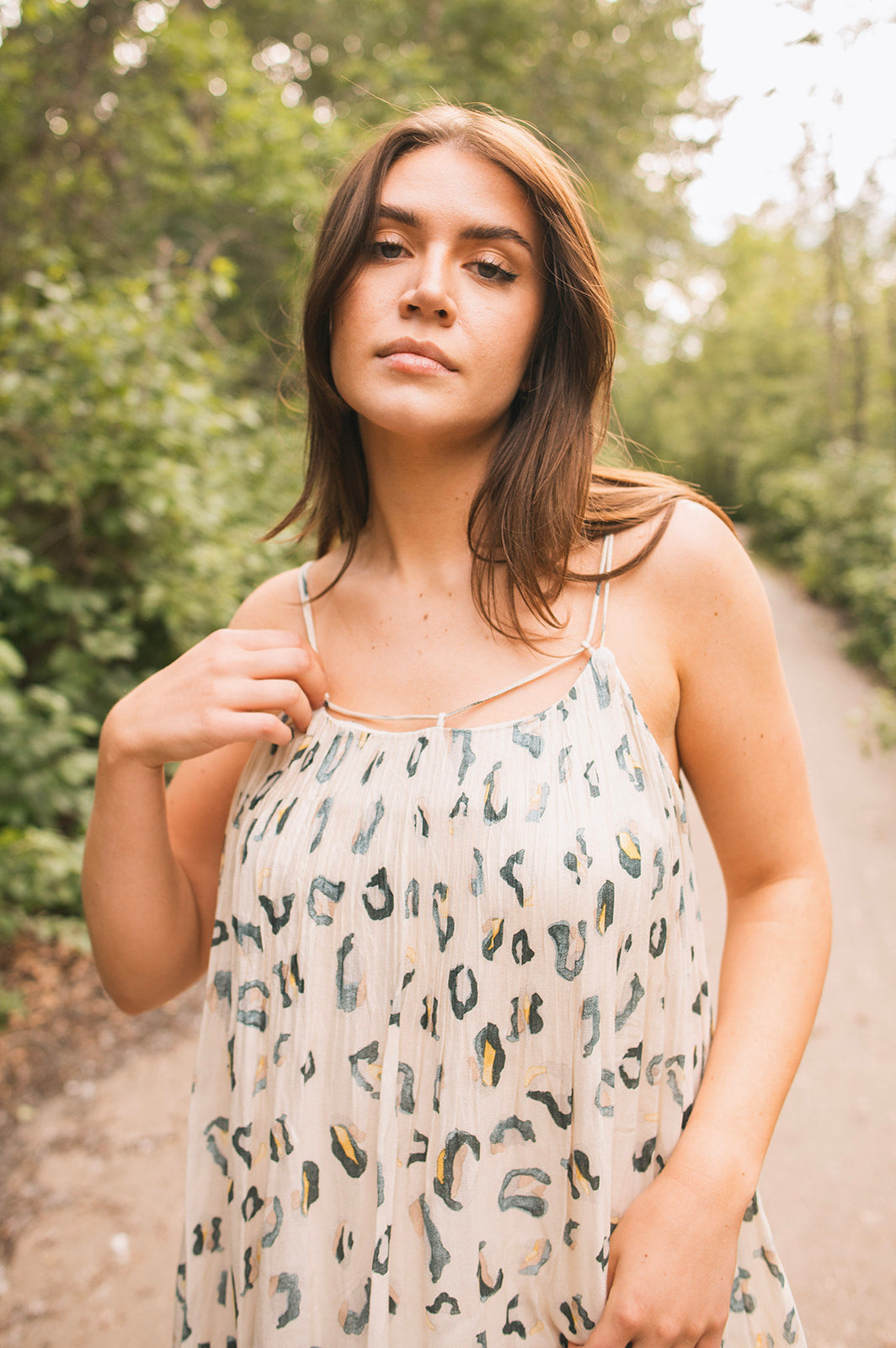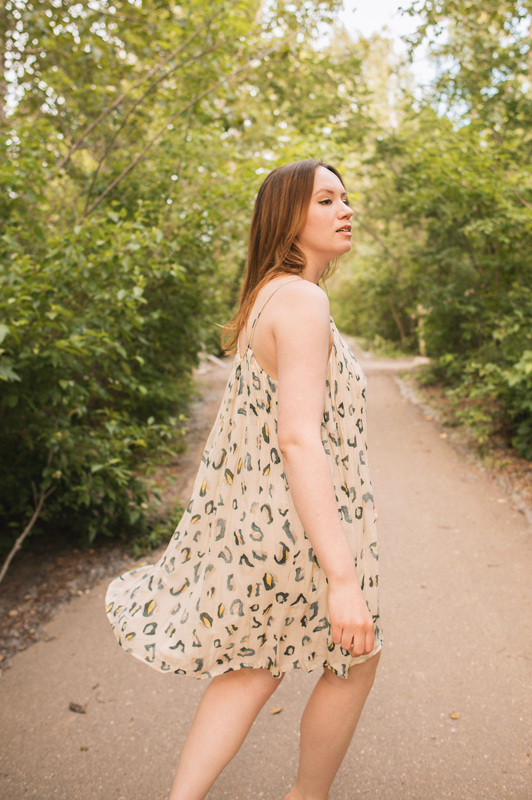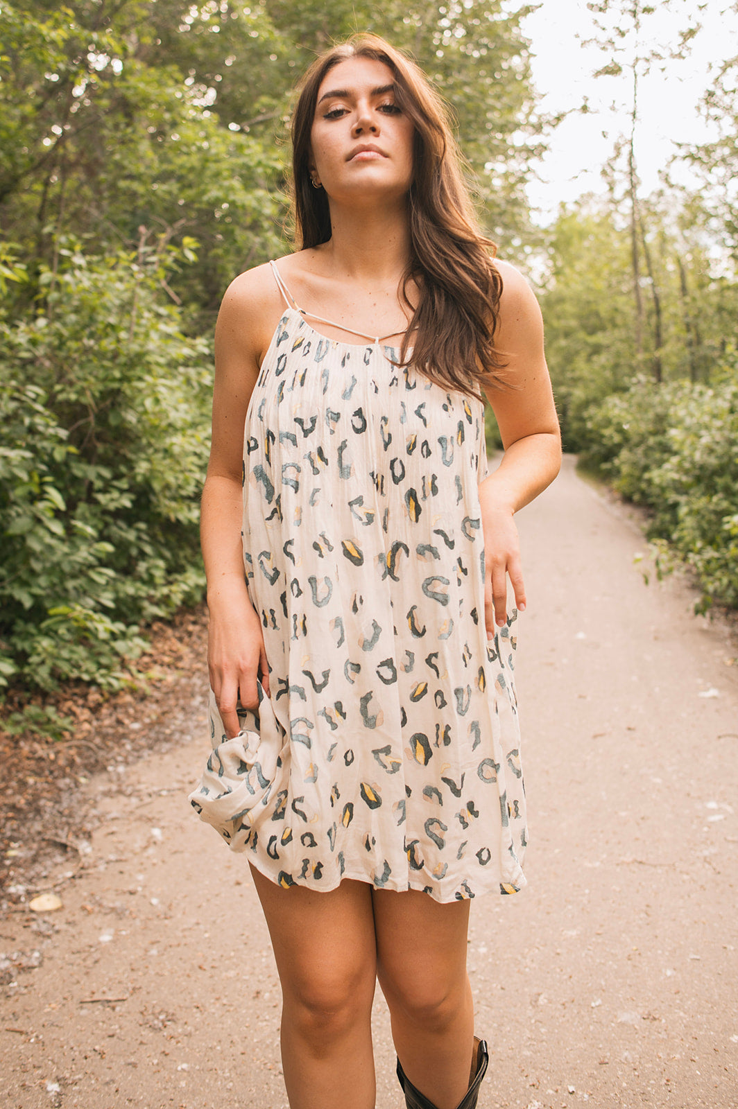 Take a walk on the wild side this summer with this mini! She's so flowy and perfect for those hot hot summer days. The neck detail and muted leopard print help her stand out from the crowd.
