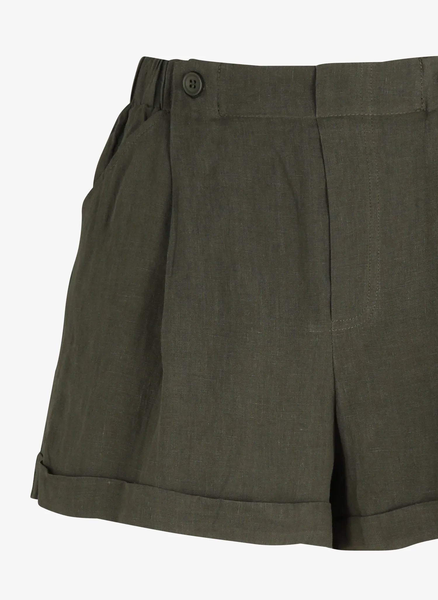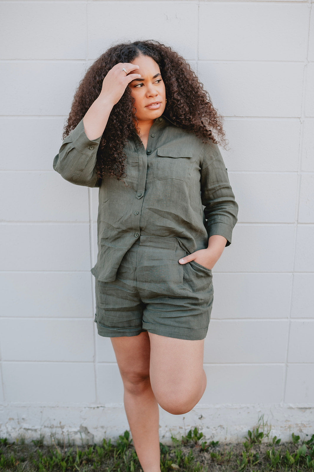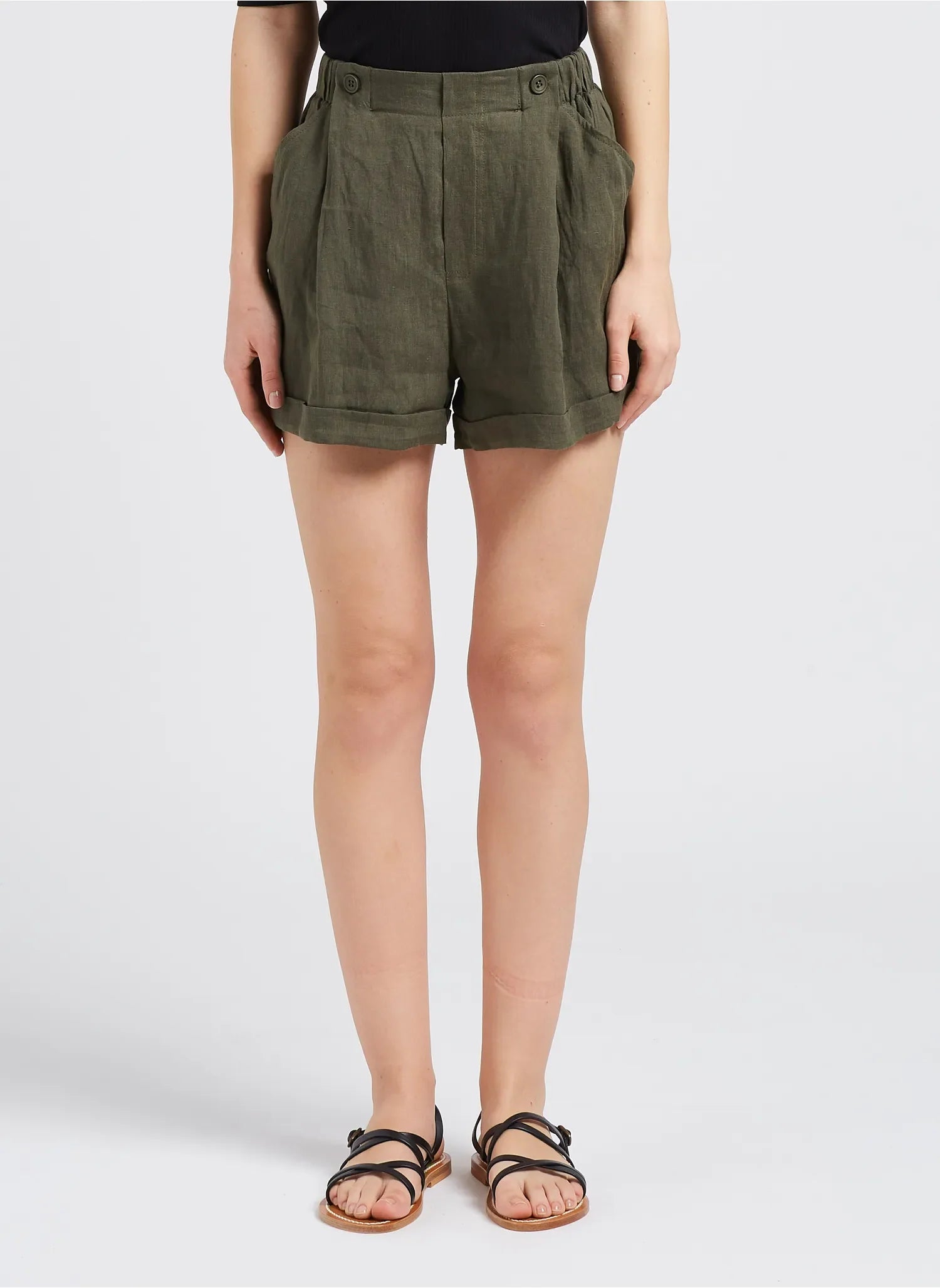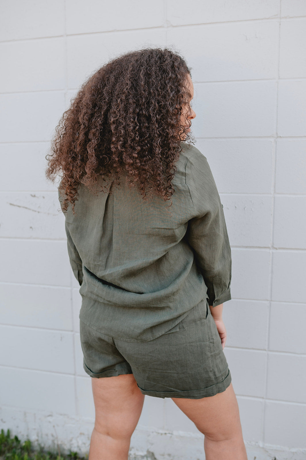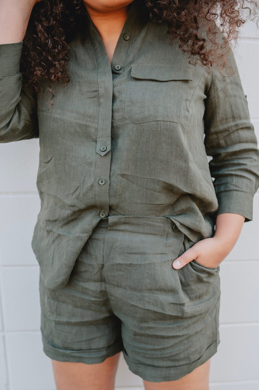 These shorts quickly won us over with their fit and breezy linen material. They're a higher rise which gives comfort and support, but they're still long enough to keep you covered up. The button front details give a touch of a dressier feel to the look making them that much easier to style. Try pairing them with the matching 3/4 length top for a whole look!