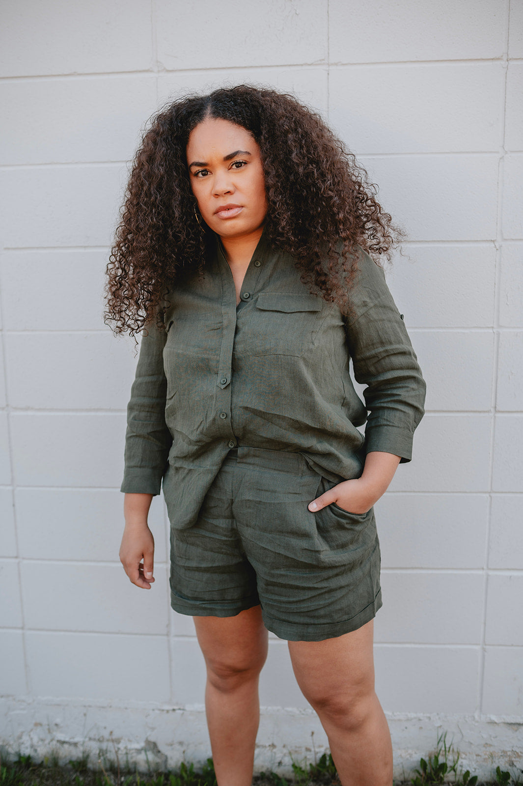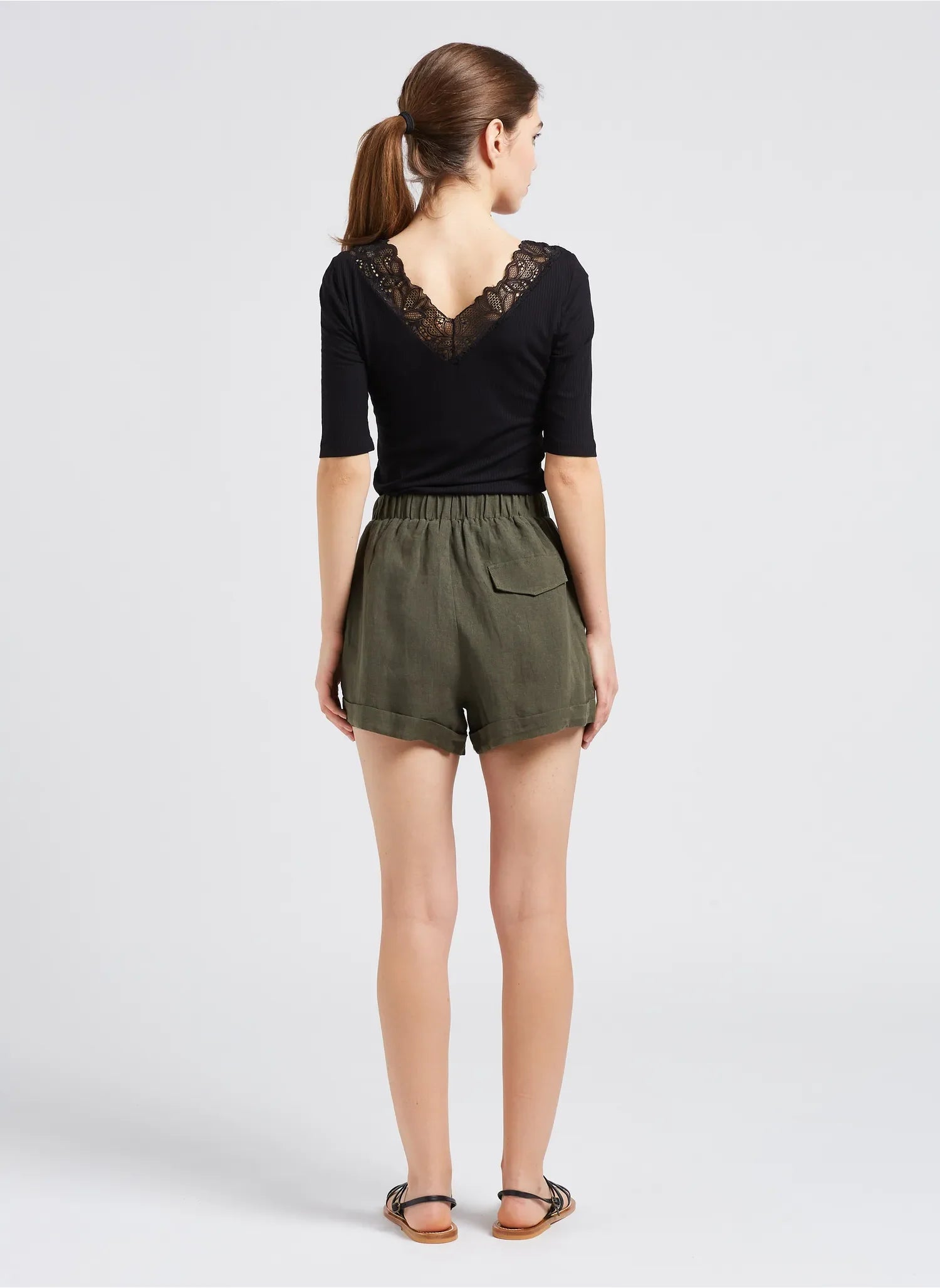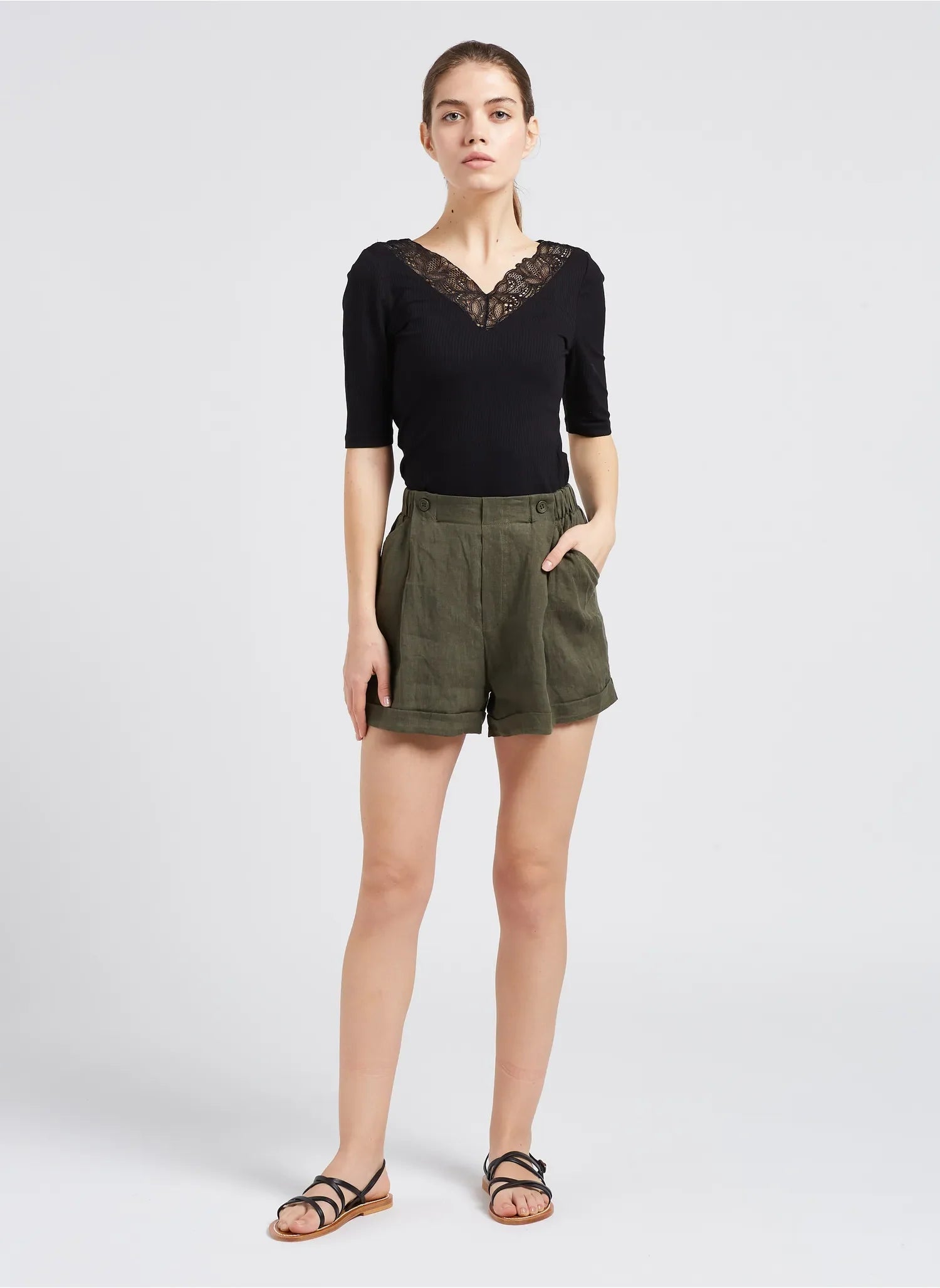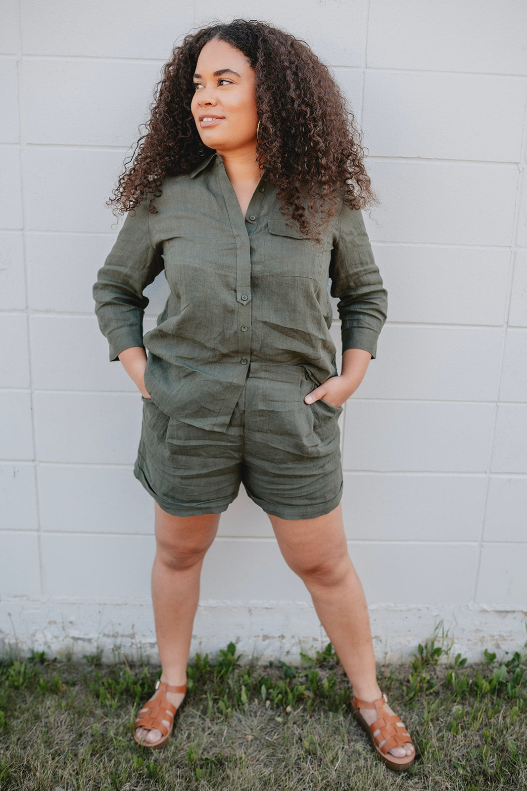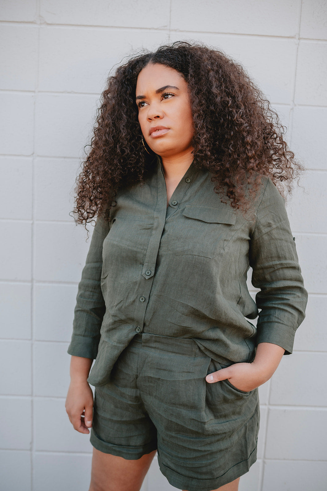 These shorts quickly won us over with their fit and breezy linen material. They're a higher rise which gives comfort and support, but they're still long enough to keep you covered up. The button front details give a touch of a dressier feel to the look making them that much easier to style. Try pairing them with the matching 3/4 length top for a whole look!