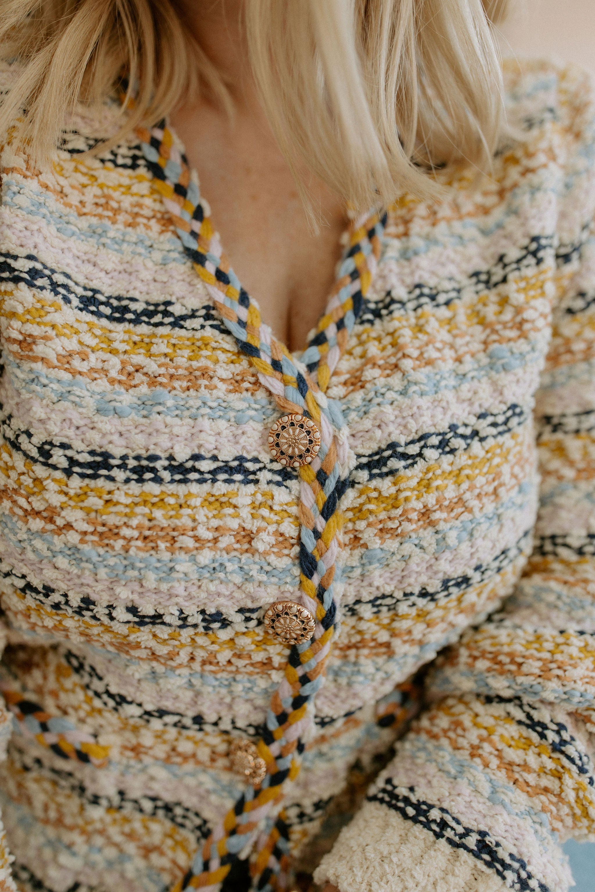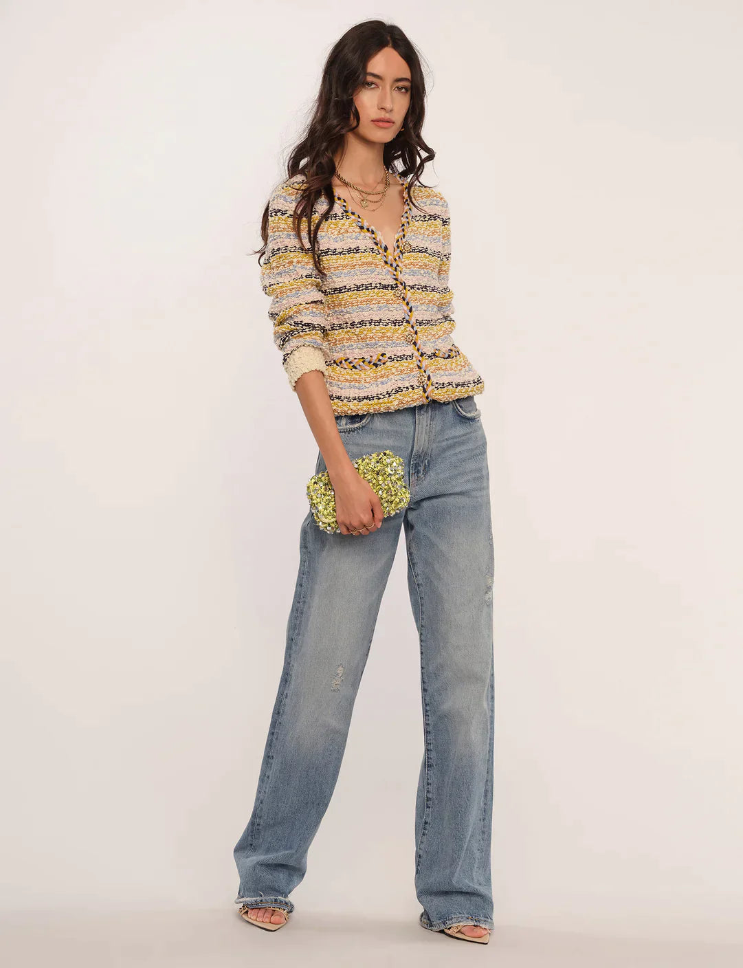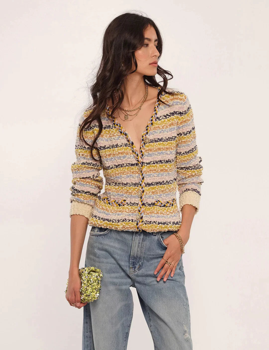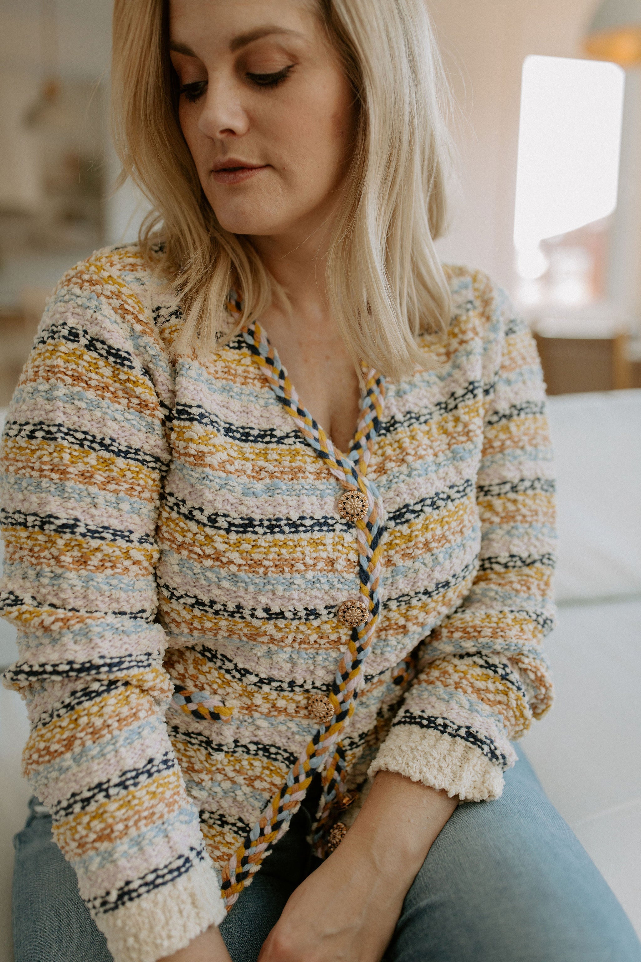 The Louise Cardi is a soft cardi made of our multi-colour knit. It has a relaxed fit with golden novelty buttons, and braided trim detailing. Pair it with your favourite denim and ankle boots.