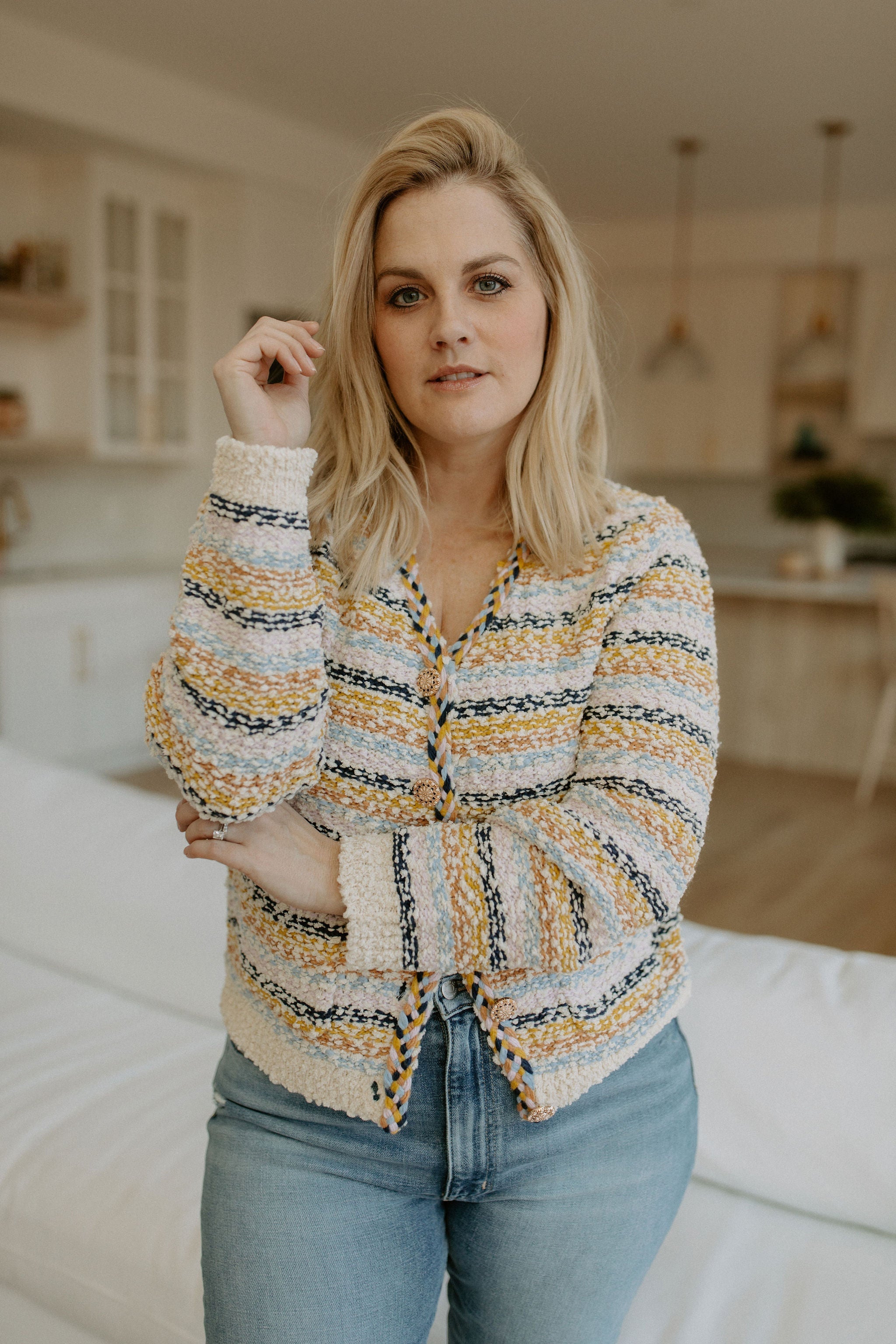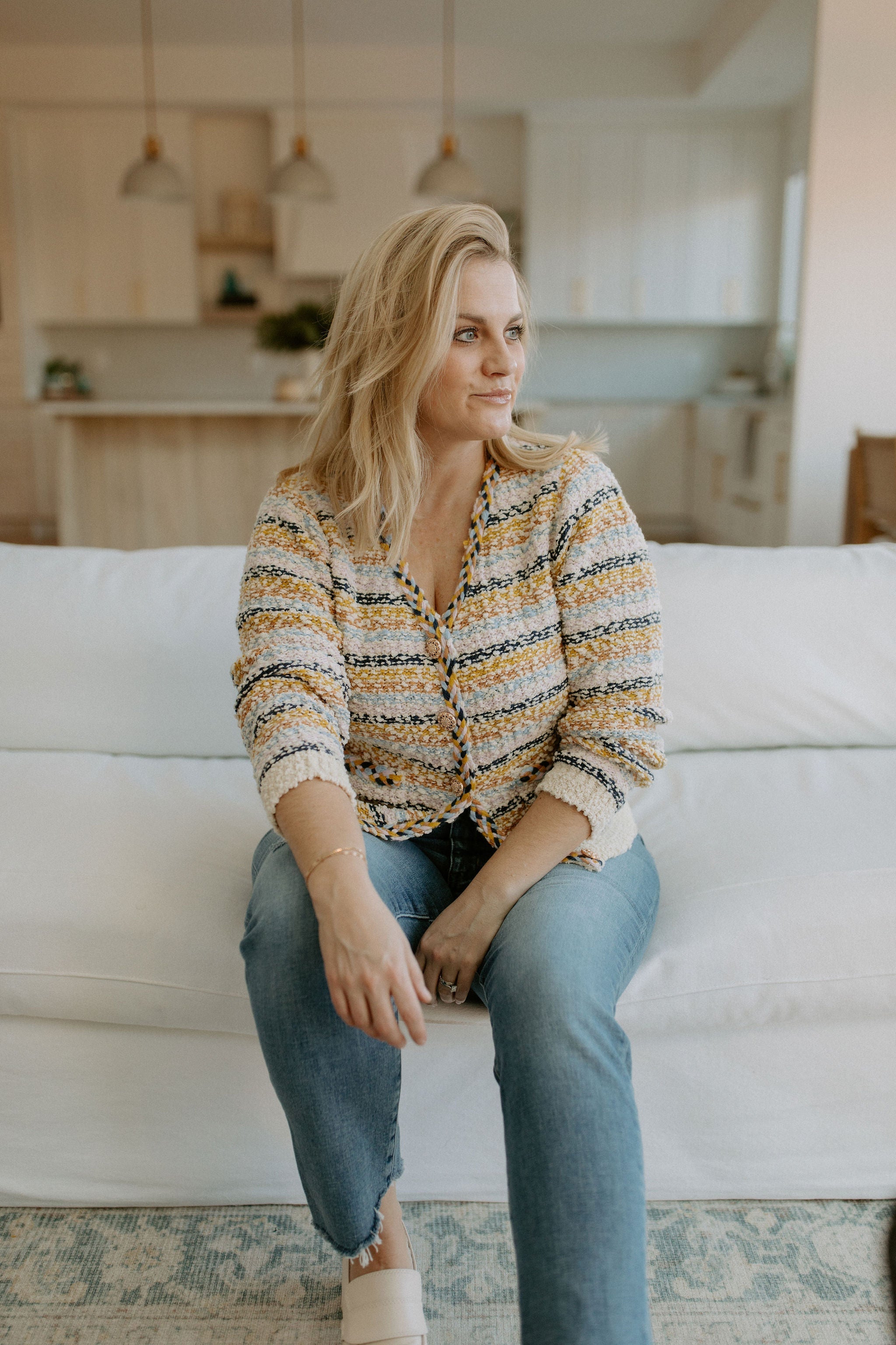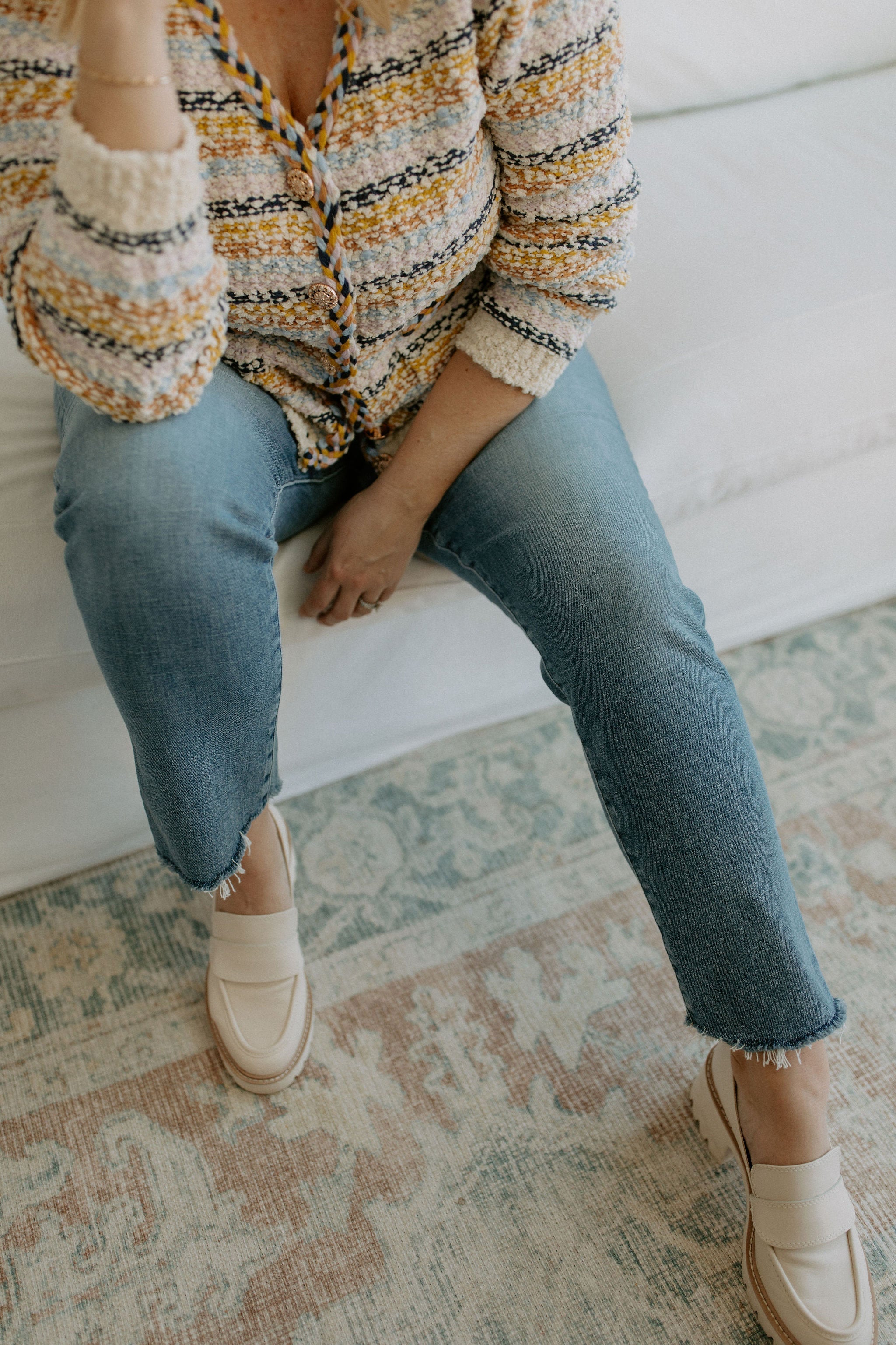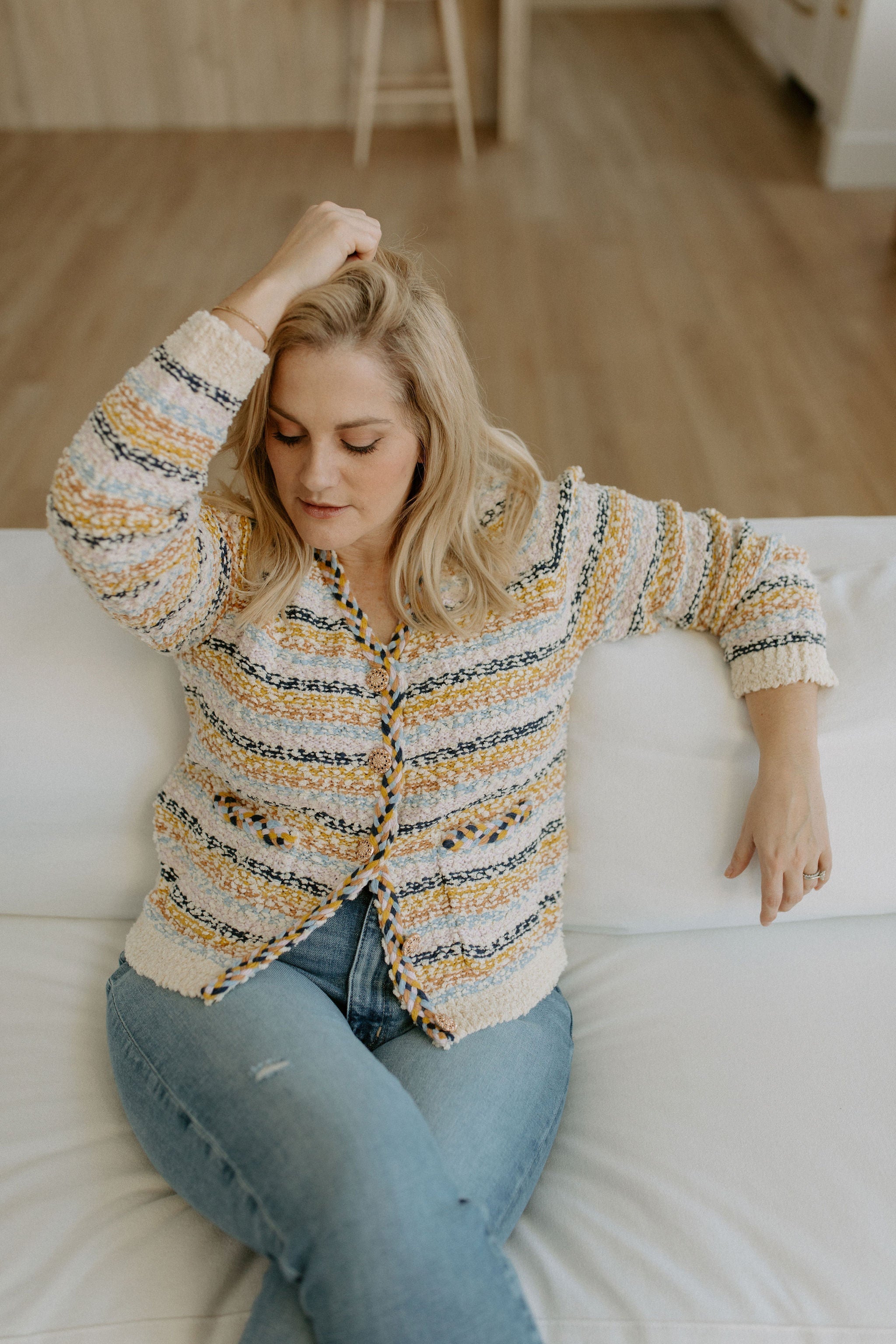 The Louise Cardi is a soft cardi made of our multi-colour knit. It has a relaxed fit with golden novelty buttons, and braided trim detailing. Pair it with your favourite denim and ankle boots.
