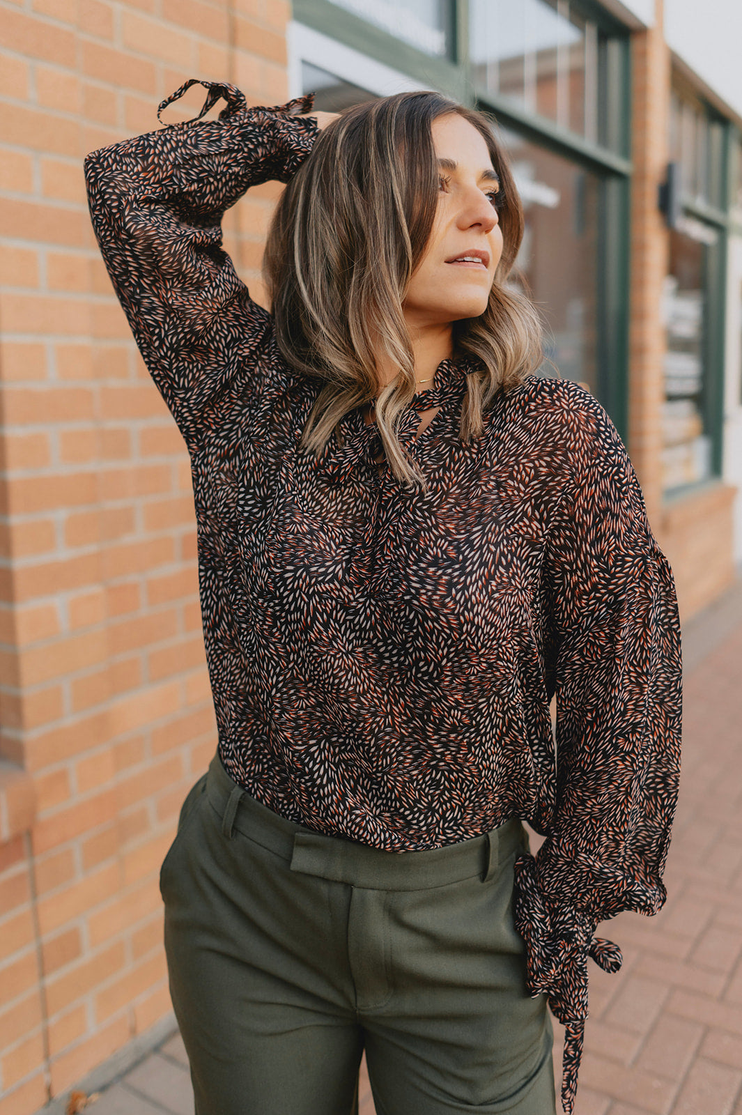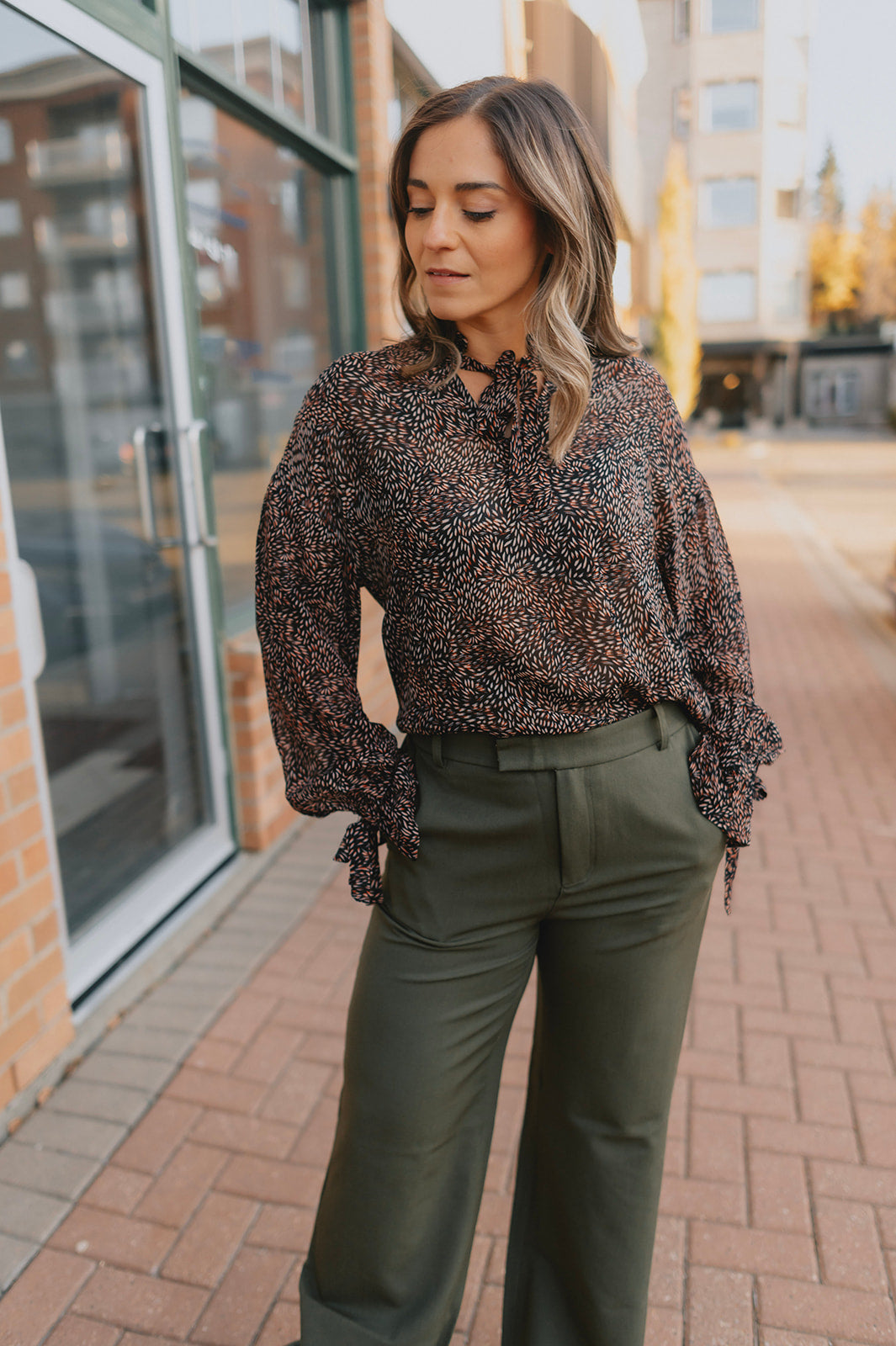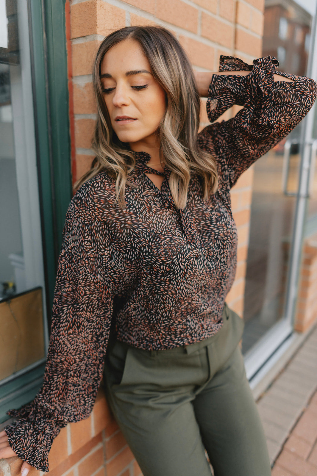 This blouse is a showstopper! Great for work or out on the town - her detailing and pattern make her an instant classic. Sky is the limit with this beauty.