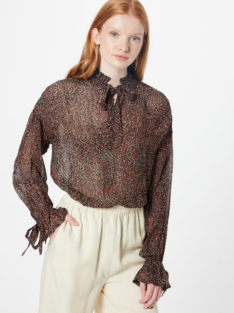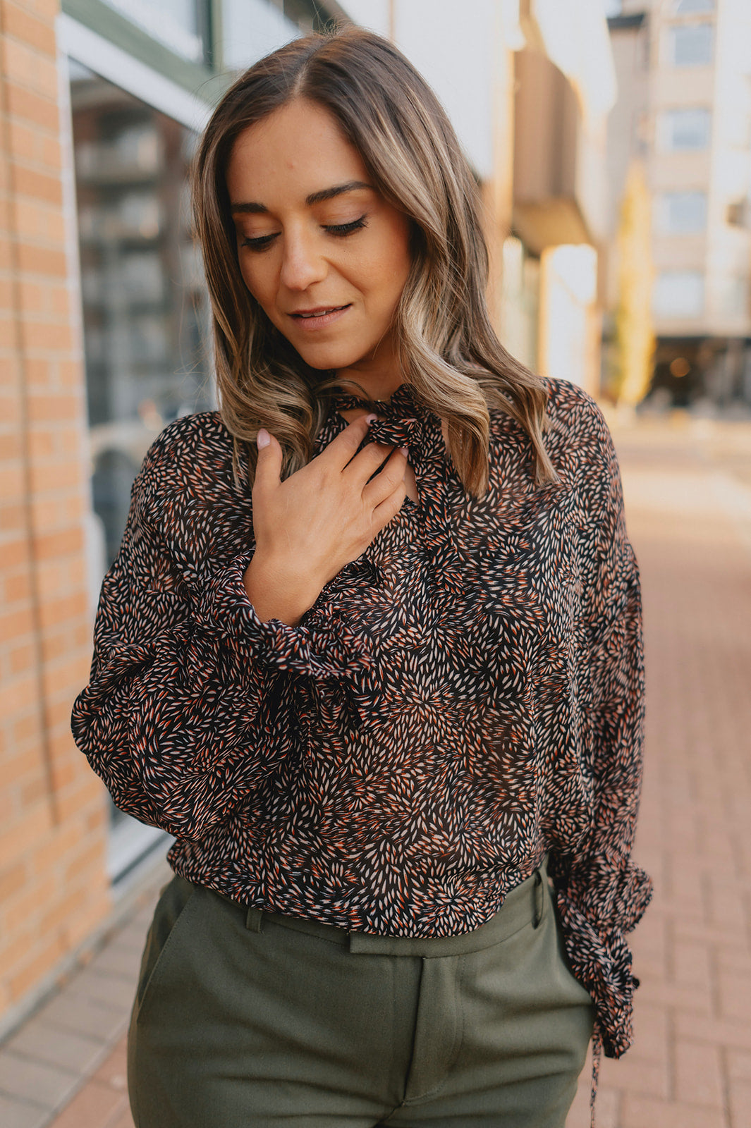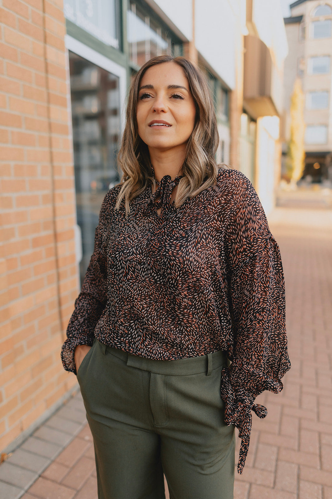 This blouse is a showstopper! Great for work or out on the town - her detailing and pattern make her an instant classic. Sky is the limit with this beauty.