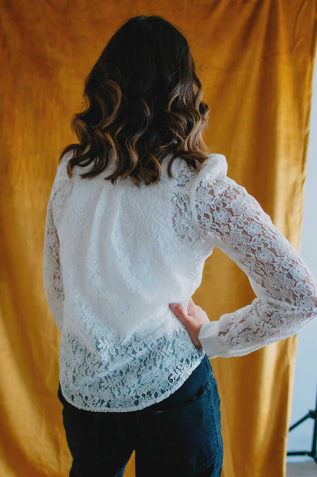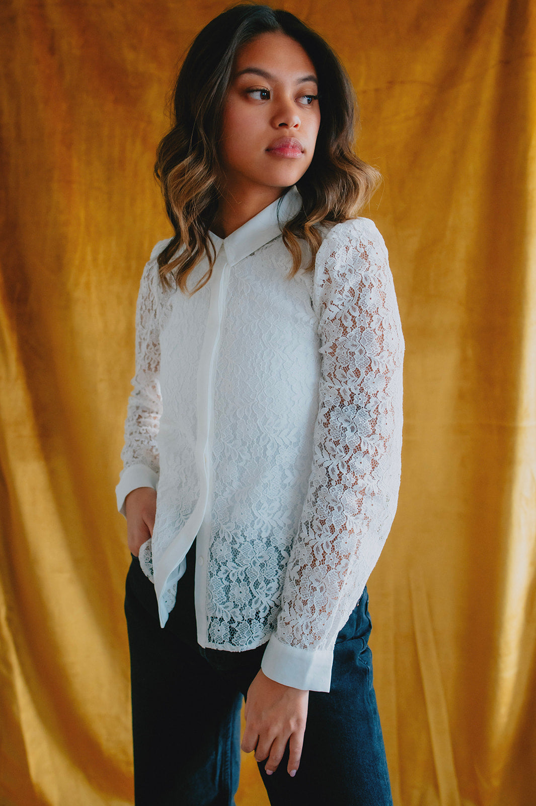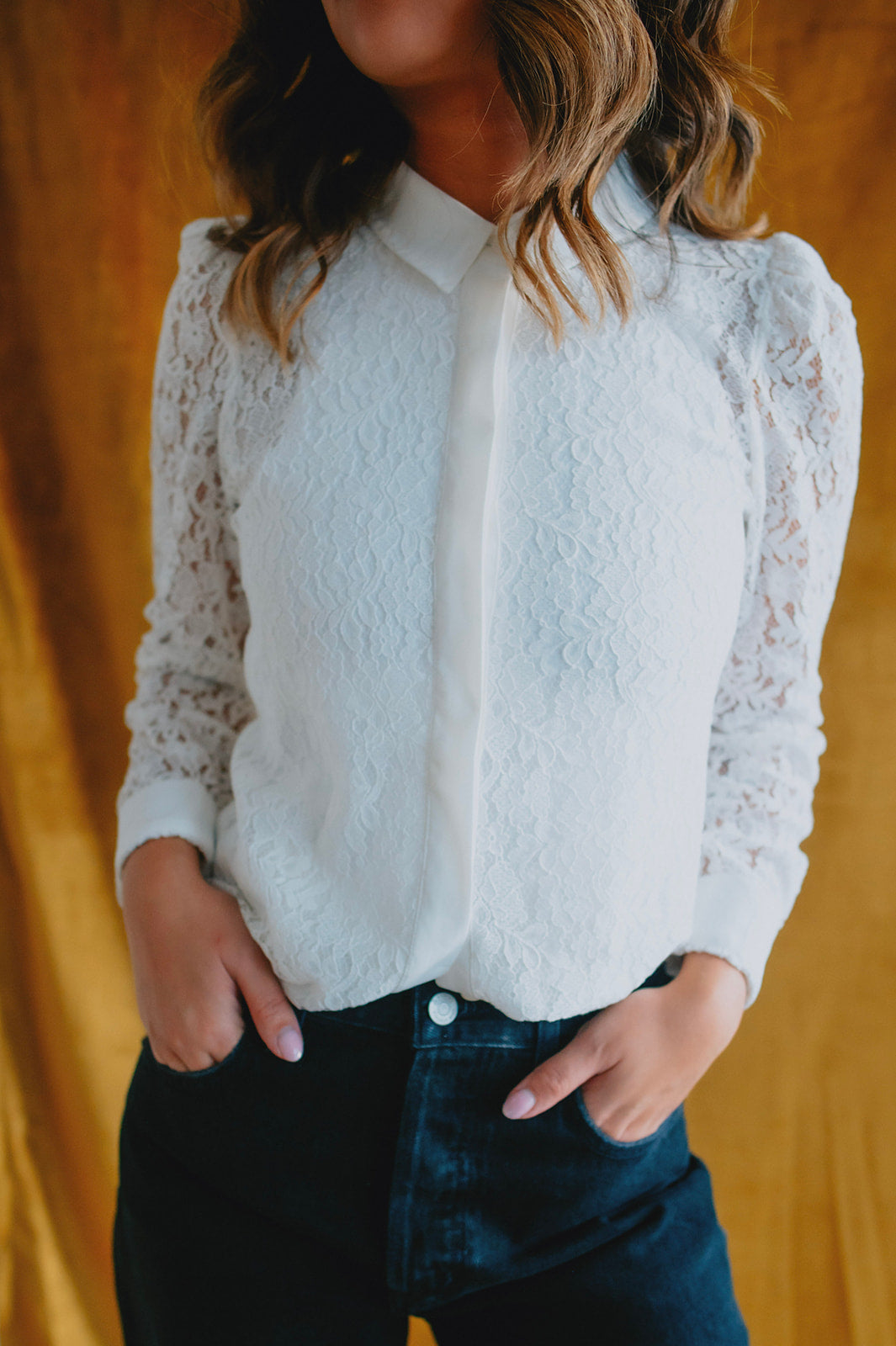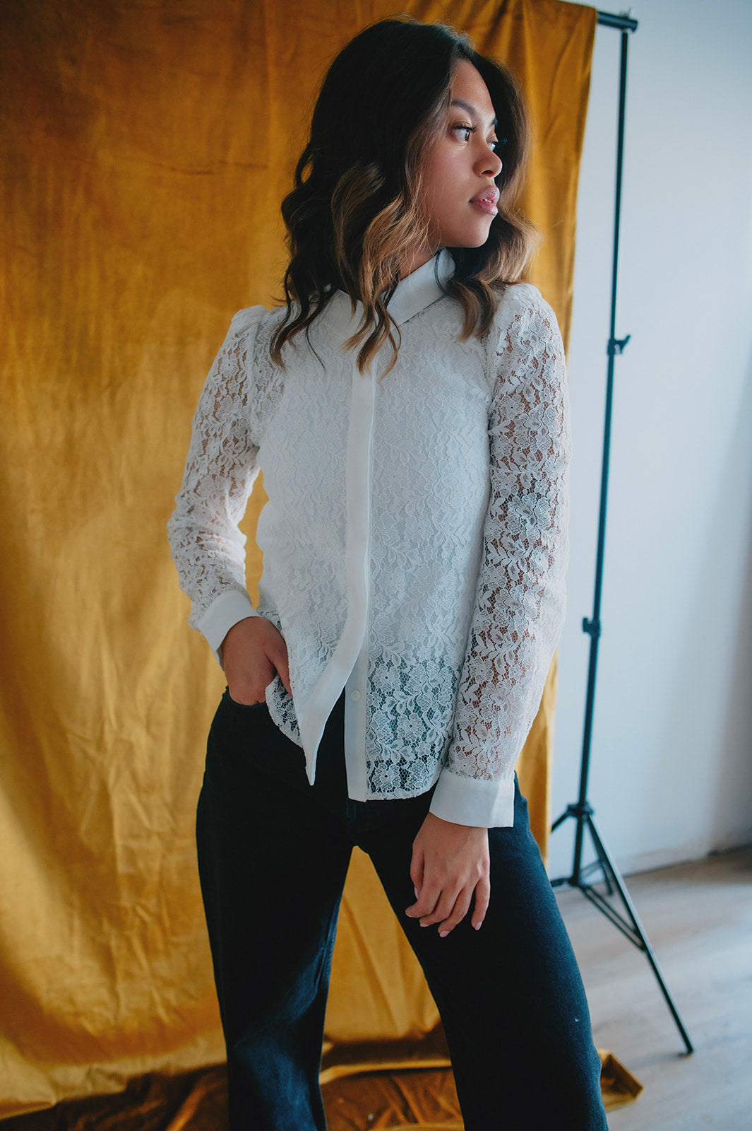 The Rennie Top is a twist on a classic, perfect for the fall season. Made of fine lace, it has a button down closure and is slim fitting. Pair with your favourite denim or layer under a vest.