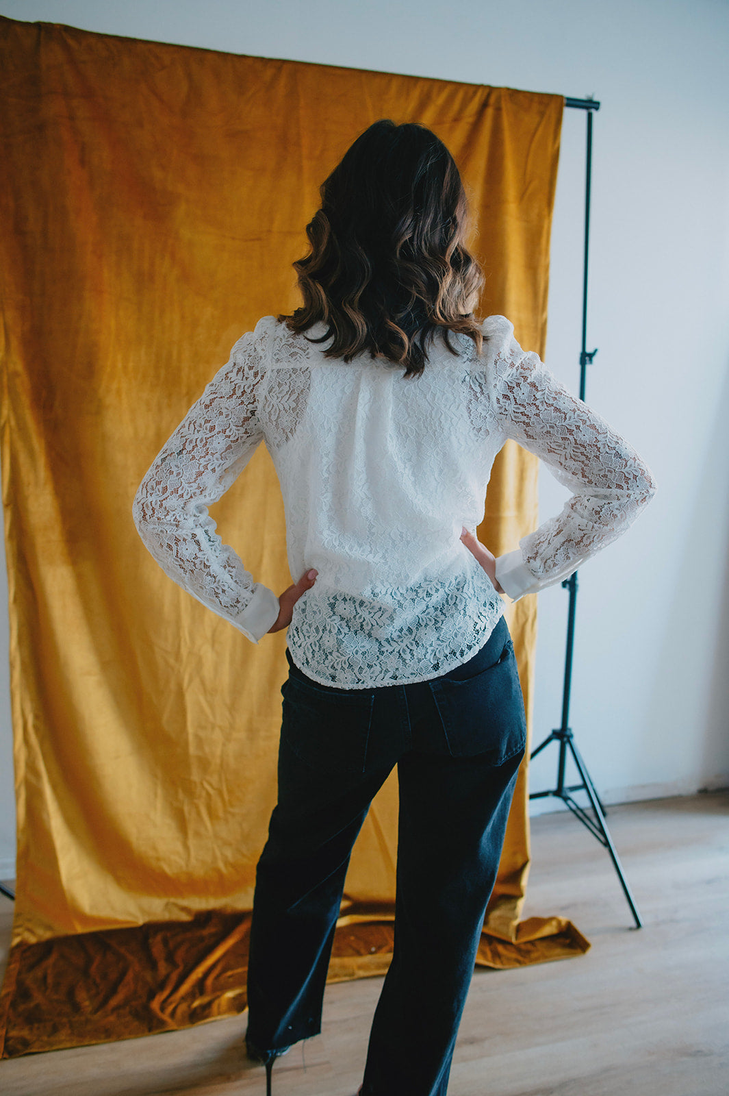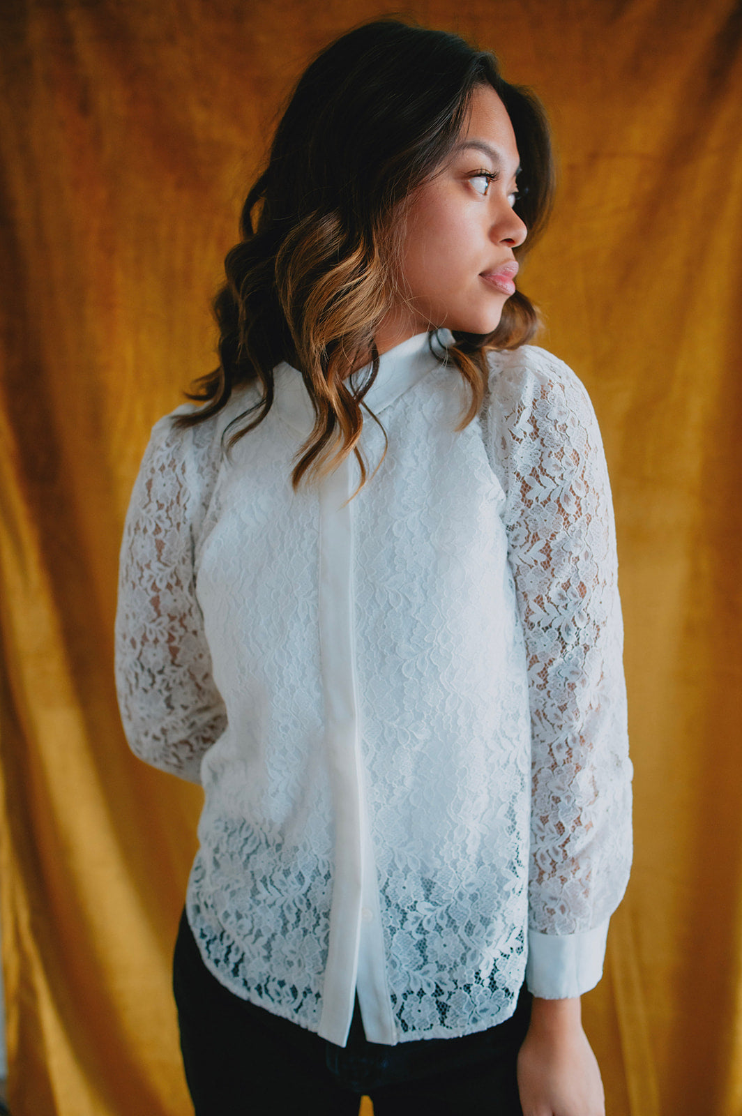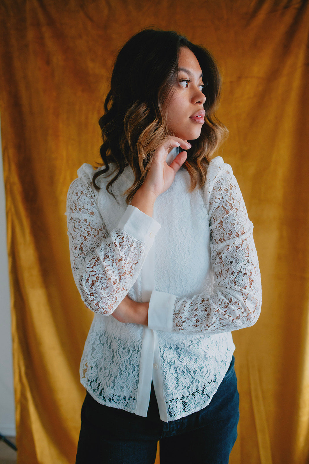 The Rennie Top is a twist on a classic, perfect for the fall season. Made of fine lace, it has a button down closure and is slim fitting. Pair with your favourite denim or layer under a vest.