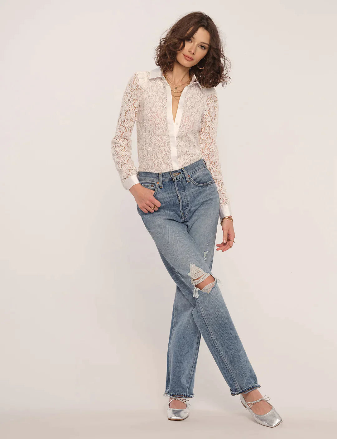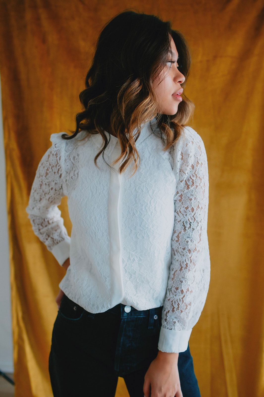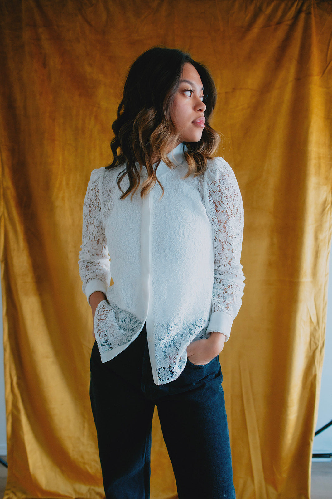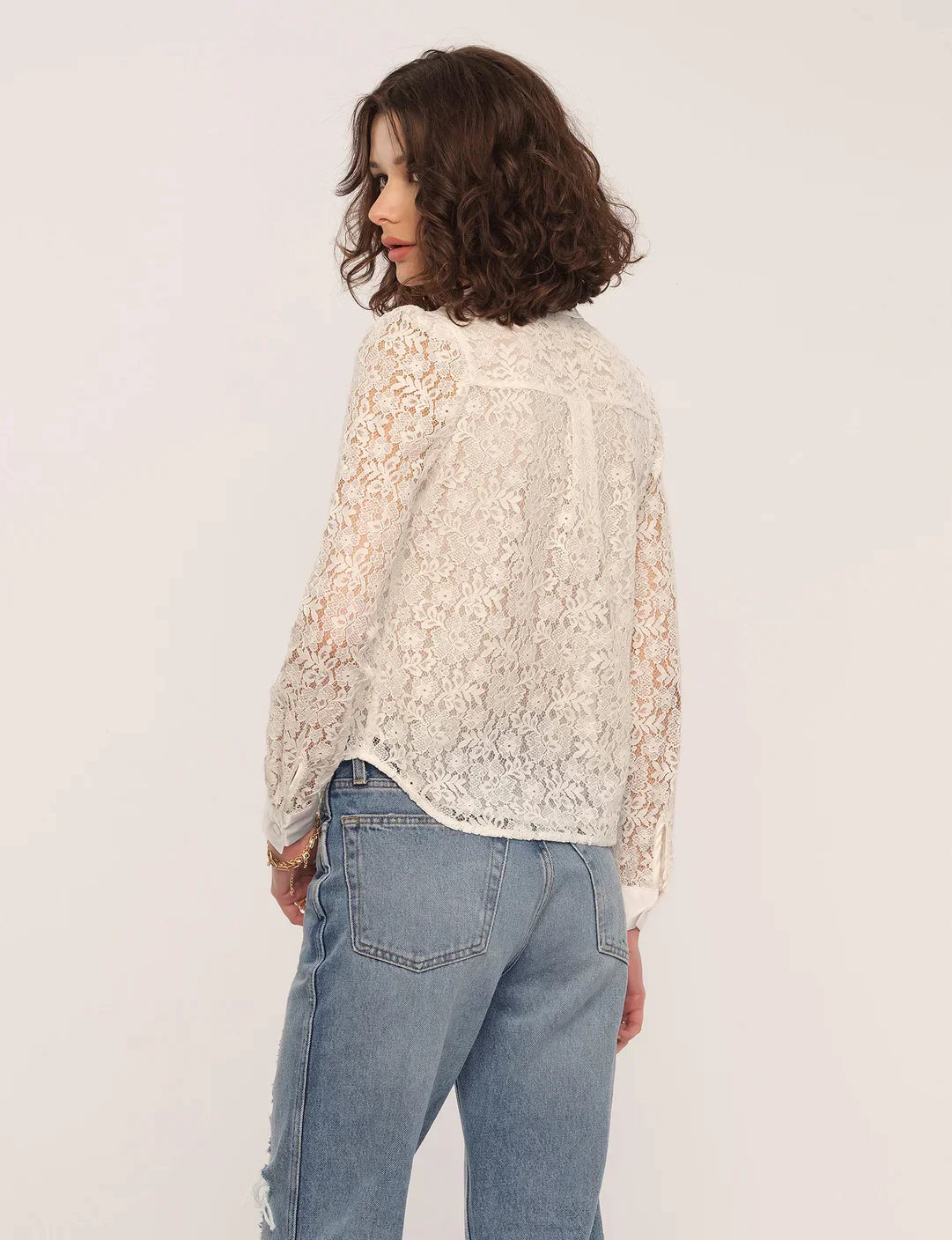 The Rennie Top is a twist on a classic, perfect for the fall season. Made of fine lace, it has a button down closure and is slim fitting. Pair with your favourite denim or layer under a vest.