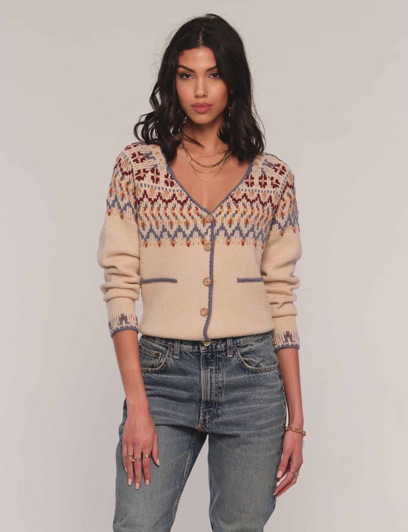 The Rima Cardigan is the perfect holiday cardi. Knit from a soft jacquard yarn it features a v-neck, delicate fair isle pattern and novelty buttons. We love it over a plain white tee, or worn alone.