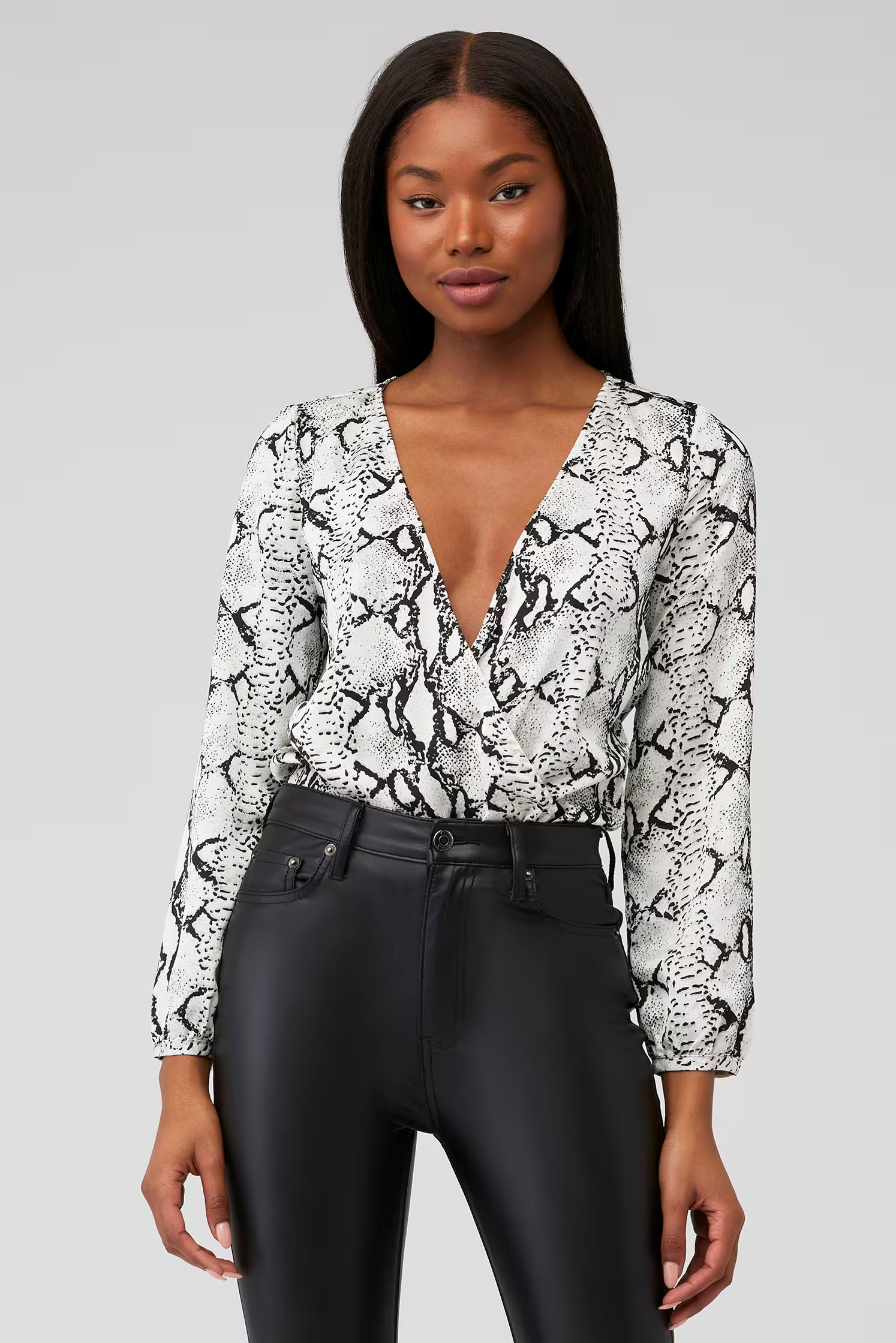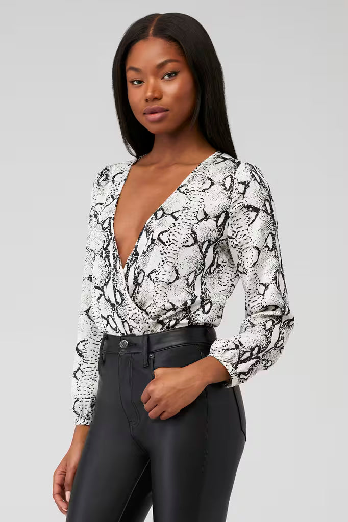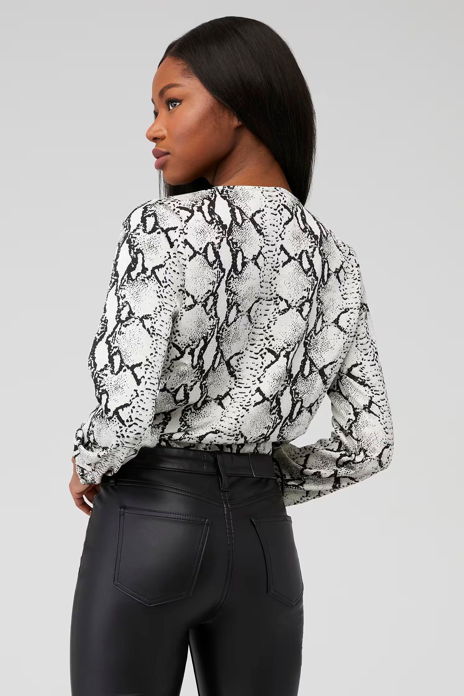 Make a bold statement with the Snake the Cake Bodysuit, where edgy meets elegant. Featuring a striking snakeskin texture in a clean white palette, this bodysuit is designed to turn heads with its plunging V-neckline that adds just the right amount of allure. Perfect for a night out, a stylish layering piece, or elevating your everyday look, this bodysuit hugs your curves in all the right places while keeping you confidently secure.