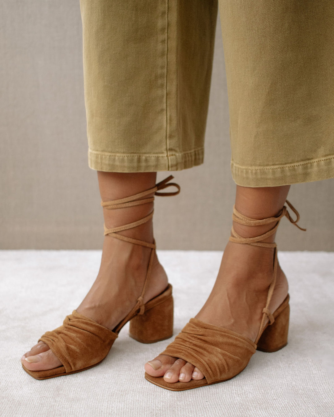 Ruffled front covering, leaving an open toe. Criss cross straps up the ankle for a comfortable hold. Featuring a soft edged block heel.