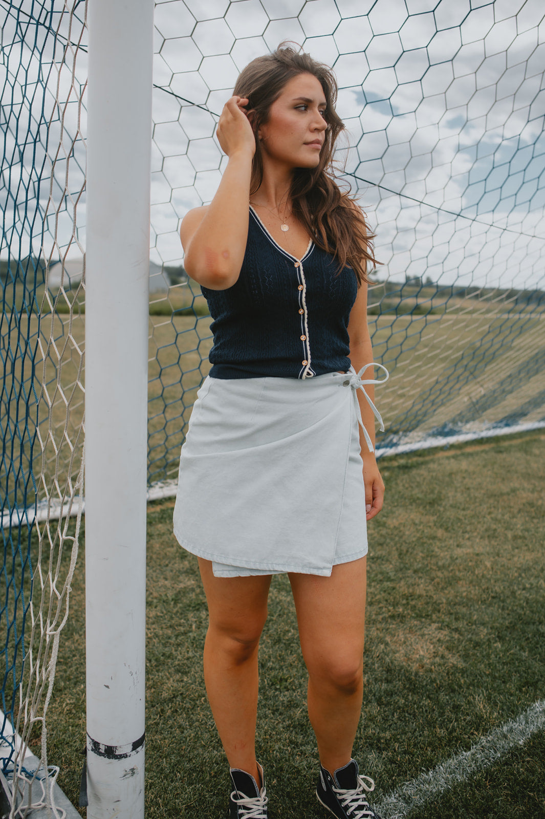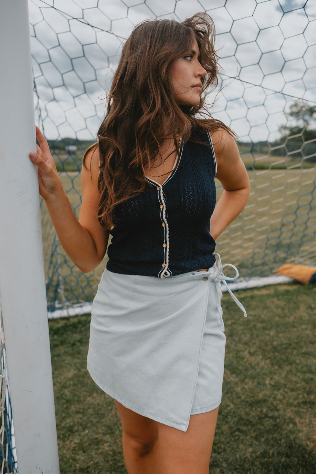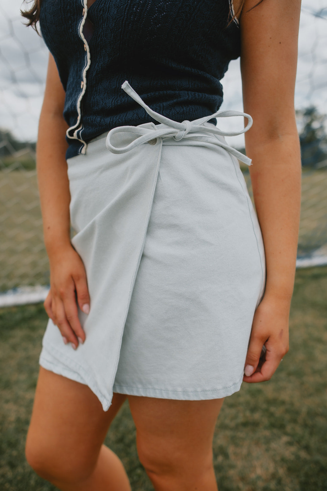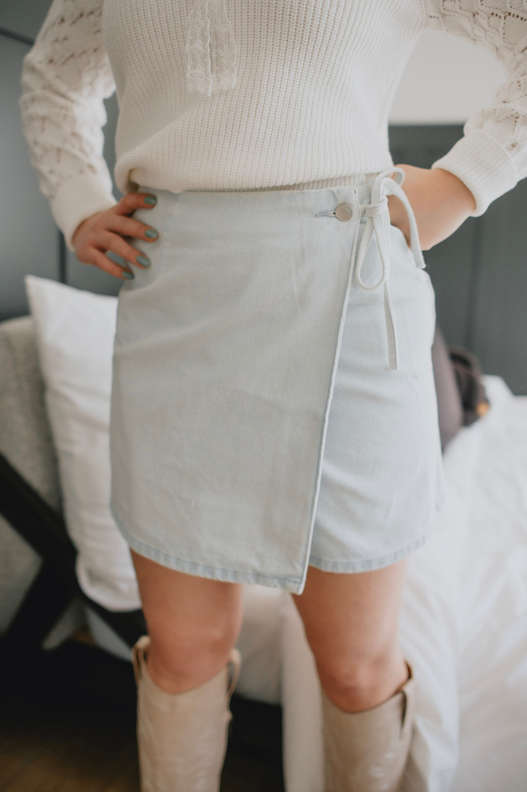 The Cassandra is a short, light blue denim skirt that will pair beautifully with your favourite top. We love that she's made from stretch cotton denim and she's short without being too mini. The wrap style stays put with two buttons (one inside the waistband, one outside) and a side tie. We'll be paring her with a cute sweater for now and then our favourite tee or tank when things warm up!
