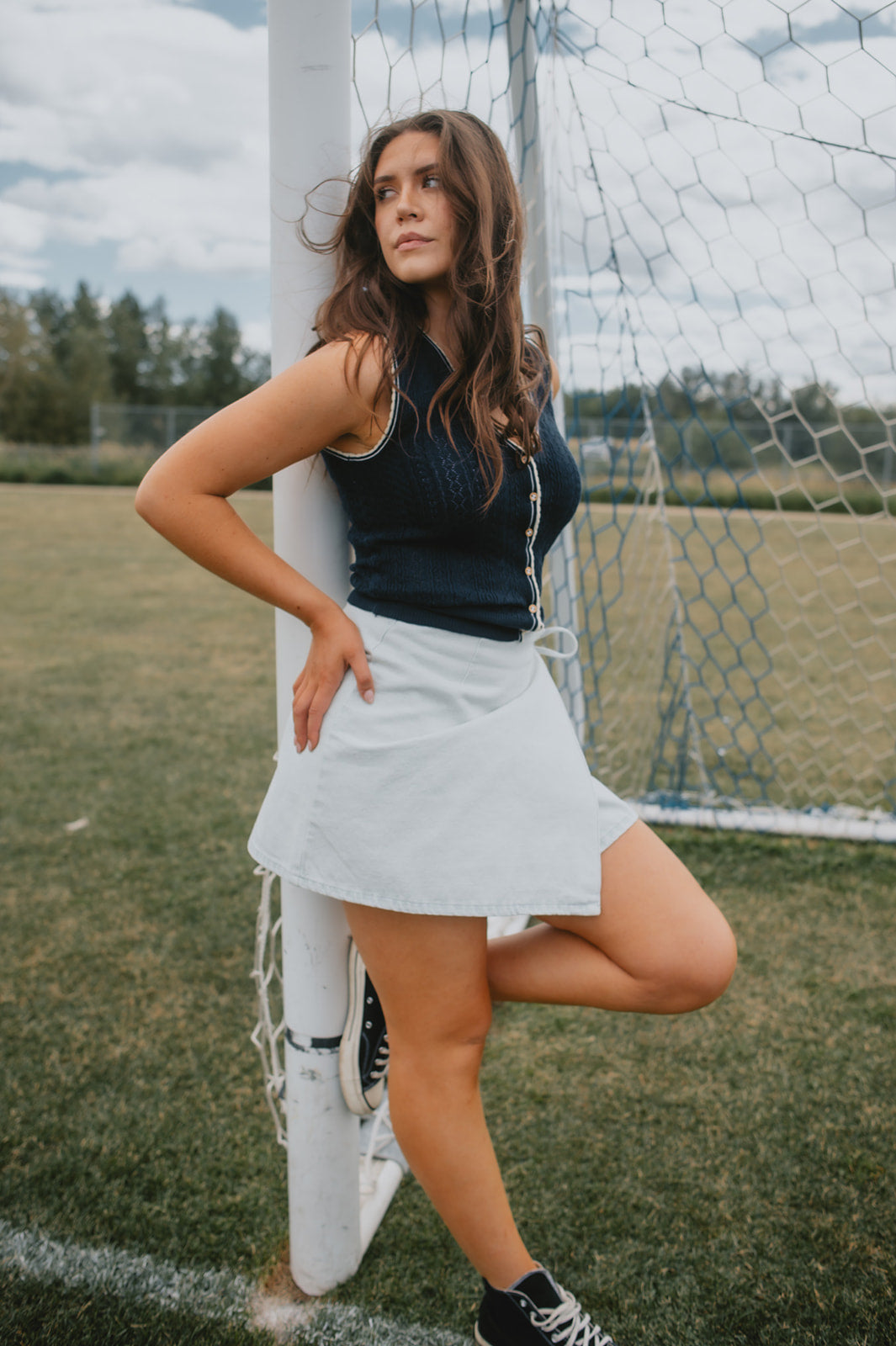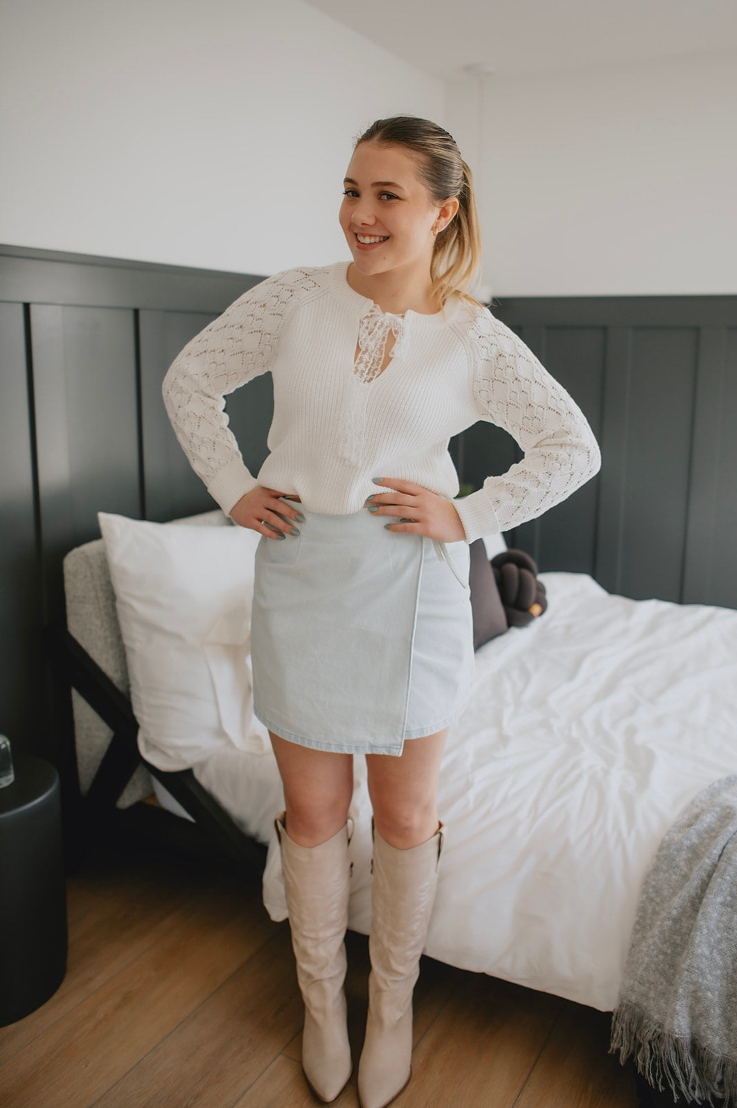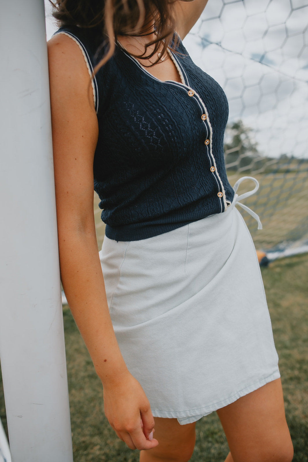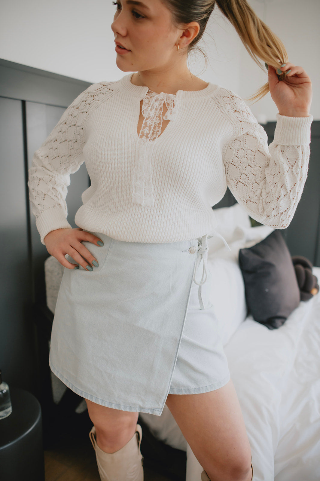 The Cassandra is a short, light blue denim skirt that will pair beautifully with your favourite top. We love that she's made from stretch cotton denim and she's short without being too mini. The wrap style stays put with two buttons (one inside the waistband, one outside) and a side tie. We'll be paring her with a cute sweater for now and then our favourite tee or tank when things warm up!
