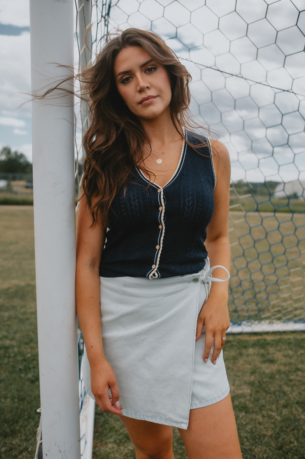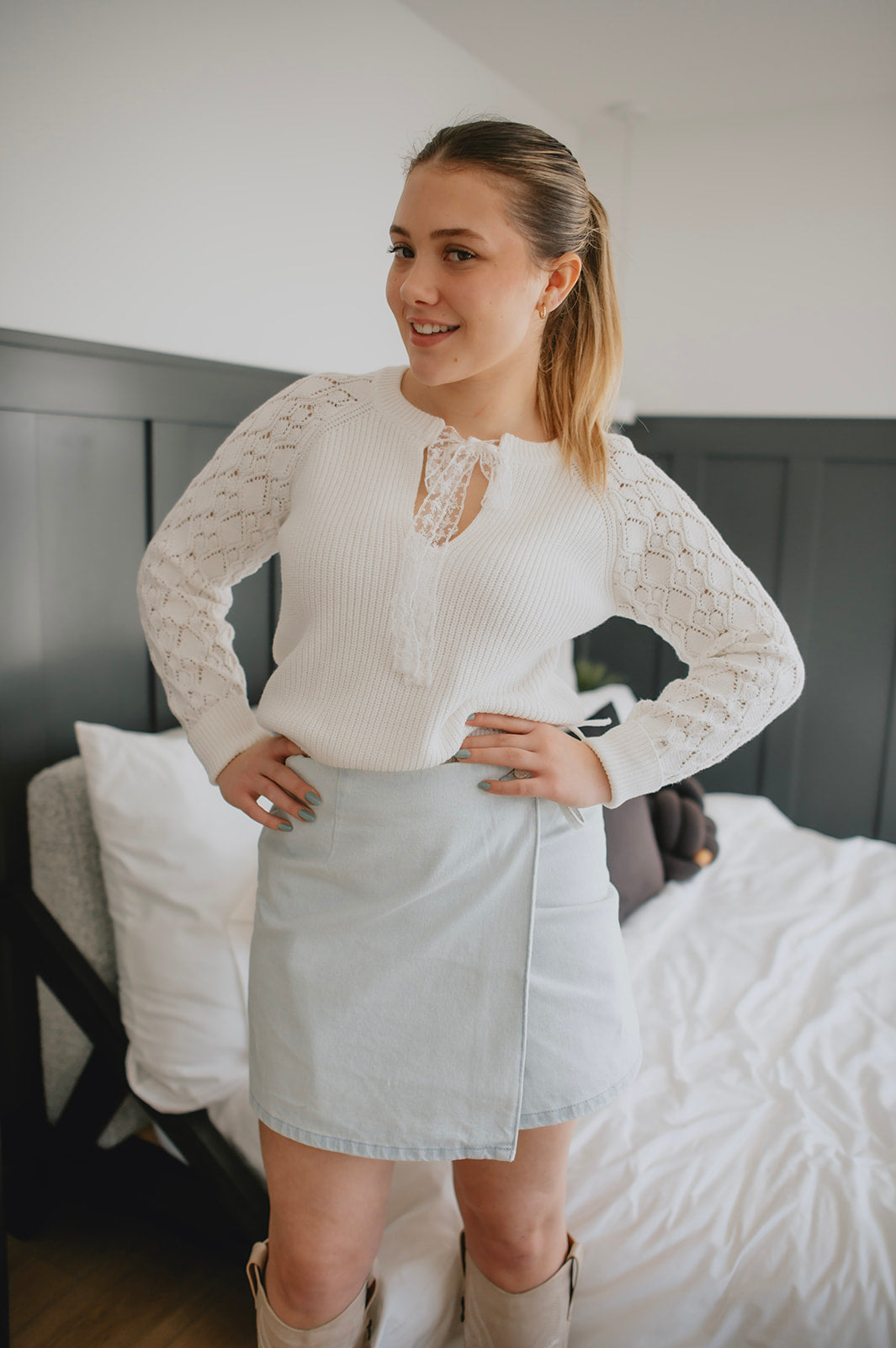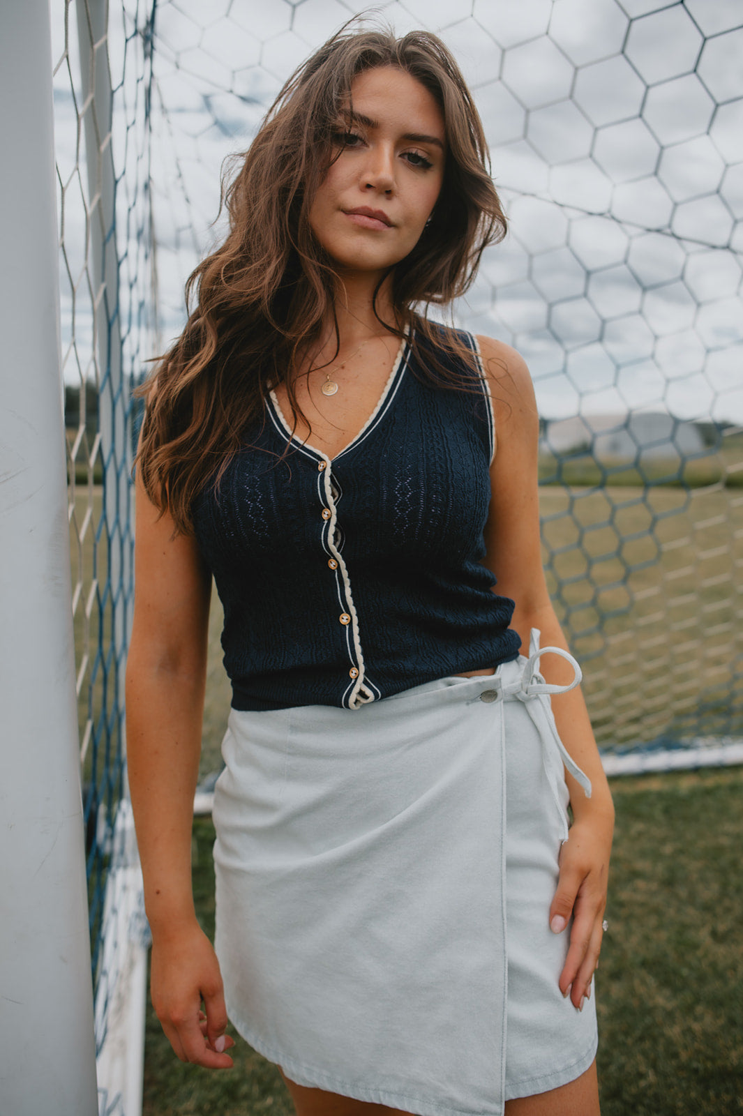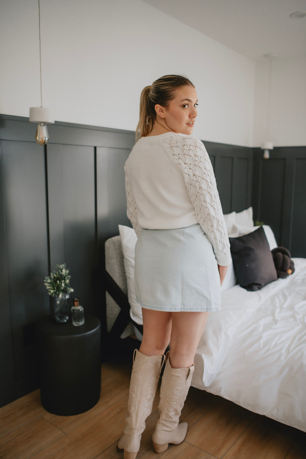 The Cassandra is a short, light blue denim skirt that will pair beautifully with your favourite top. We love that she's made from stretch cotton denim and she's short without being too mini. The wrap style stays put with two buttons (one inside the waistband, one outside) and a side tie. We'll be paring her with a cute sweater for now and then our favourite tee or tank when things warm up!