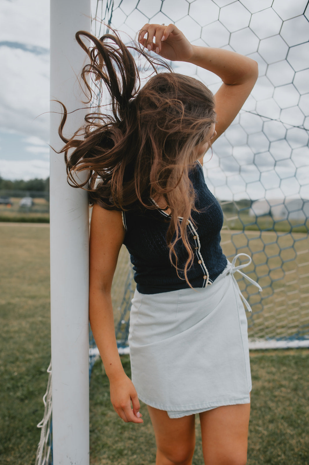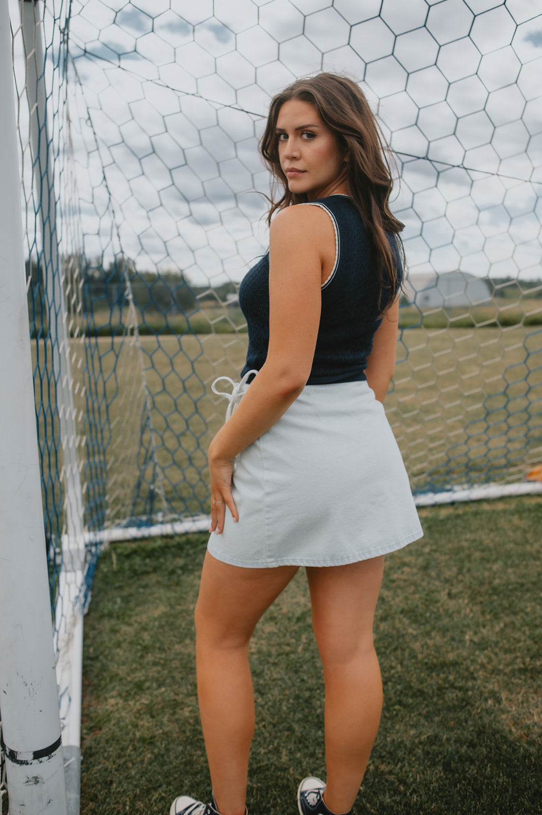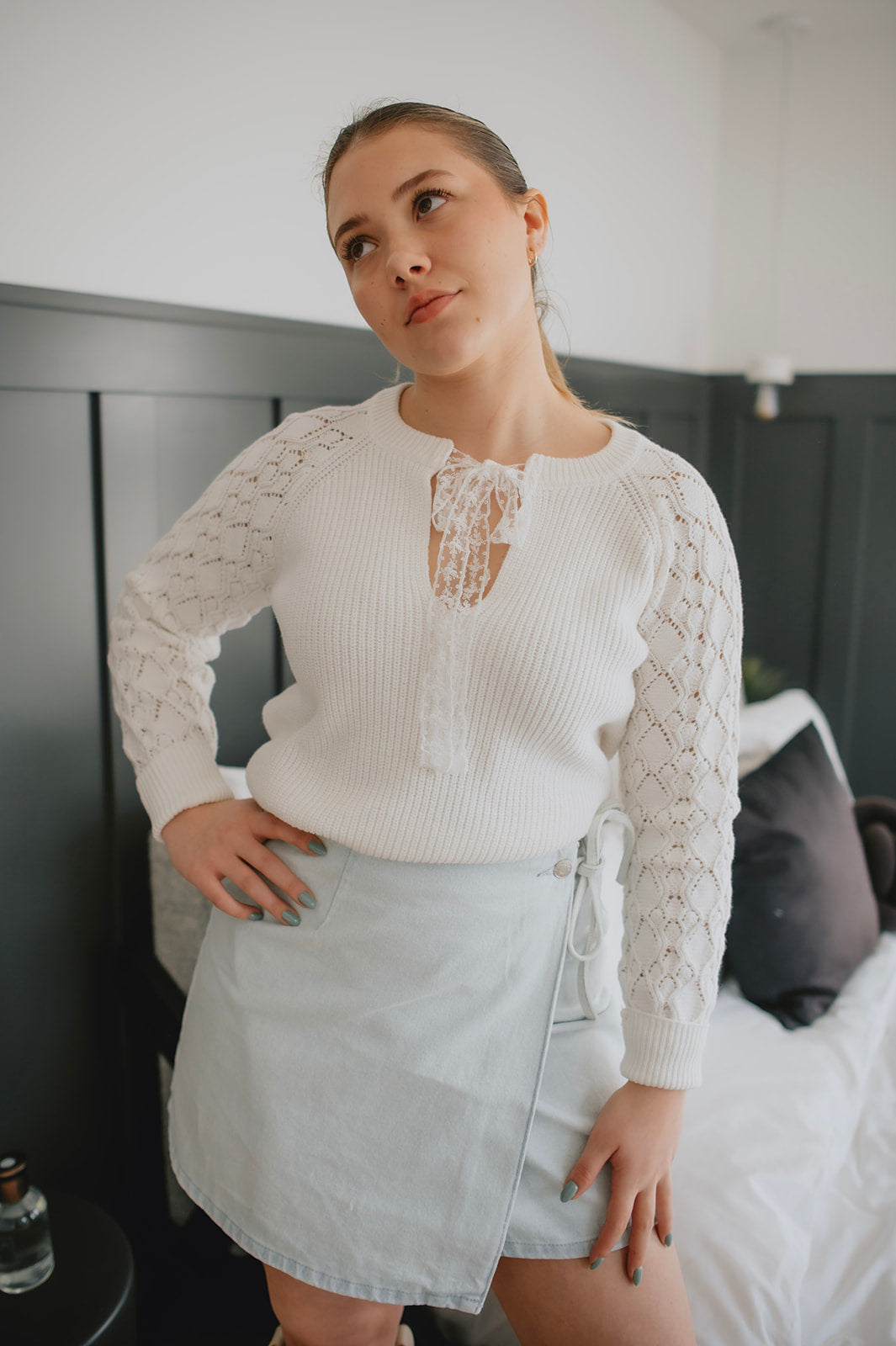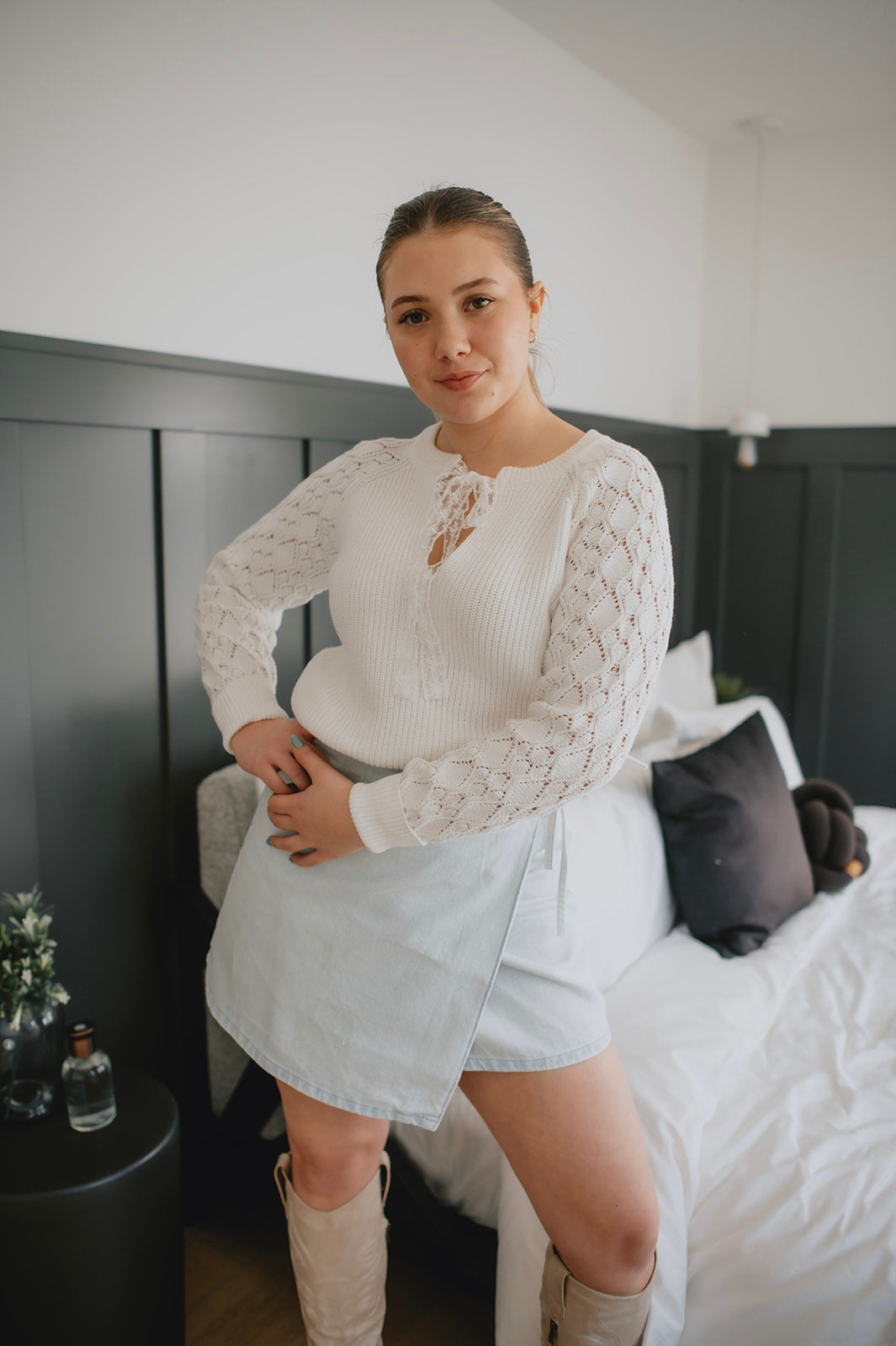 The Cassandra is a short, light blue denim skirt that will pair beautifully with your favourite top. We love that she's made from stretch cotton denim and she's short without being too mini. The wrap style stays put with two buttons (one inside the waistband, one outside) and a side tie. We'll be paring her with a cute sweater for now and then our favourite tee or tank when things warm up!