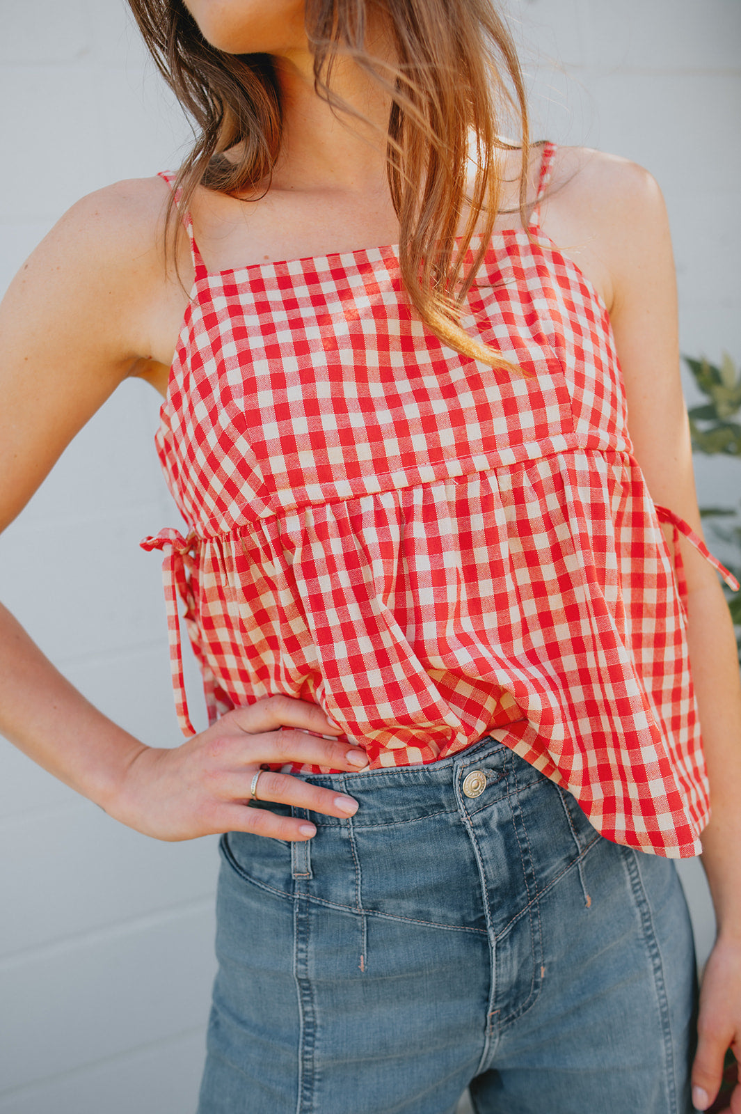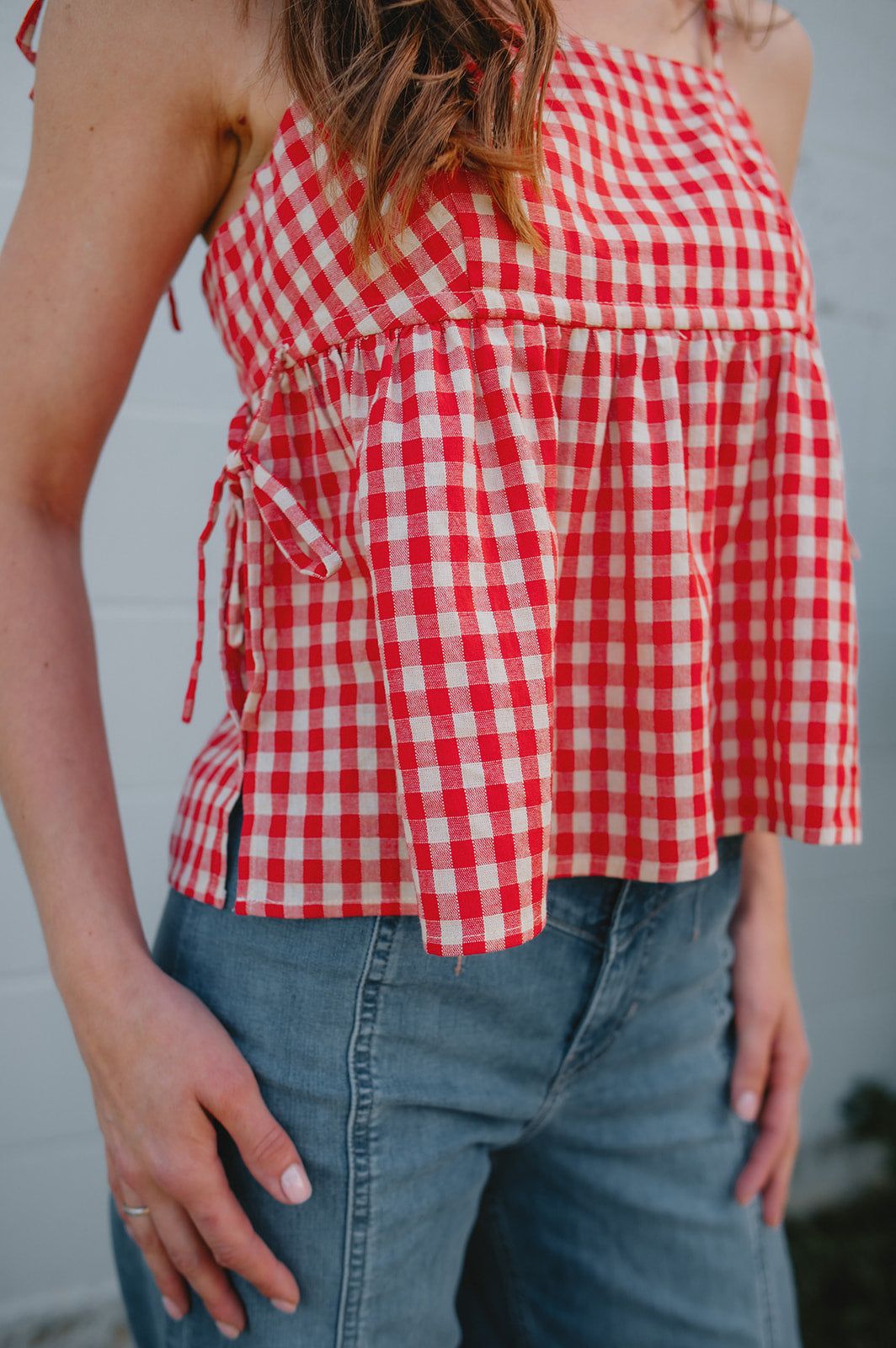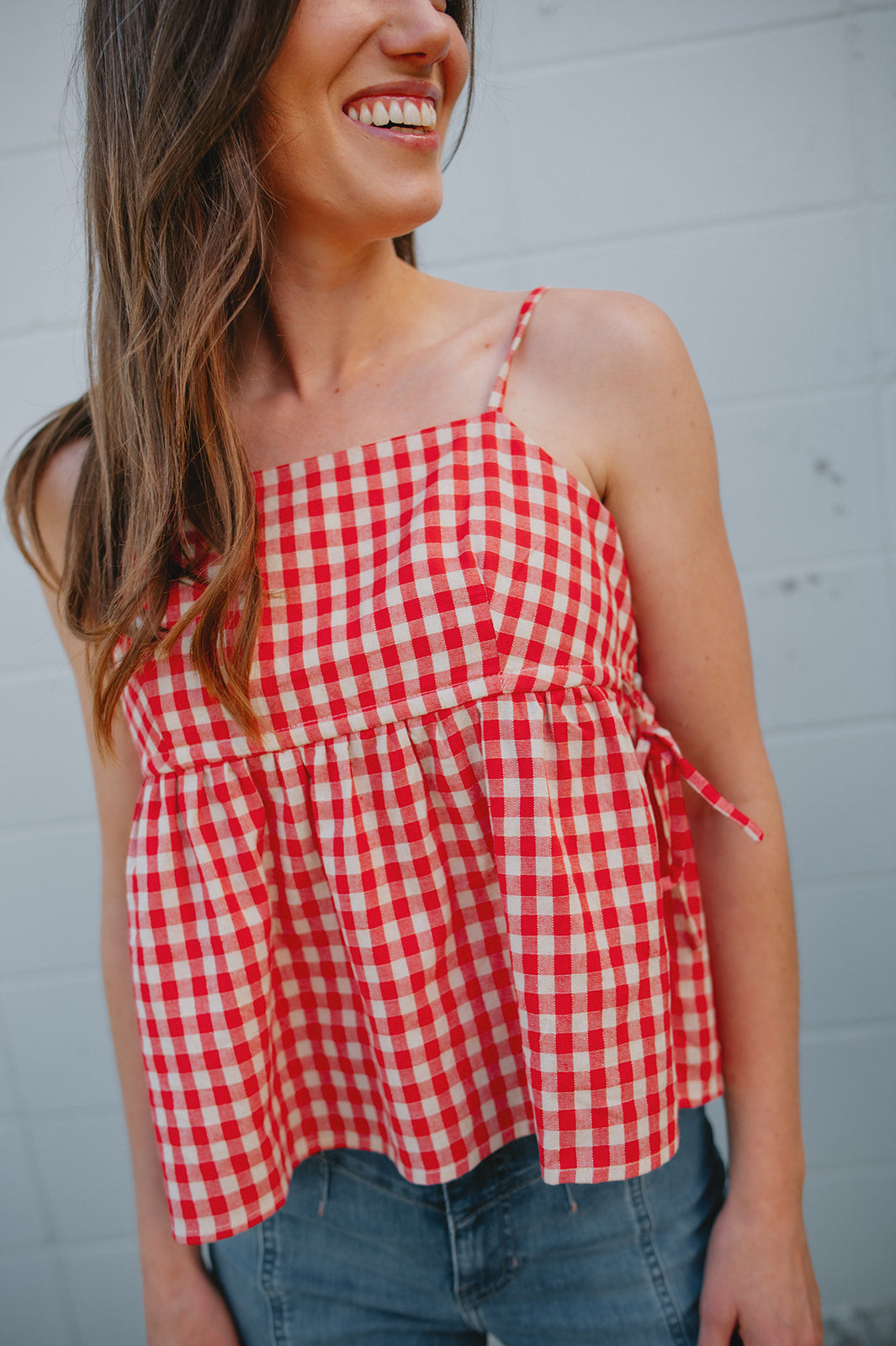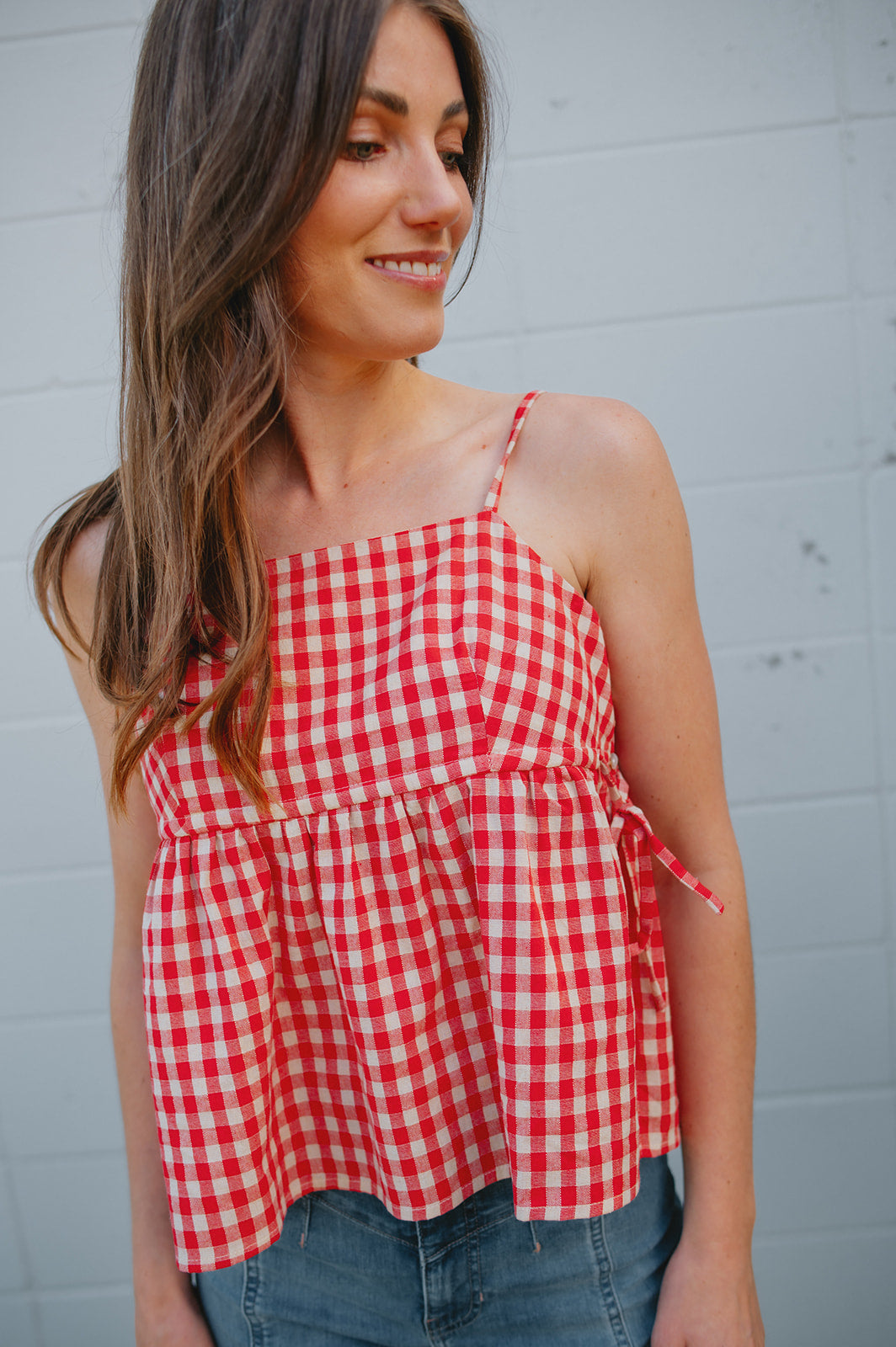5'6Introducing the FRNCH Corentine Red Top, crafted with a gingham pattern for a touch of playful sophistication. The slim adjustable straps and knots on the sides create a flattering silhouette, while the ruffles on the chest add a delicate, feminine touch. Made with soft, flowing fabric for a luxurious feel. Elevate your style with this exclusive top.