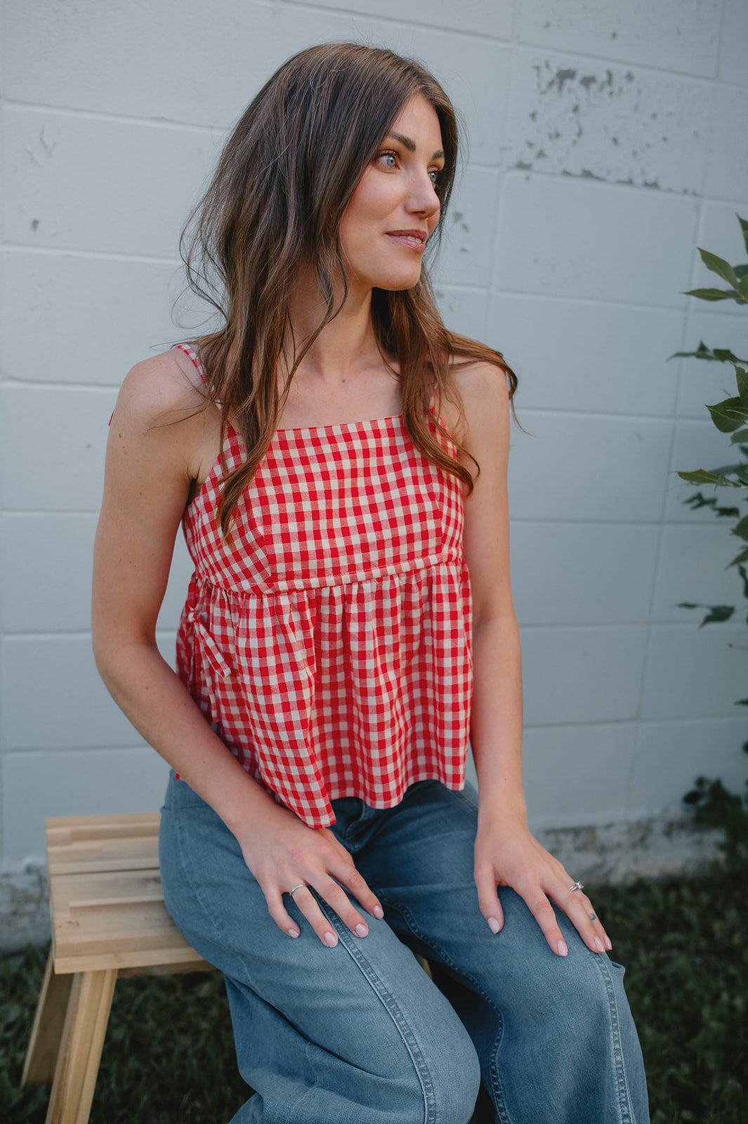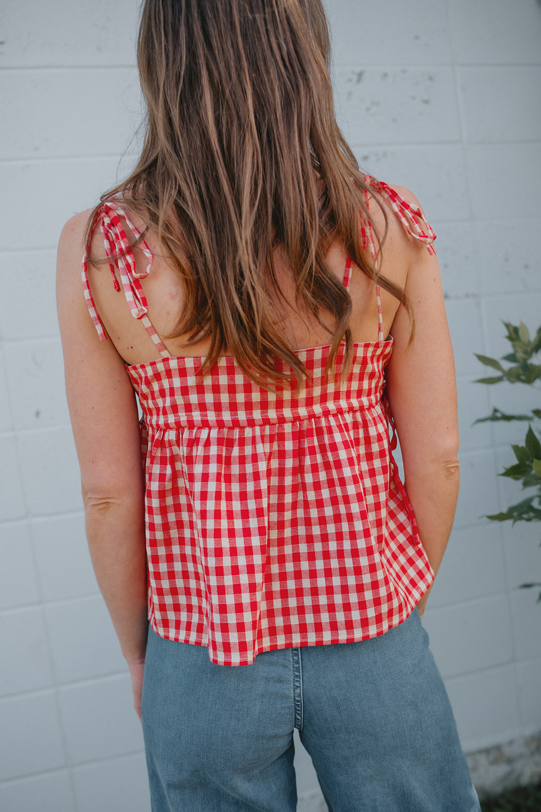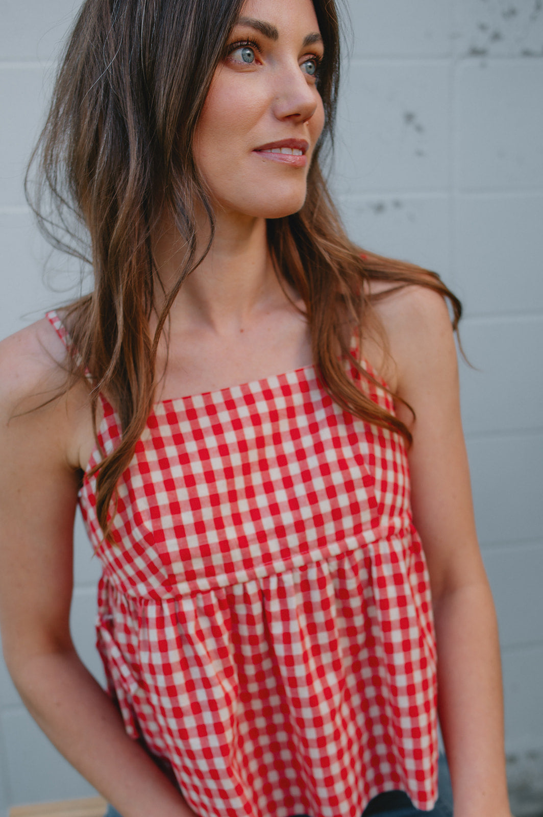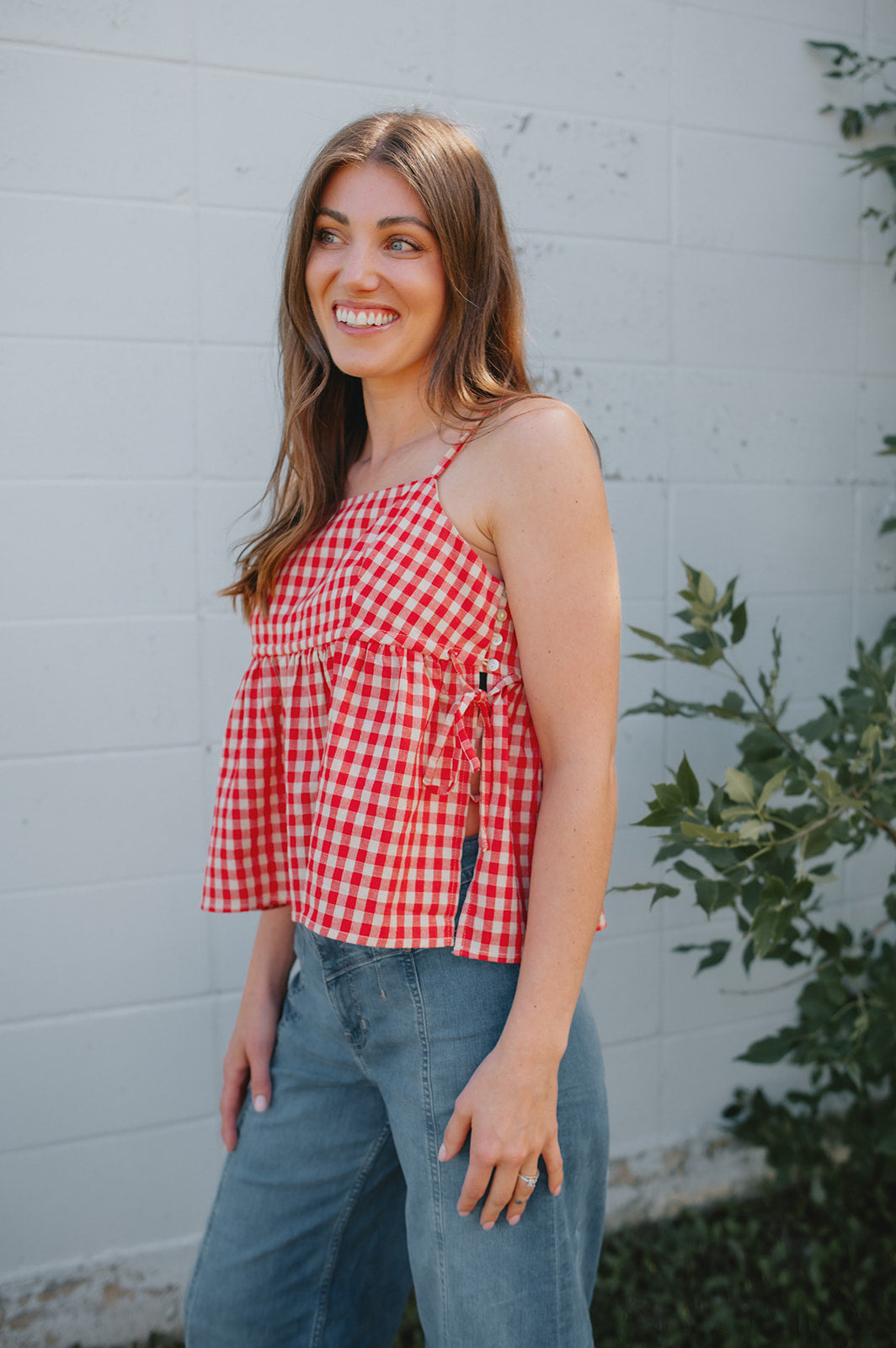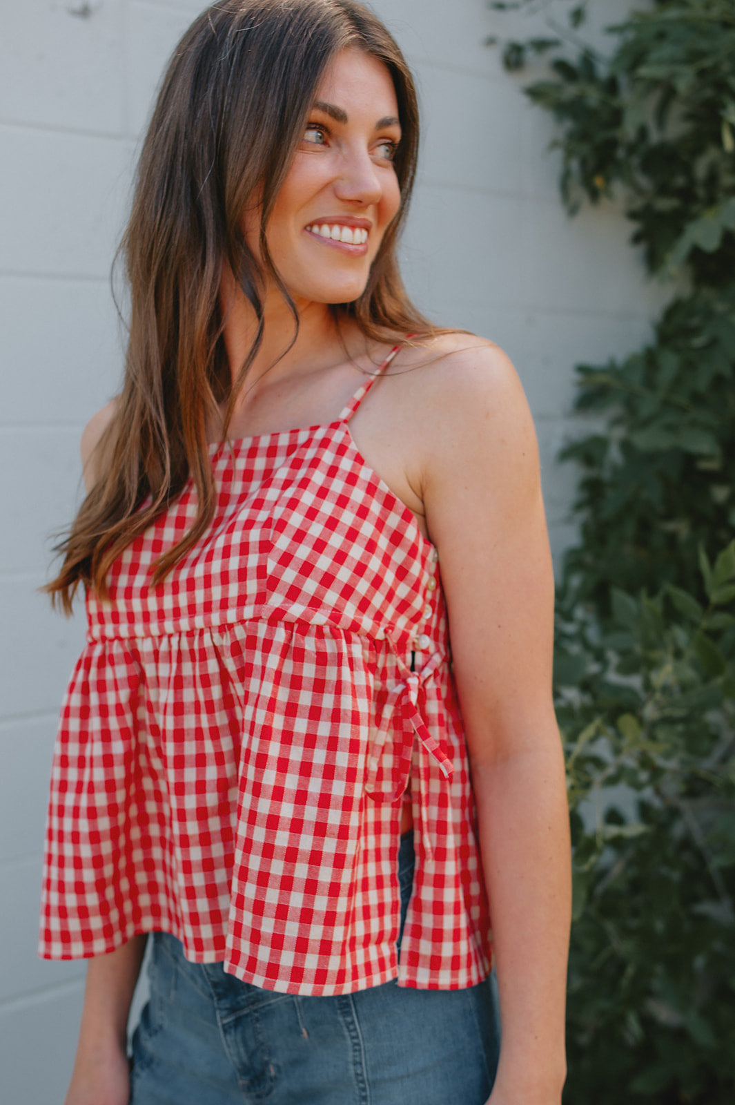 5'6Introducing the FRNCH Corentine Red Top, crafted with a gingham pattern for a touch of playful sophistication. The slim adjustable straps and knots on the sides create a flattering silhouette, while the ruffles on the chest add a delicate, feminine touch. Made with soft, flowing fabric for a luxurious feel. Elevate your style with this exclusive top.