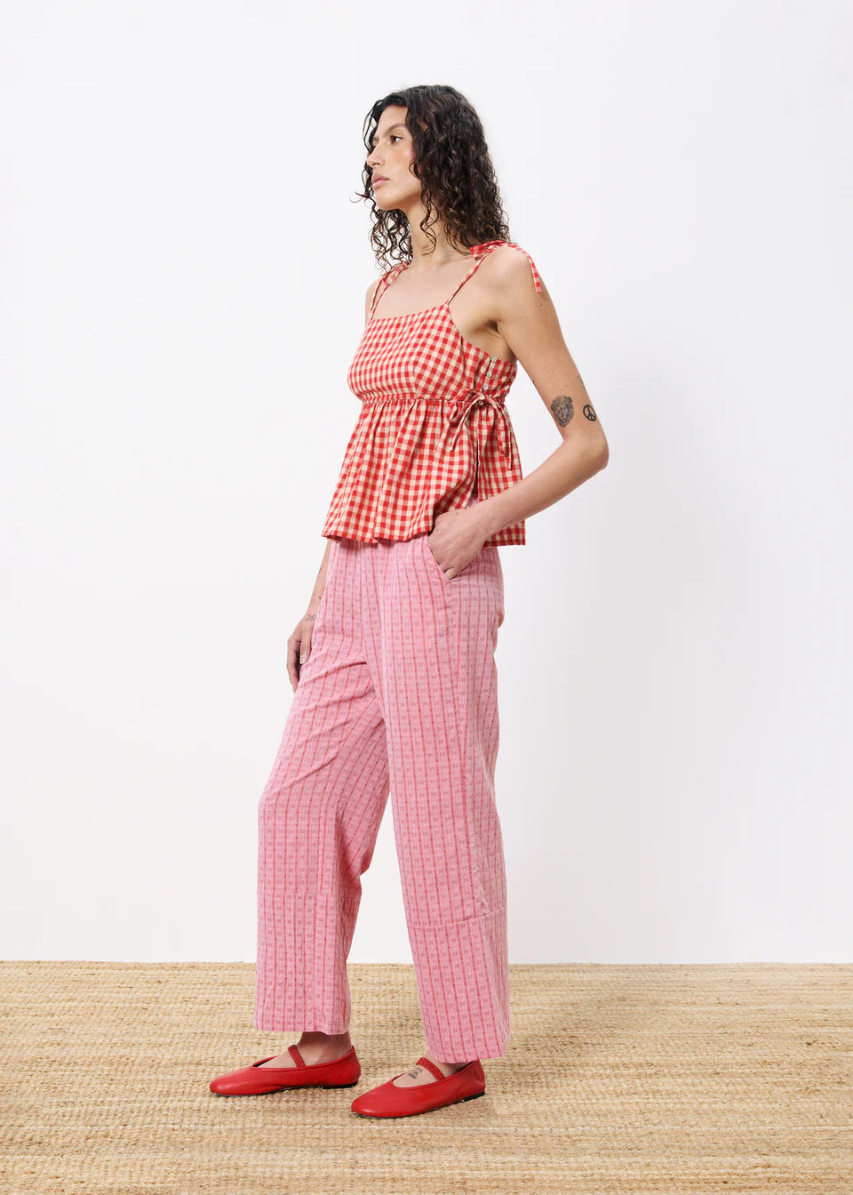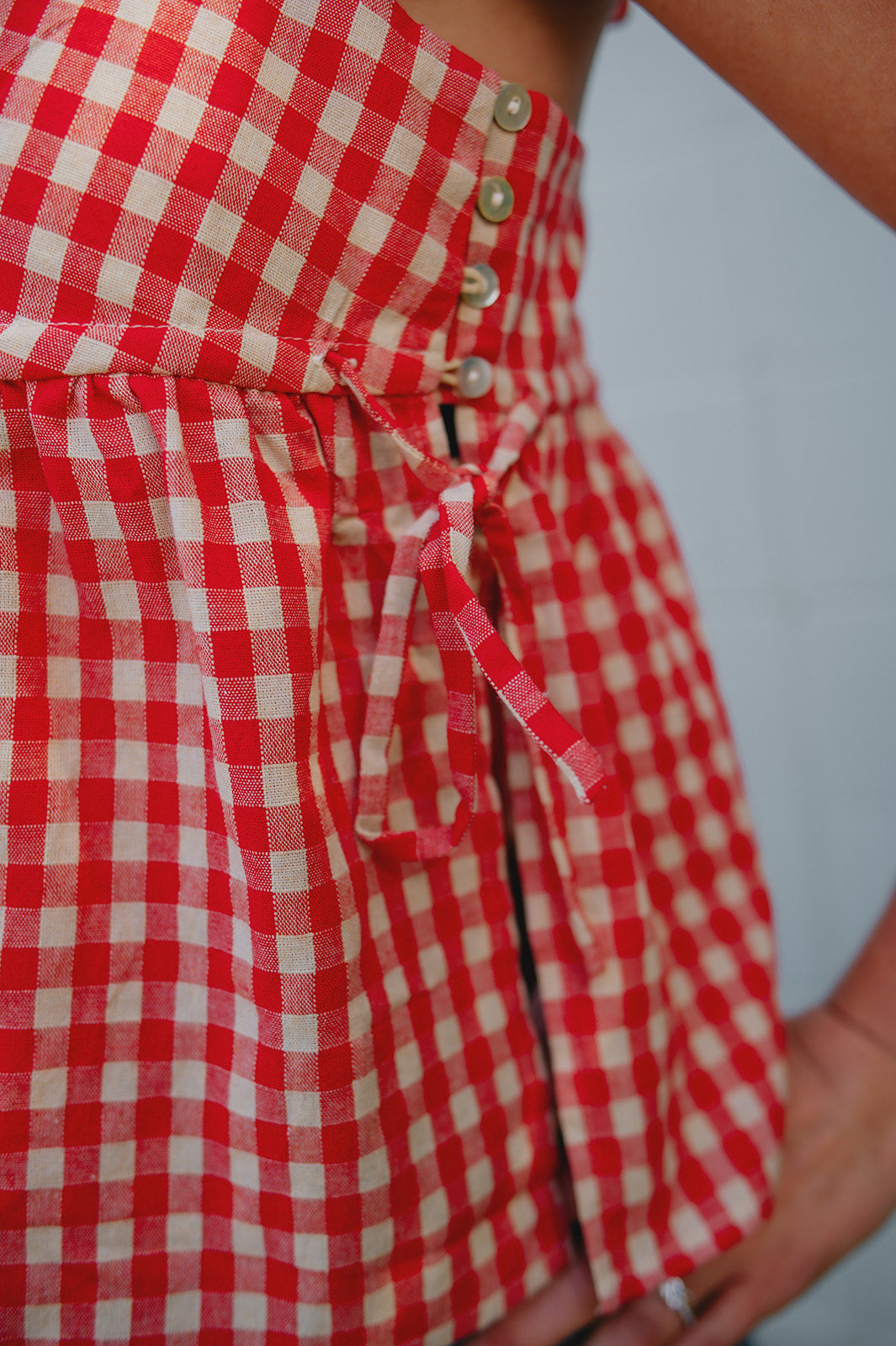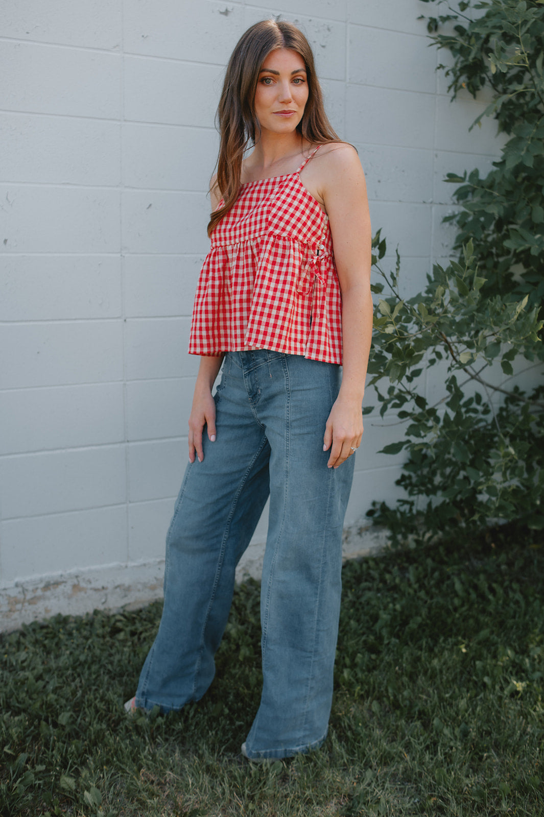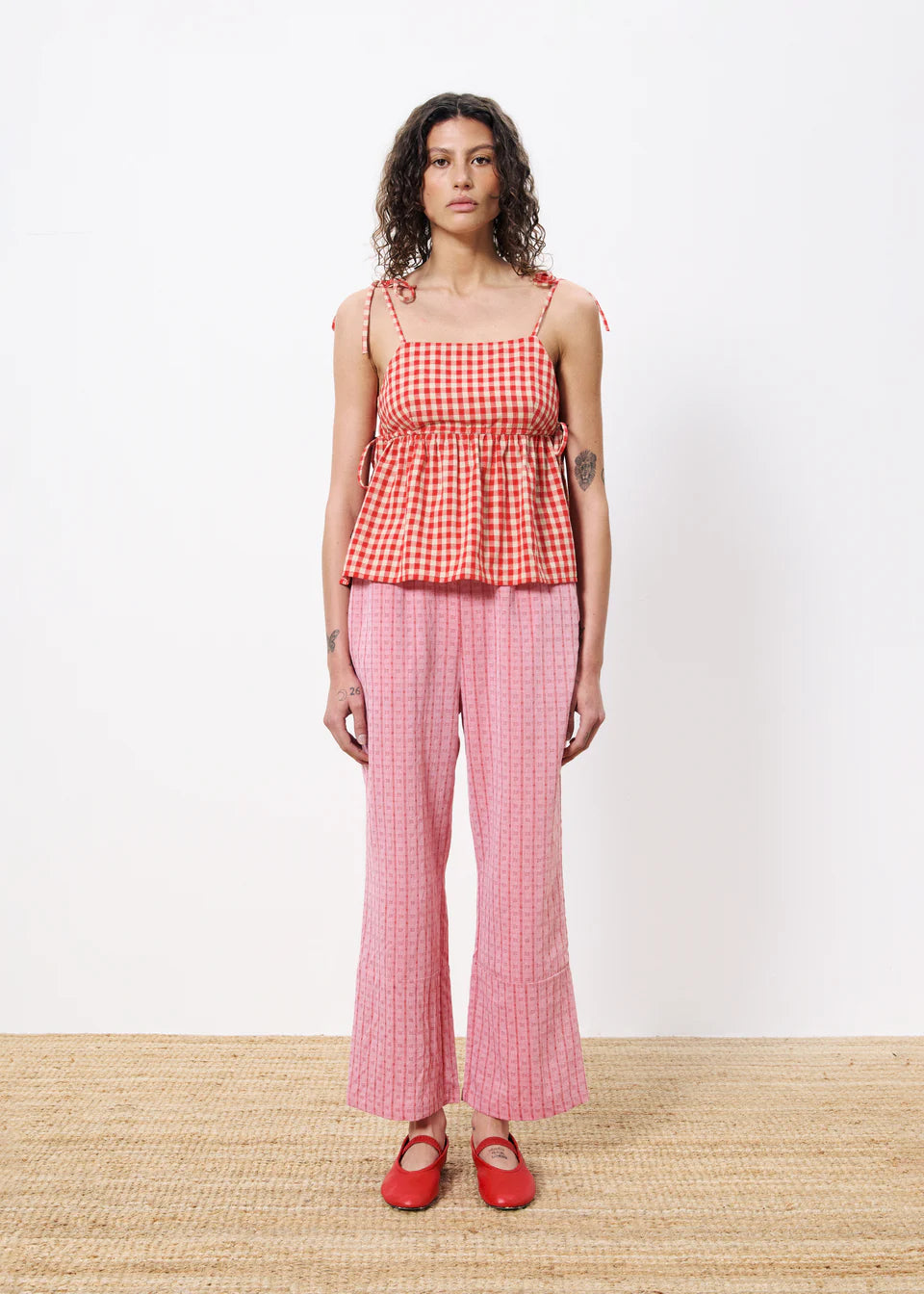 5'6Introducing the FRNCH Corentine Red Top, crafted with a gingham pattern for a touch of playful sophistication. The slim adjustable straps and knots on the sides create a flattering silhouette, while the ruffles on the chest add a delicate, feminine touch. Made with soft, flowing fabric for a luxurious feel. Elevate your style with this exclusive top.