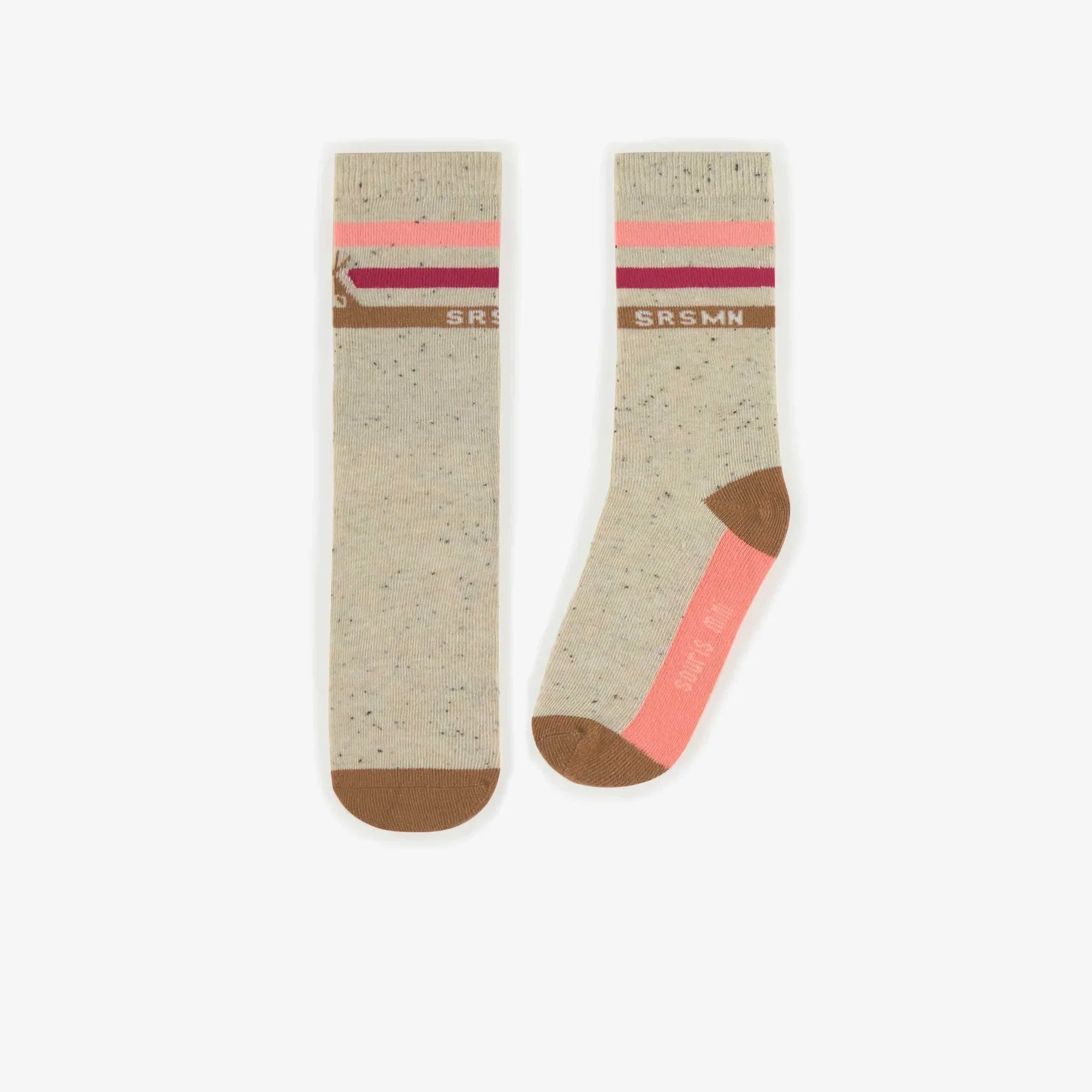 Child socks with pink stripes pattern at the calf made in a comfortable stretchy fabric. Calves are higher than normal.