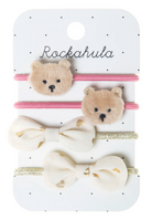 The pack of four ponies are the perfect way to add some sweetness to your day! Featuring two teddy bears made from the softest brown fur, with glitter nose and ear detailing, secured to dusky pink elastics. Two chiffon style ivory bows detailed with little gold foil hearts, secured to gold shimmering elastic complete the set!
