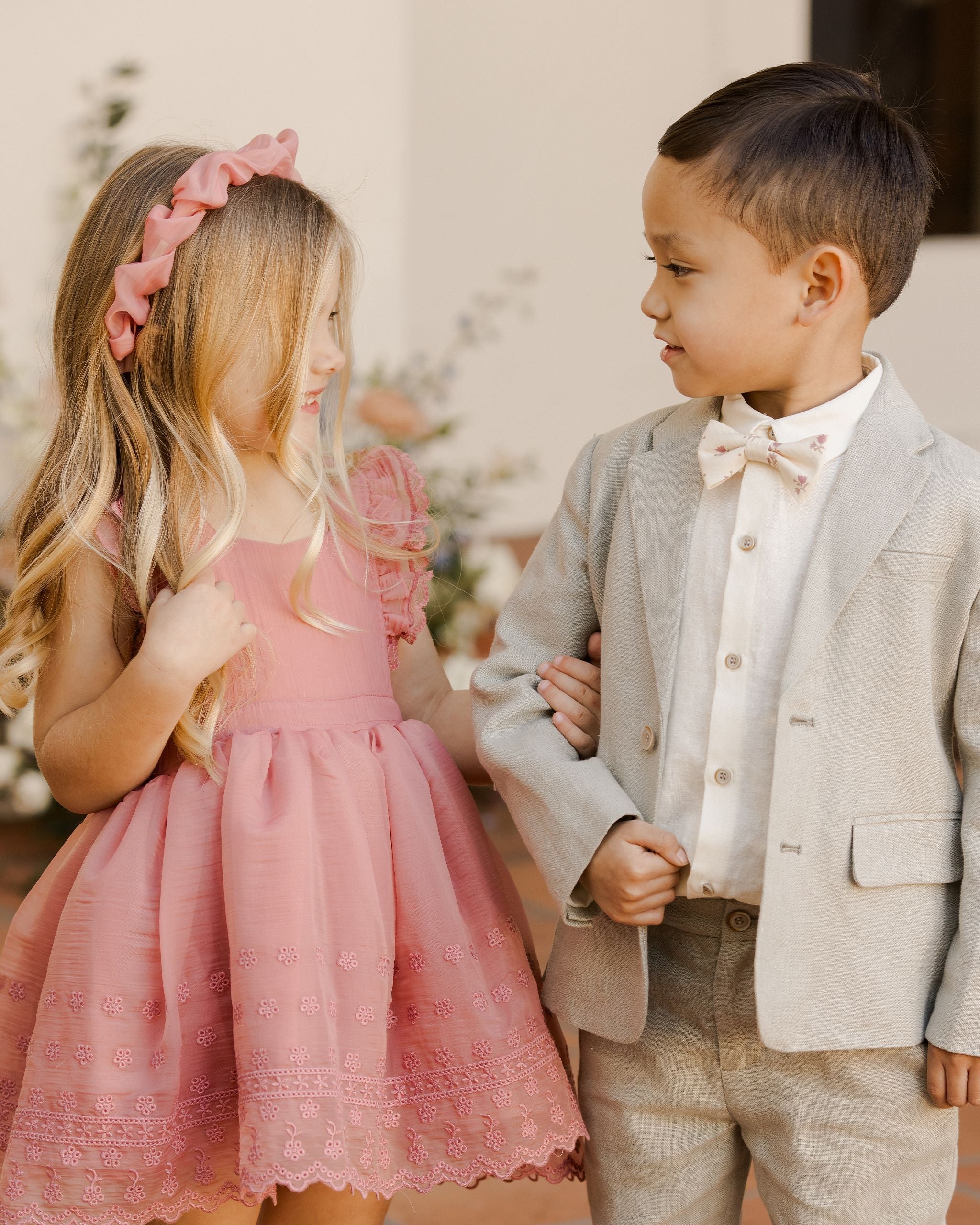 The perfect finishing touch for any little guy looking to get spruced up! Our bow tie features an attached loop for quick and easy wear. Featured in our 'rose ditsy' all over print on our 'ivory' hue.