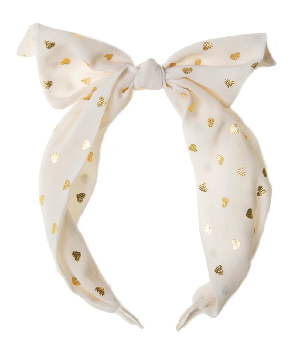 Made from chiffon ivory fabric, this headband is adorned with shimmering gold foil hearts! Featuring a hand tied top knot, it is designed to provide a comfortable fit for little heads.