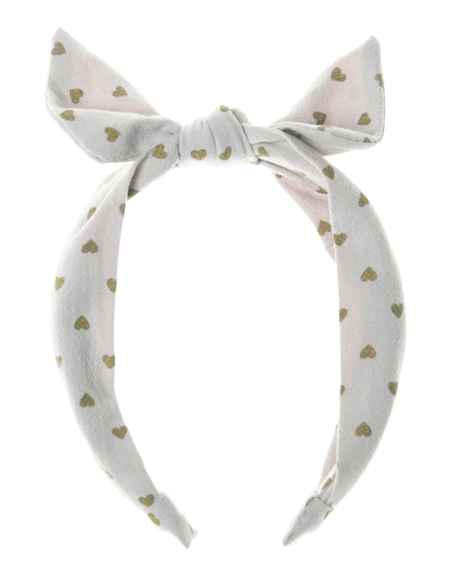This adorable headband features a hand tied top tie and is made from super soft scattered heart fabric. In a gorgeous muted grey with gold heart detailing, it's perfect for parties or everyday! All of Rockahula's headband's are designed to ensure a comfortable fit for little heads!