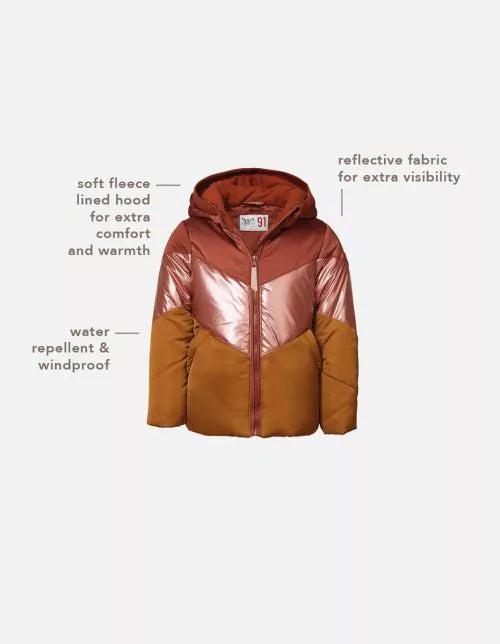 The Alachua coat boasts a playful look and will keep your little one beautifully warm this season! The coat has a fleece-lined hood for extra comfort. The coat is both water-repellent and windproof, so your little one will stay lovely and warm in case of any rainy or windy conditions. The elasticated hem and sleeve cuffs will also provide effective protection against the wind and cold. There is a zip stopper at the top of the zip. The logo at the bottom of the back is reflective. This will increase your child’s visibility in the dark. A comforting thought.