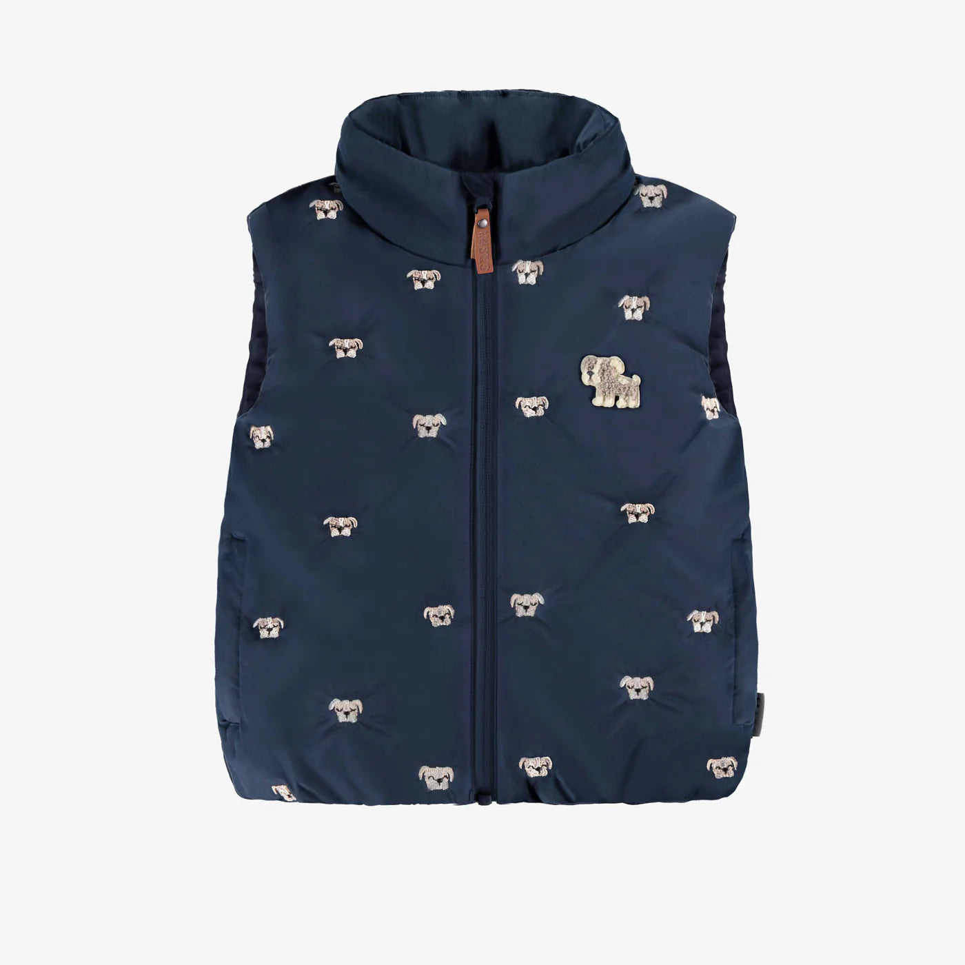 Sleeveless puffer vest, perfect for cooler days. Features a high collar, zipper closure, and an elastic hem for a better fit. We love the embroidered little dogs for an extra touch of charm!