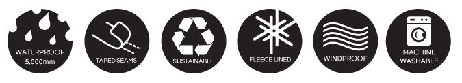 Outer: 5,000mm Waterproof & Windproof 100% Recycled rPET Bedford Shell with SplashMagic Print + taped seams to prevent leaks