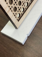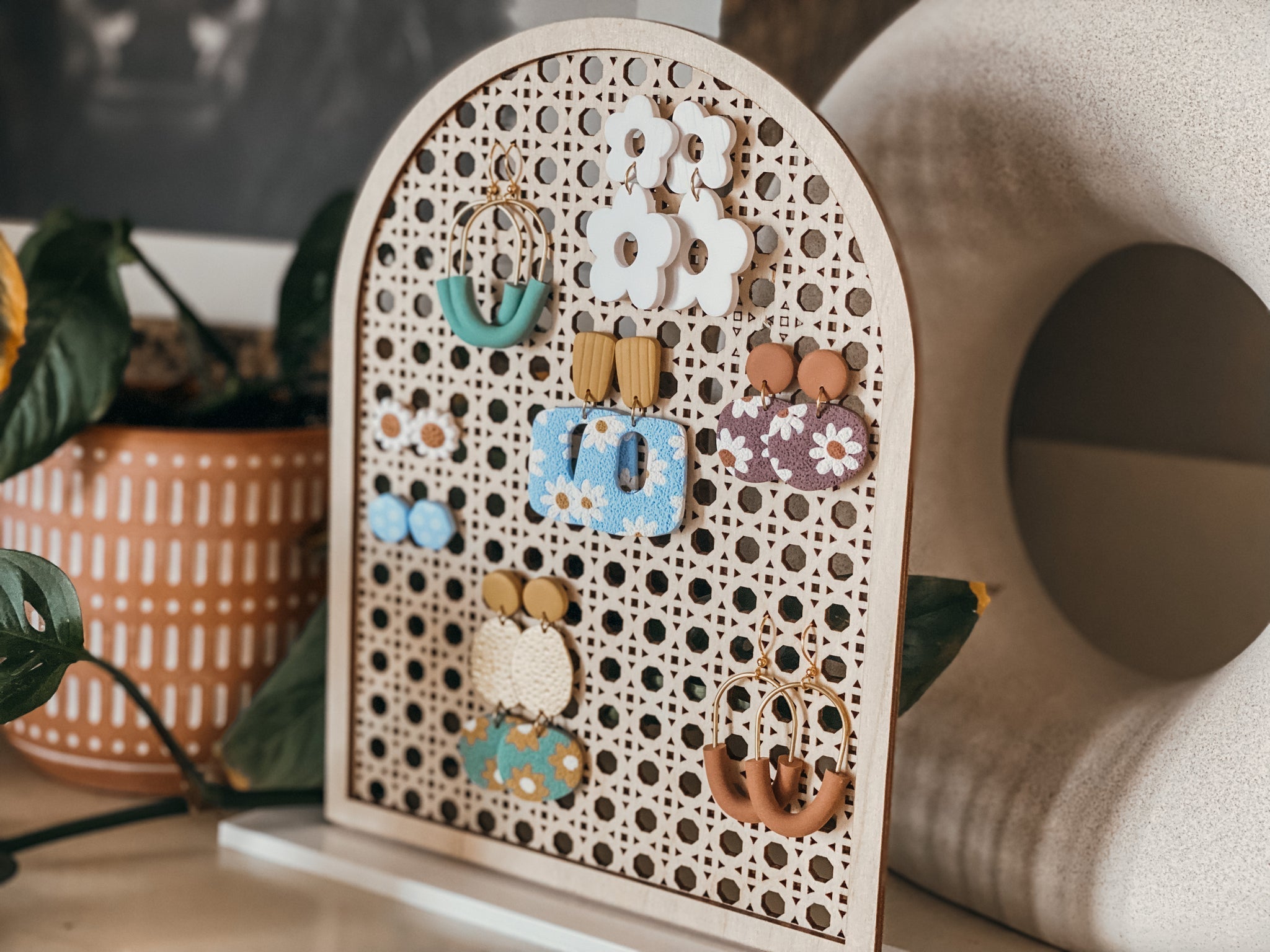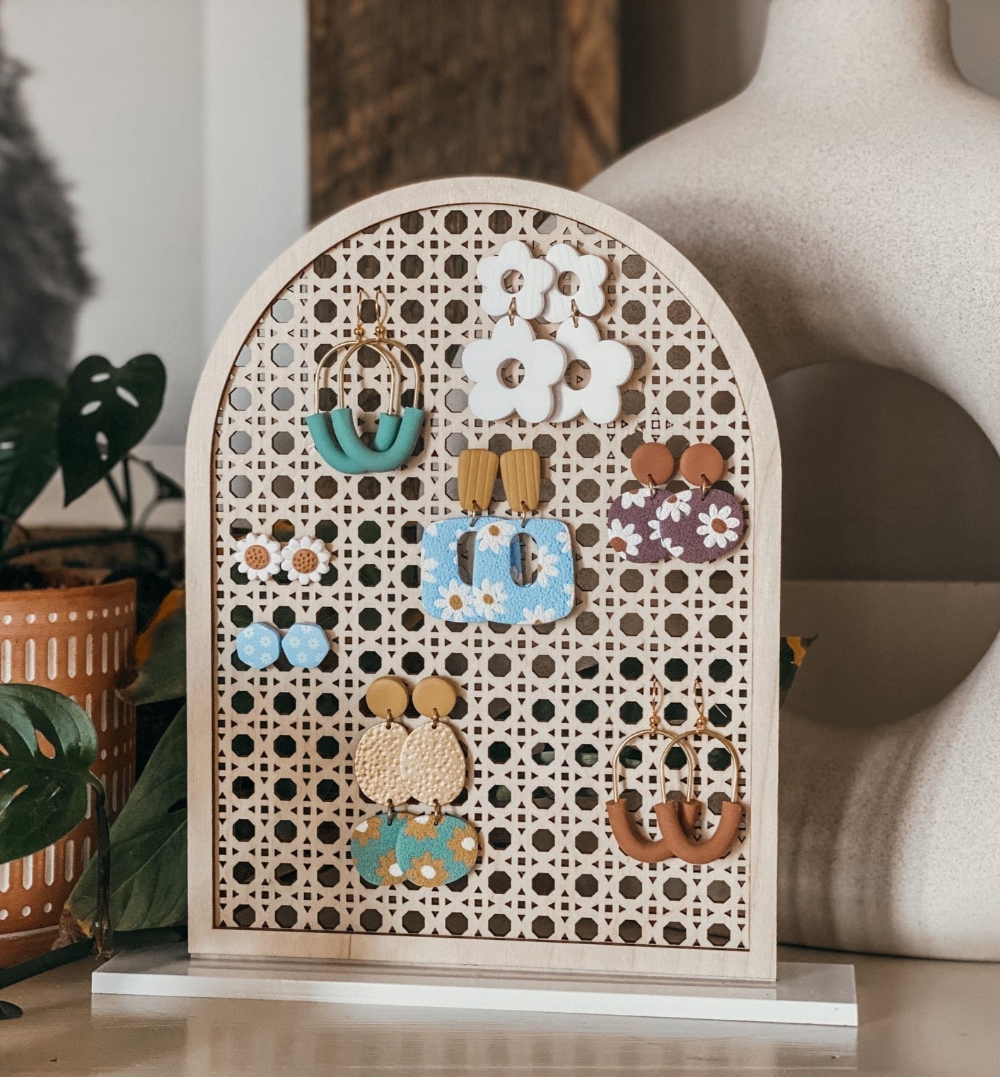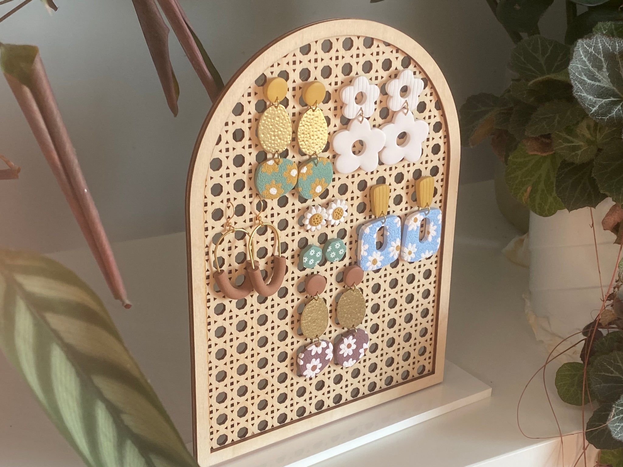 Looks like rattan, but is handmade from Baltic birch wood. This earring stand is made to go on a dresser or shelf - but could be hung if you want to as well. Comes with a desk stand that is laser cut from white acrylic. Very lightweight and trendy!