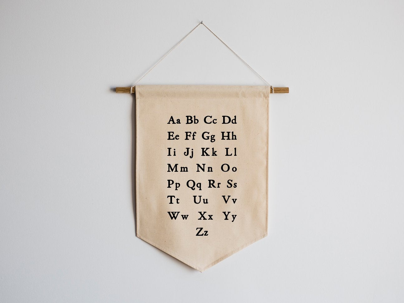 This modern banner is a lovely mix of neutral, natural materials - including canvas, oak wood, and cotton twine - with all materials sourced in the United States, sewn locally, and printed in-house by hand. A lovely reminder for any home's living room or play area!