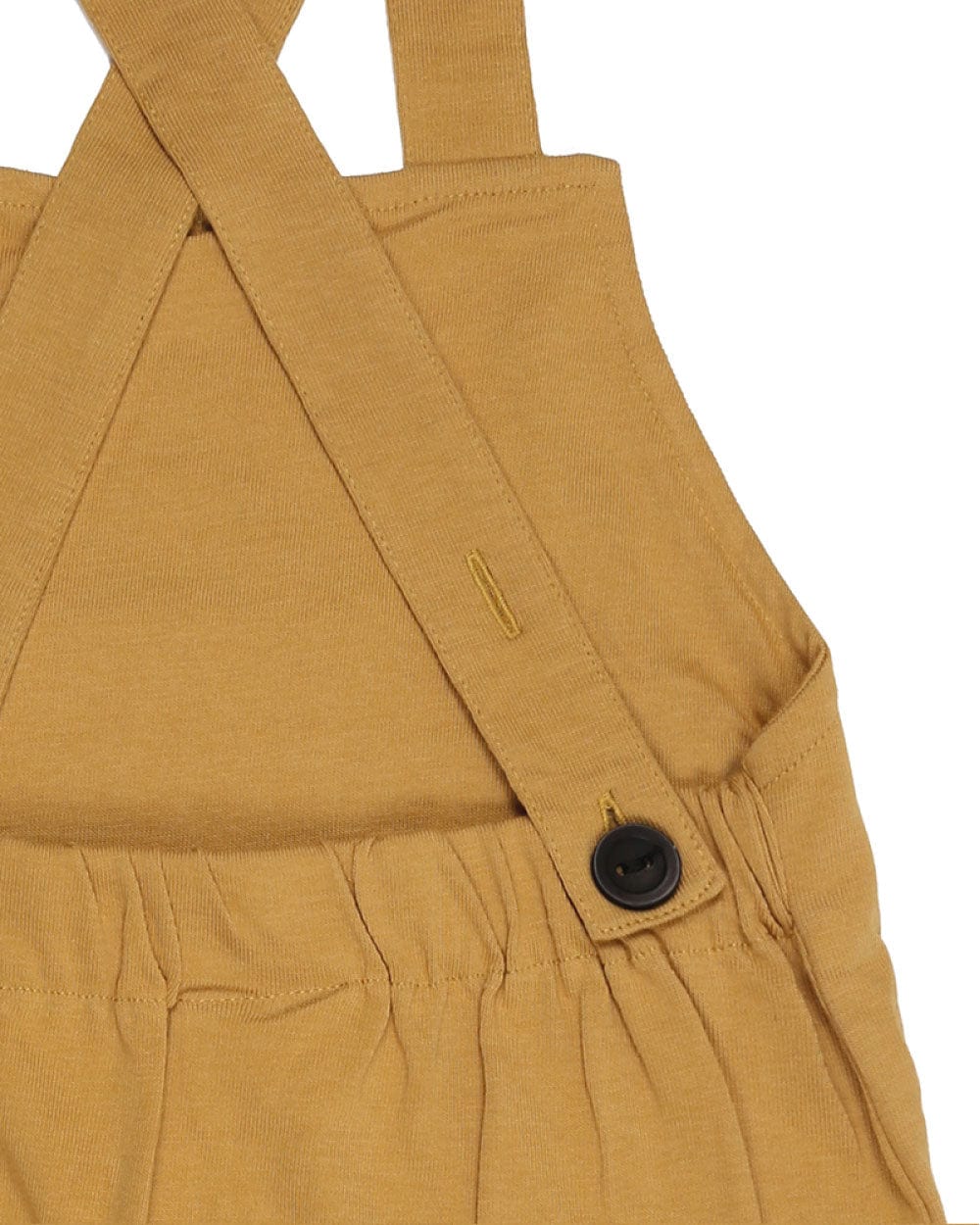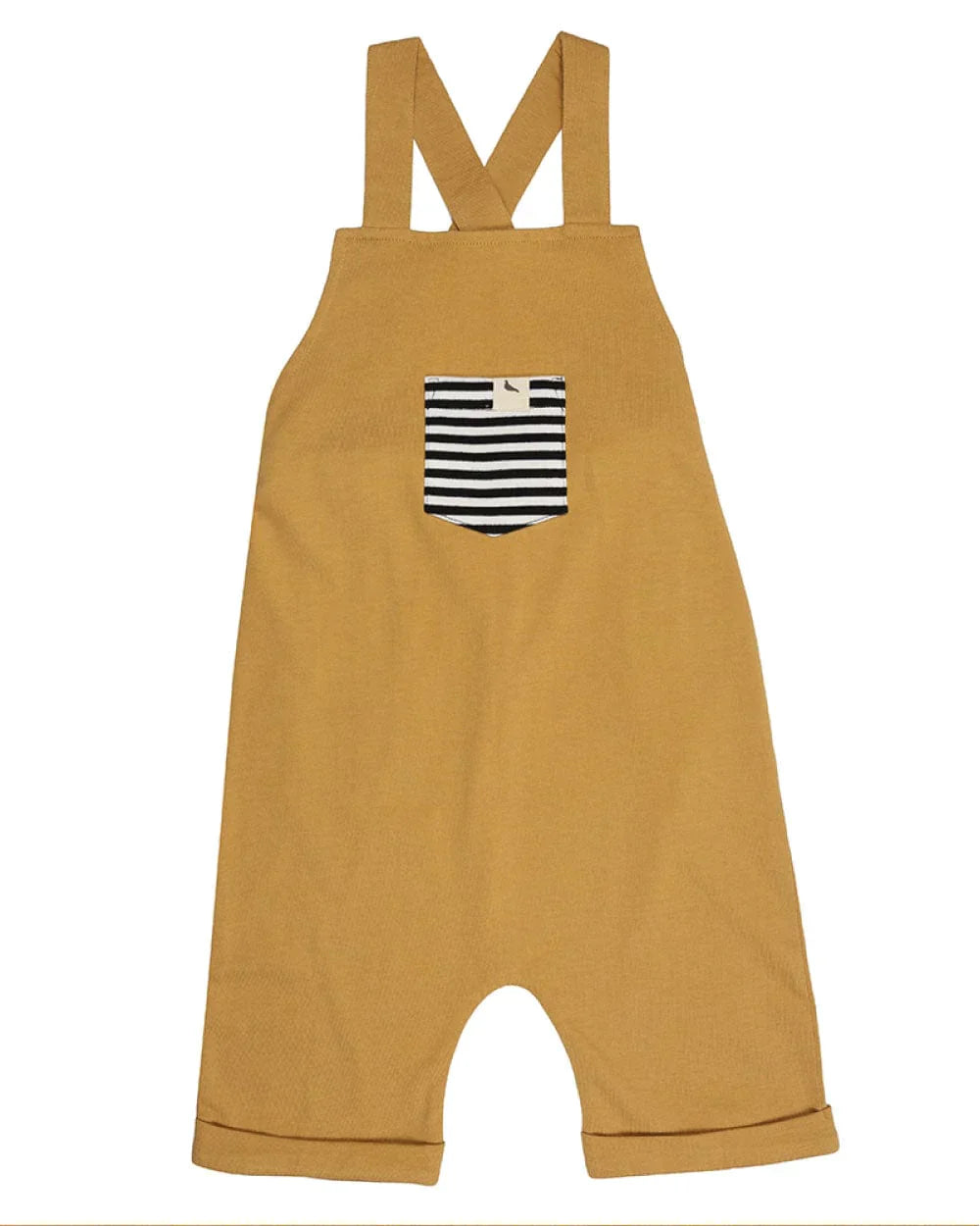 Our best selling organic cotton dungarees but with a short leg version for summer dressing! The relaxed fit shape has a dropped crotch and wider seat for a comfort fit. The straps fasten to a lower cut back and can be adjusted to two button positions for extra growing room. These sunny coloured dungarees look great worn back with one of our tops for cooler days too. Contrast monochrome stripe pocket to chest and button fastening straps for easy dressing.