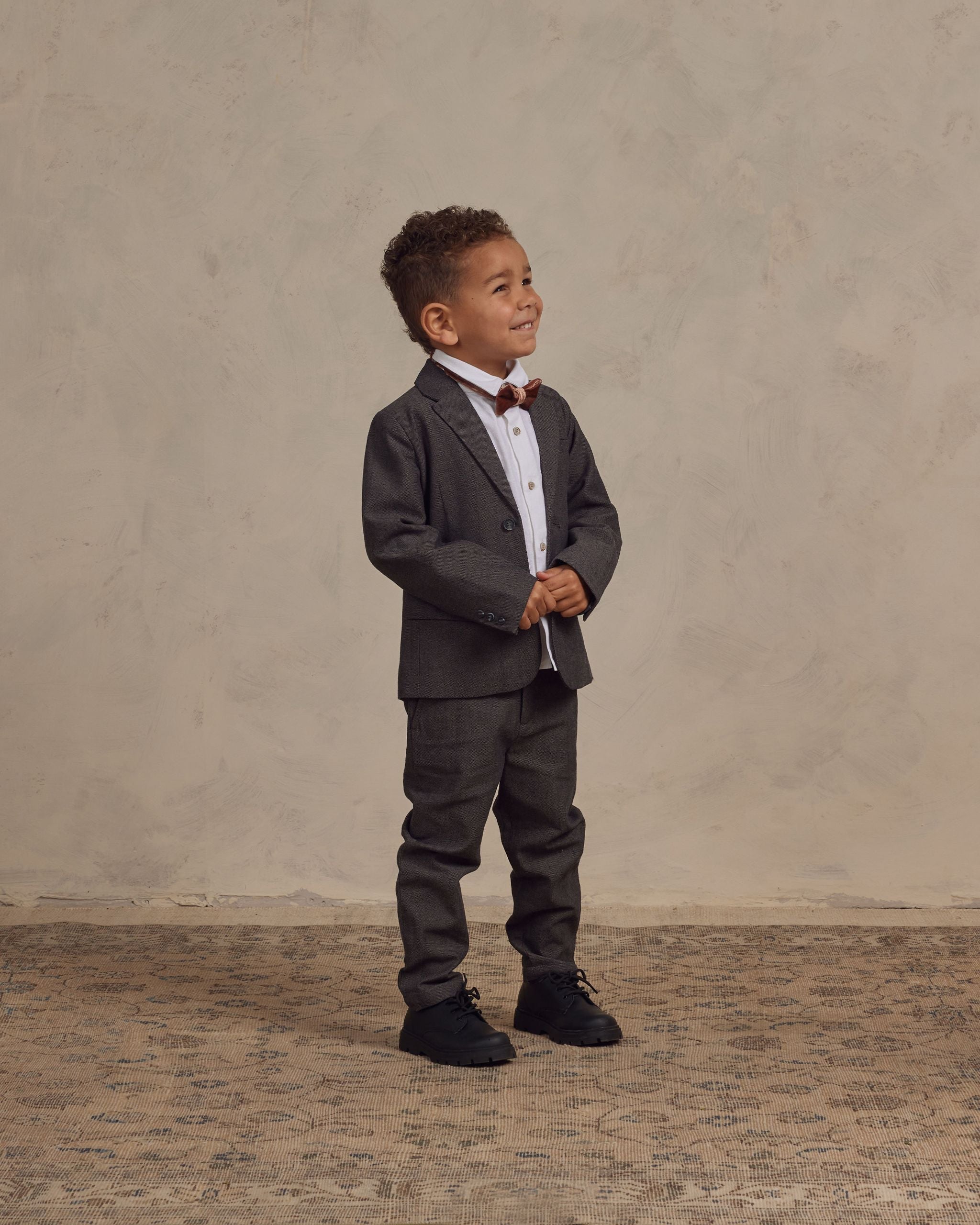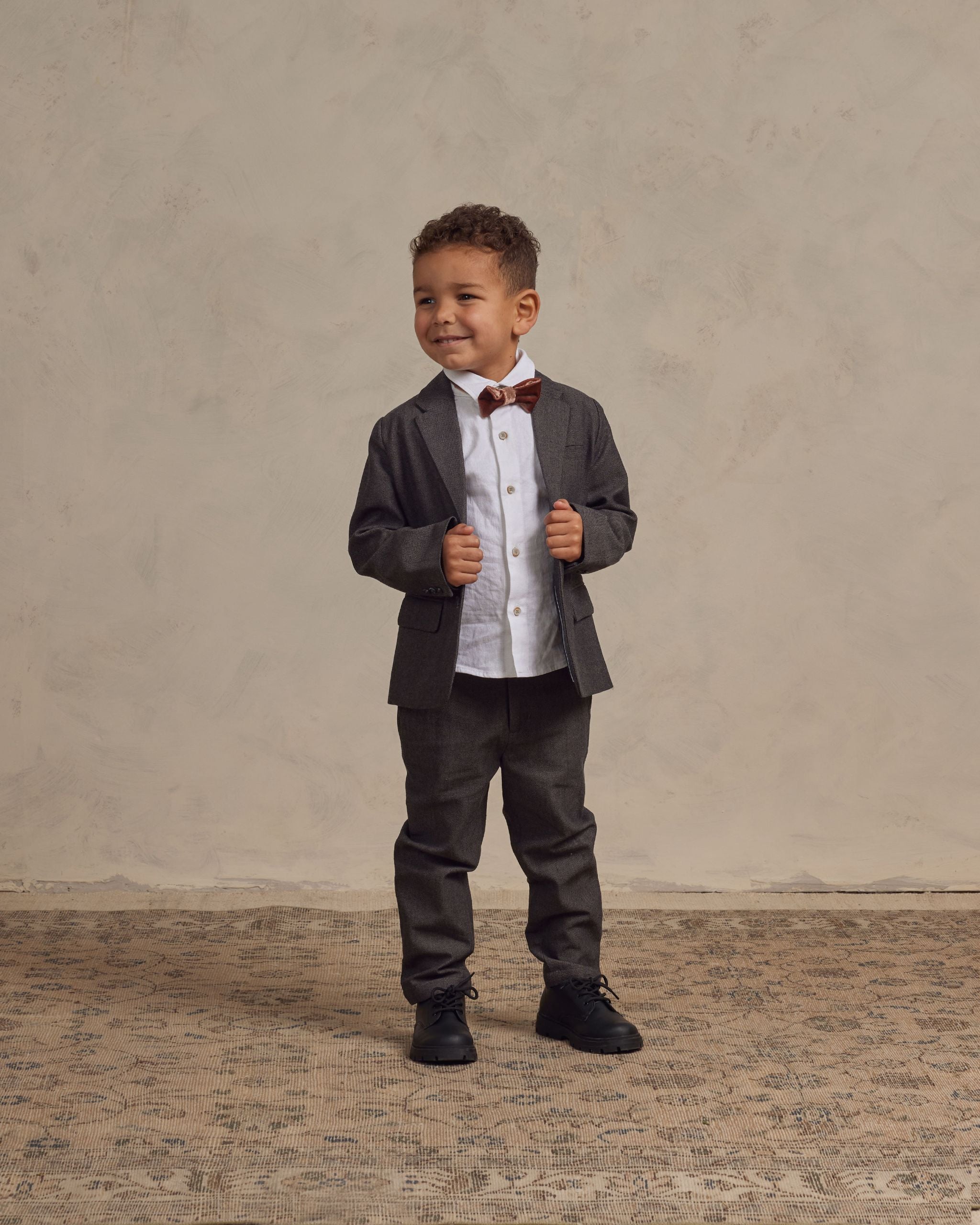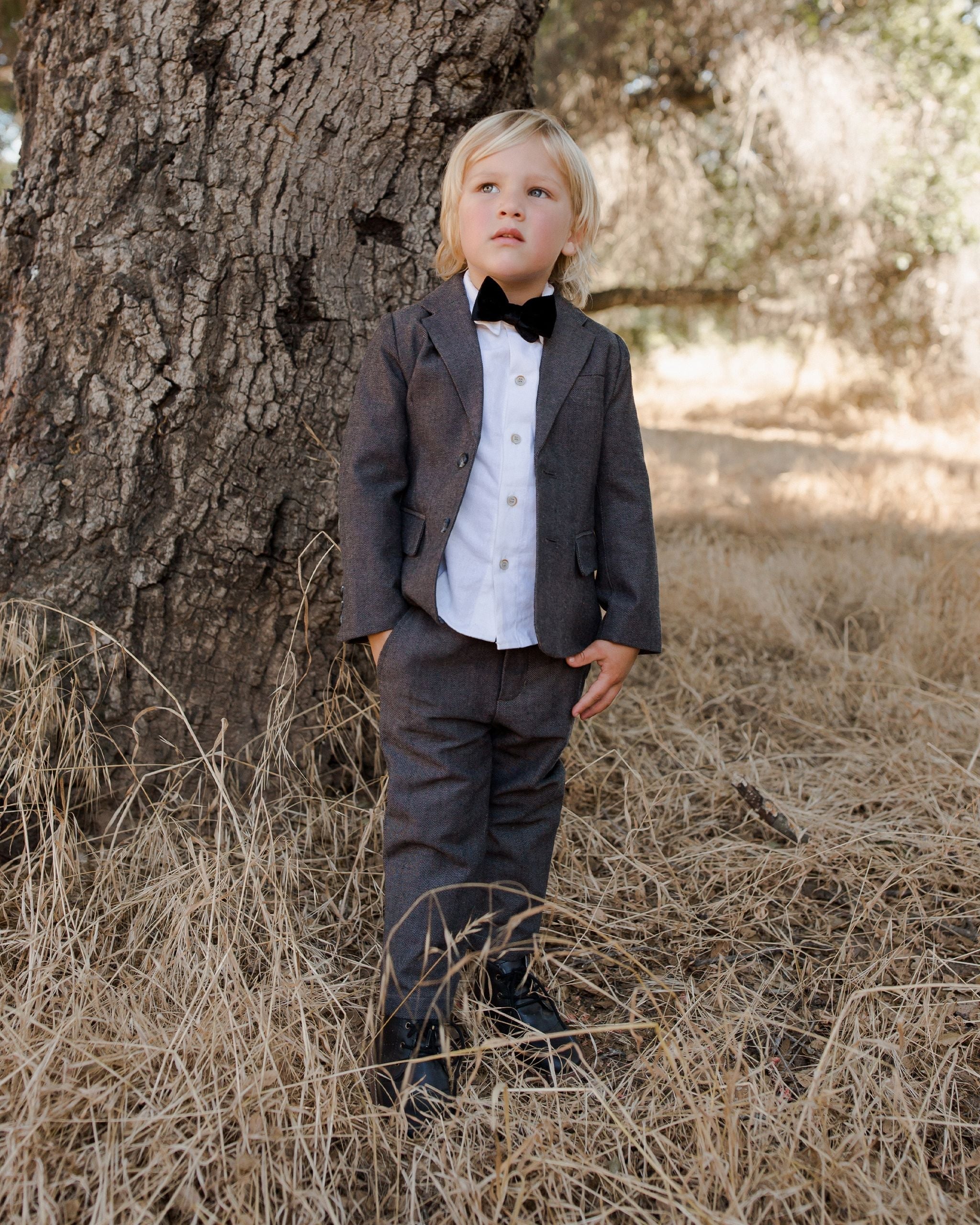 Our Sebastian Pant features tailored details made of soft textured cotton melange fabric. Pants include an adjustable elasticized waistband, zip fly with tonal wood buttons, and pockets. Wear it as a separate or better yet, suit up with the matching blazer and tie. Featured in our 'heathered black' hue.