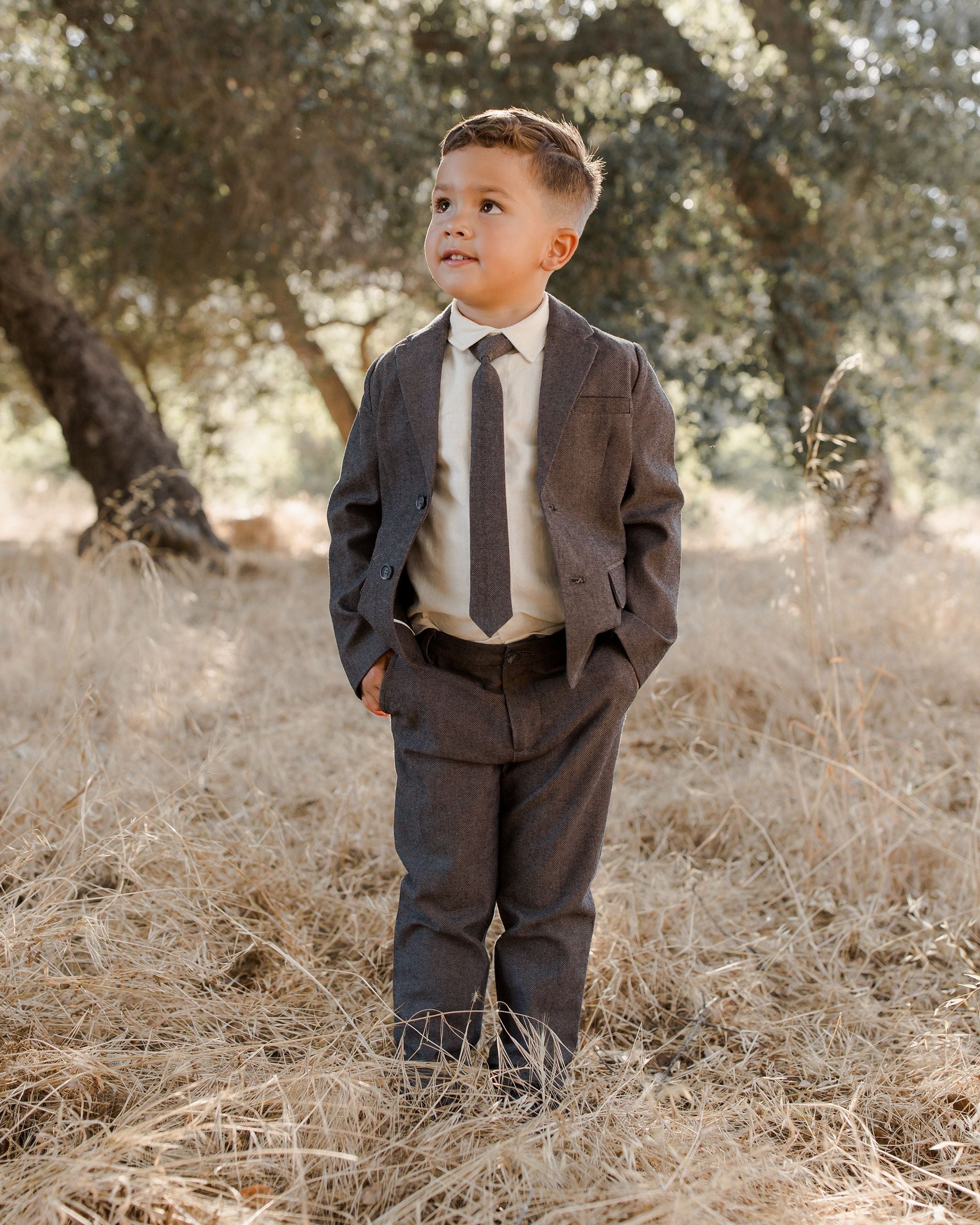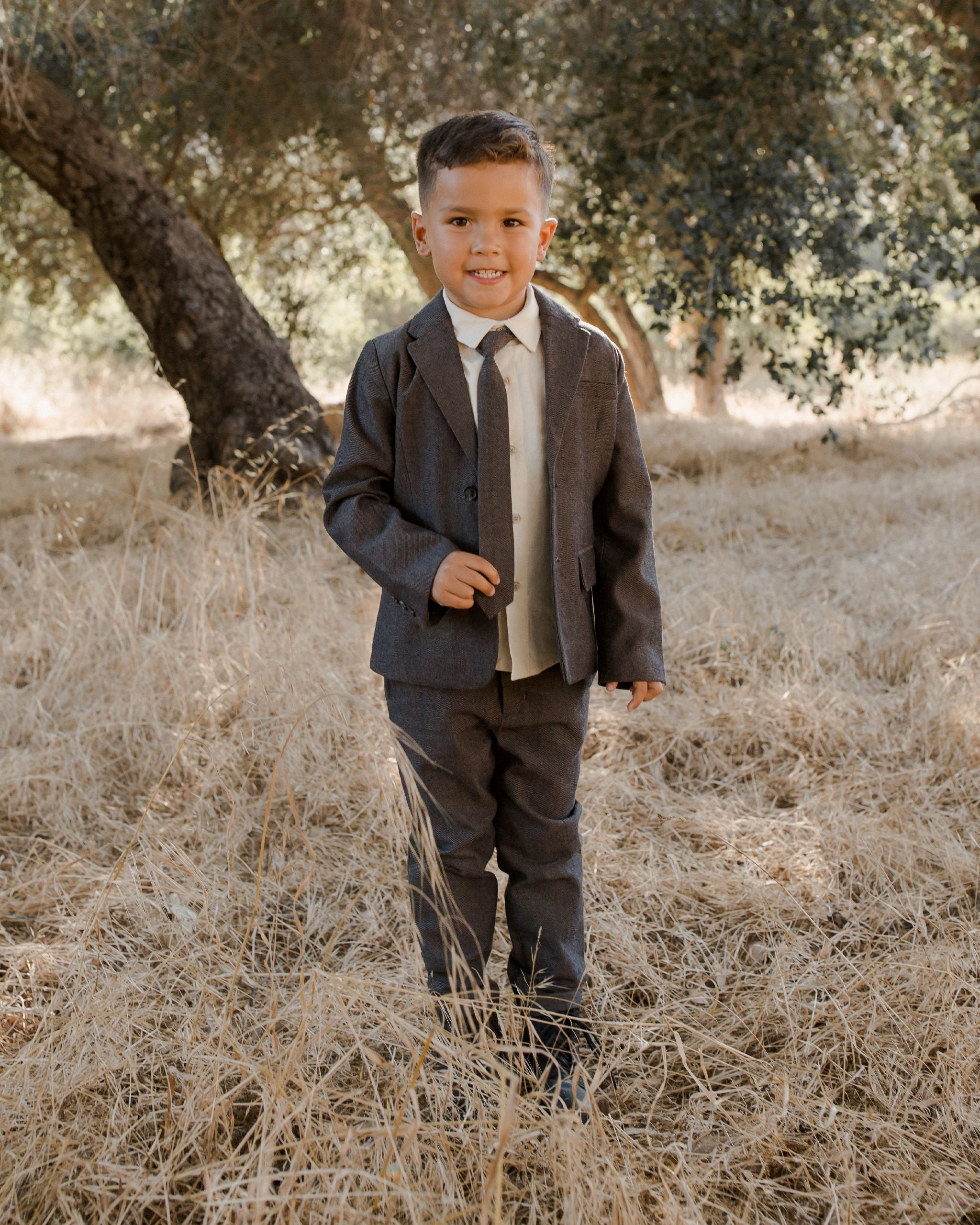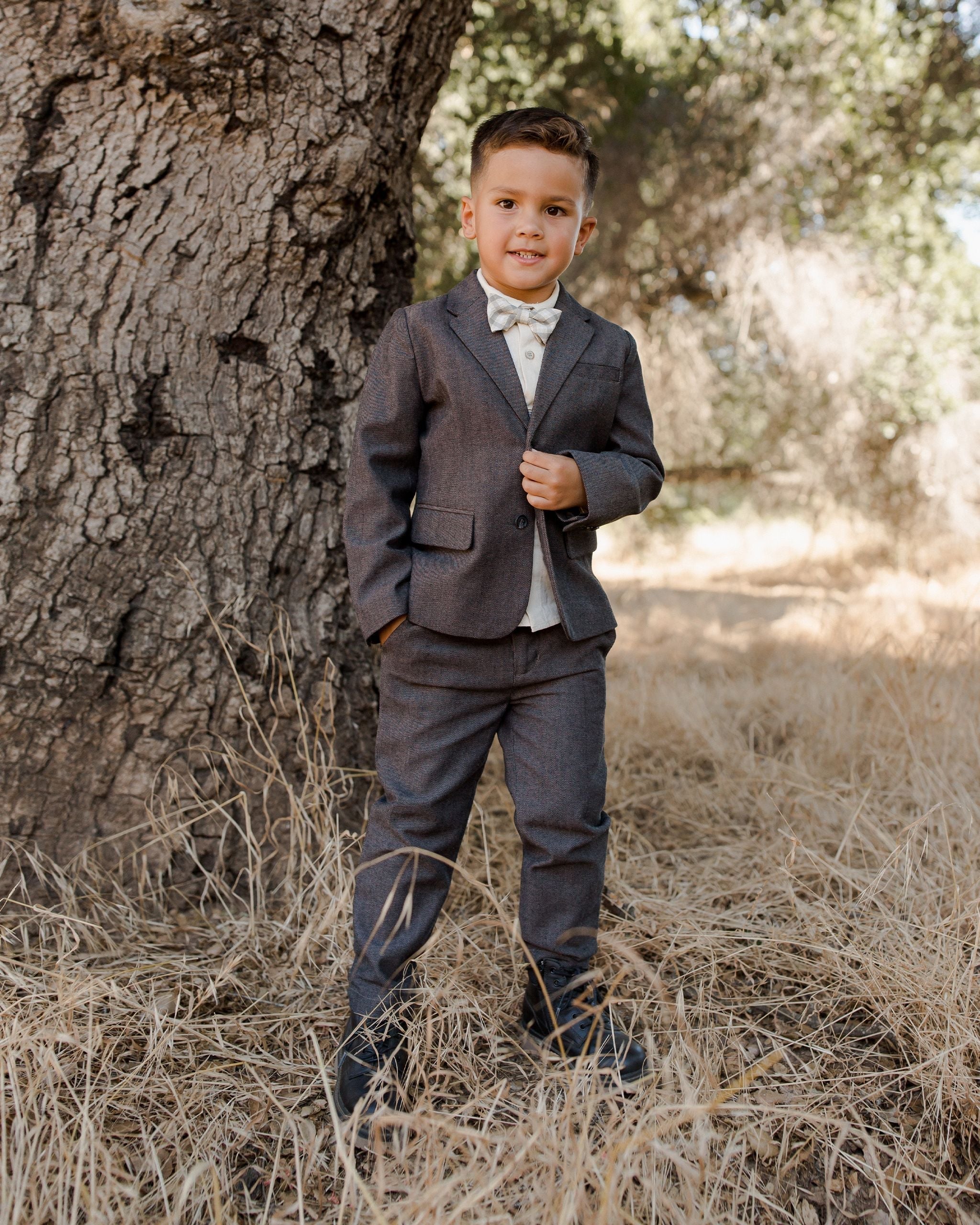 Our Sebastian Pant features tailored details made of soft textured cotton melange fabric. Pants include an adjustable elasticized waistband, zip fly with tonal wood buttons, and pockets. Wear it as a separate or better yet, suit up with the matching blazer and tie. Featured in our 'heathered black' hue.