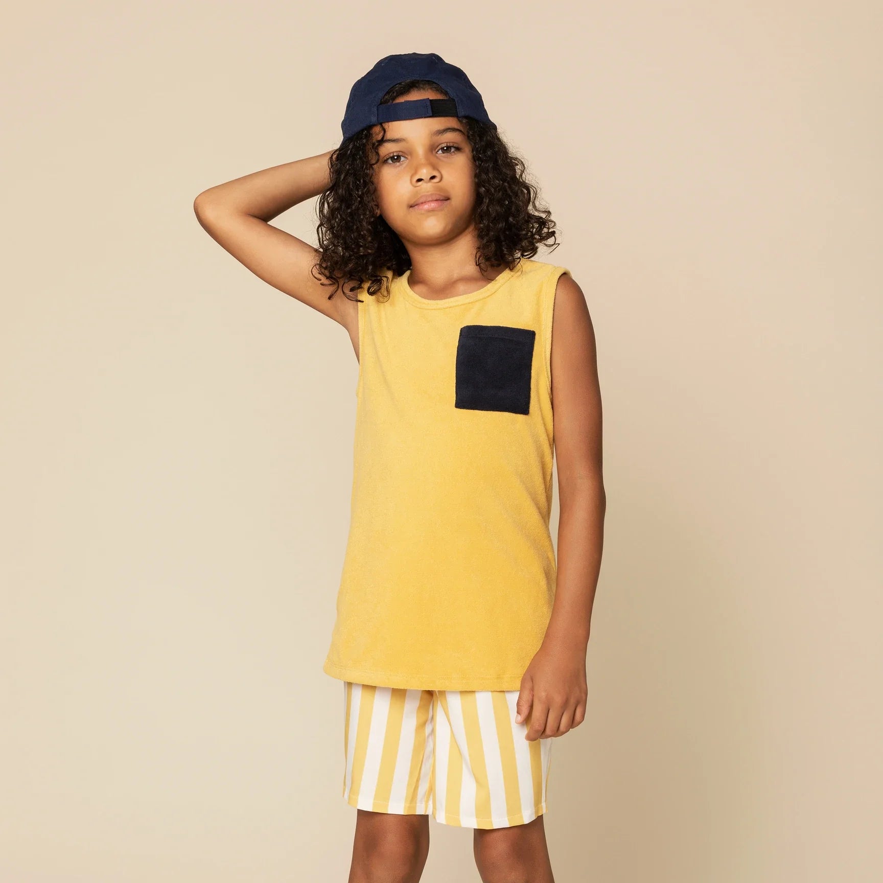 These stripey swim trunks are comfortable and cool. The 4-way stretch trunks are made with recycled polyester so they’re casual, cool and conscious. The elasticated, drawstring waistband makes the trunks super easy to wear and change into when hitting the waves. This is our first ever swim collection, and all pieces come built-in with UPF50+ sun protection.