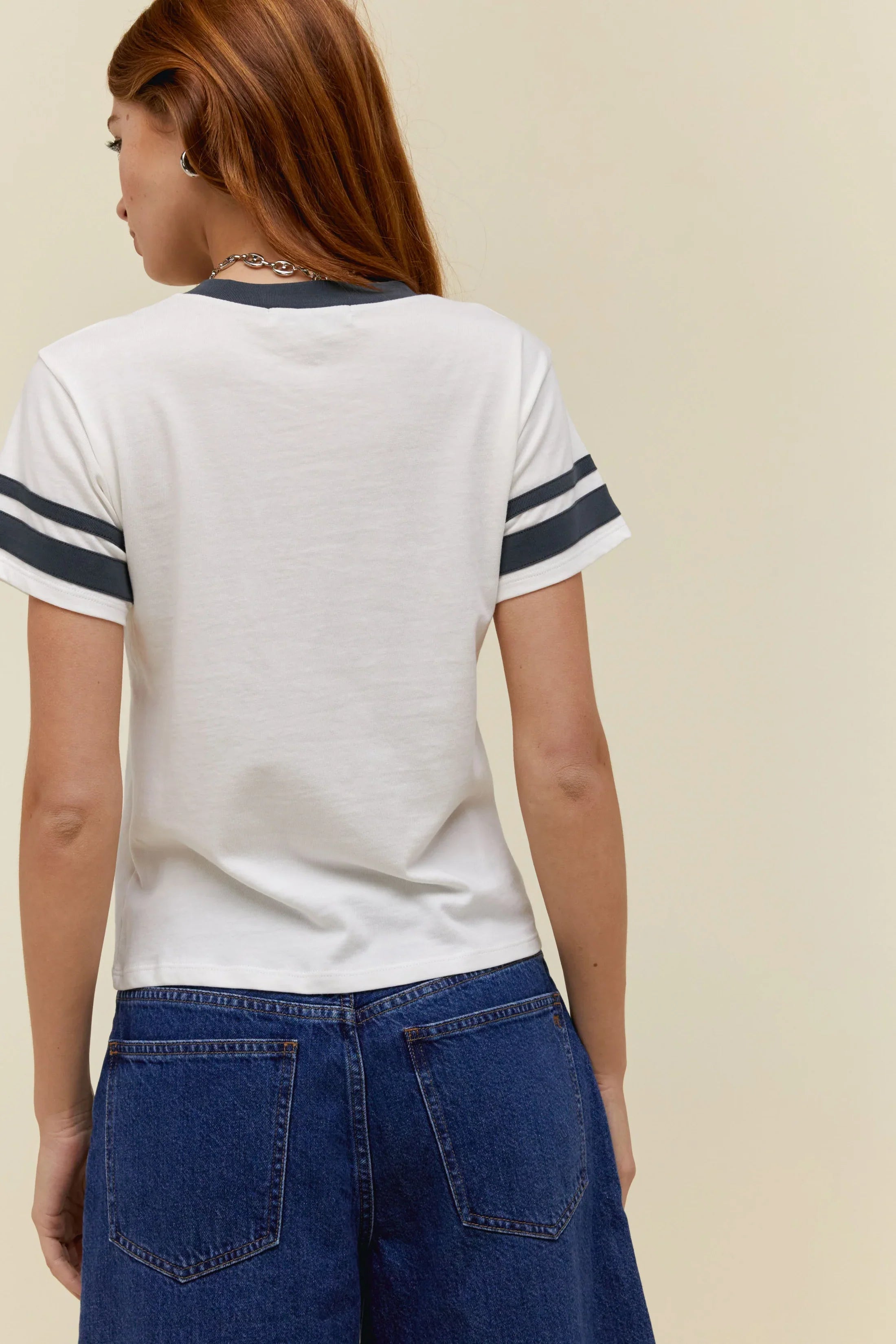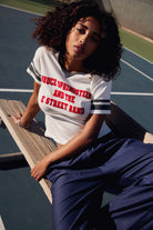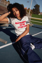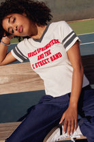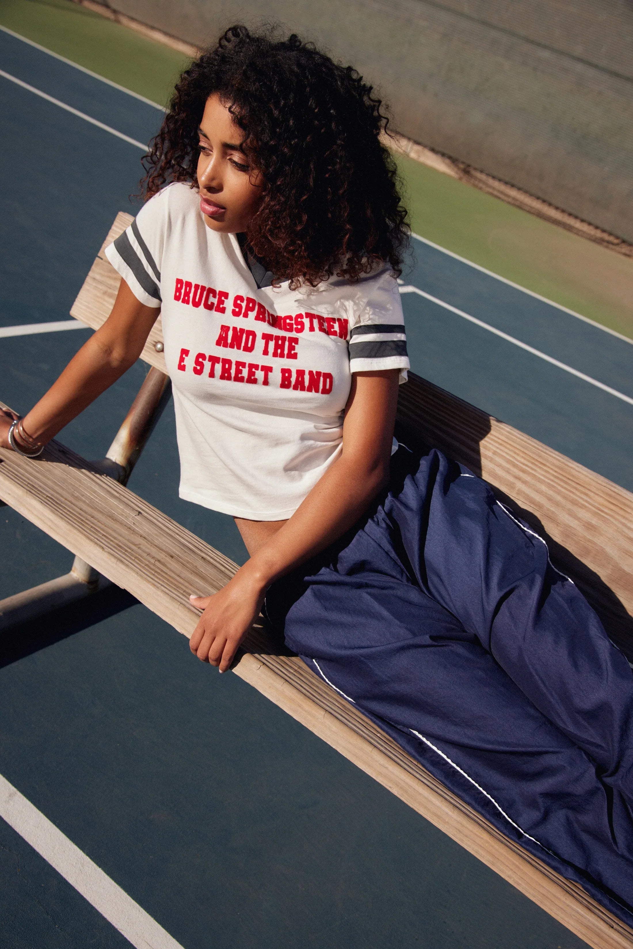 Pay homage to the voice of the working class and one of the most iconic artists in music history in an Americana inspired sporty tee featuring colourblocked details and collegiate striped sleeves. Bruce Springsteen and the E Street Band lands centre chest in red flocking designed on the essence of a vintage tee in a heavier loose knit cotton.